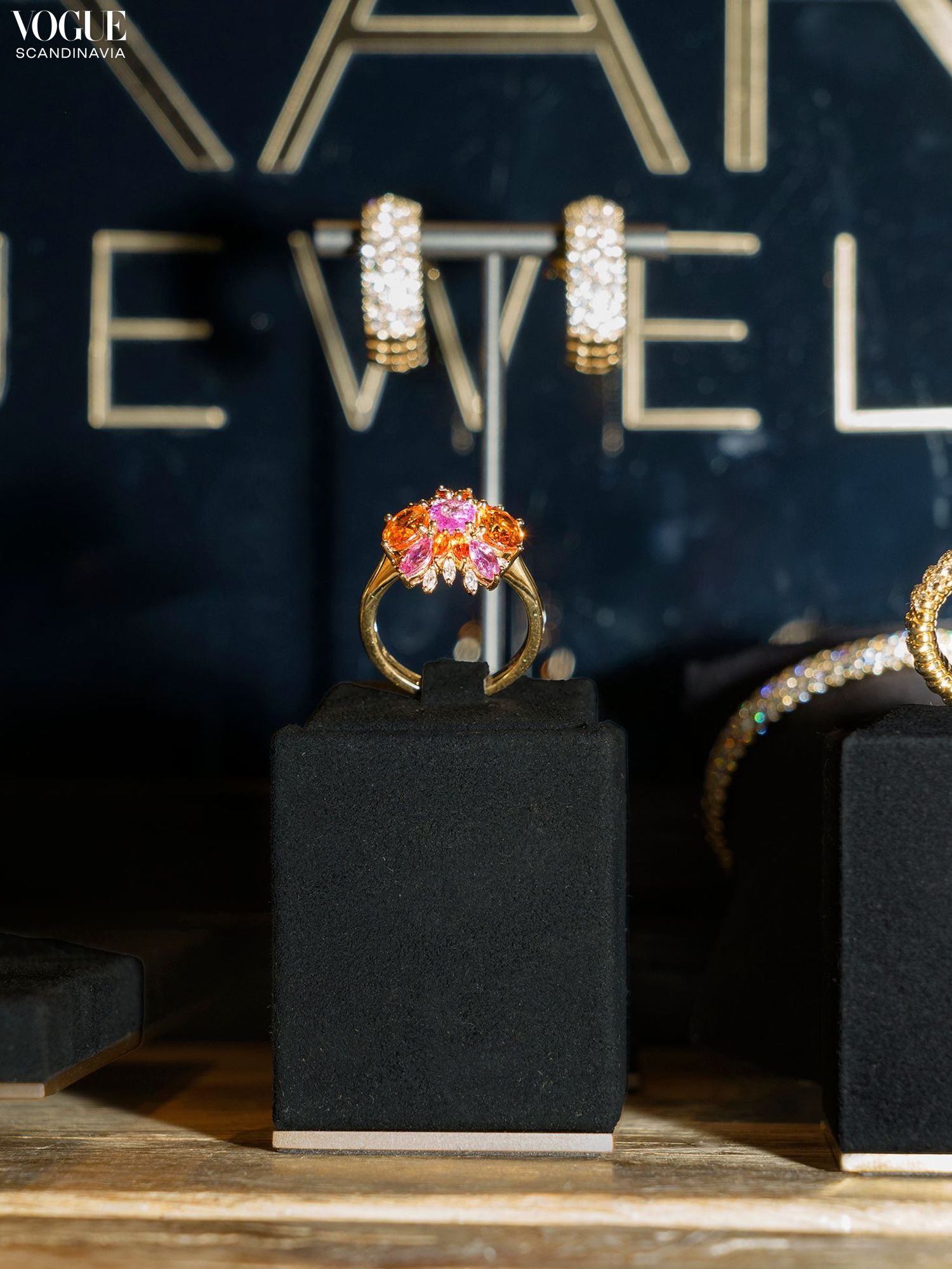 “The inspiration comes from nature,” says Rare Jewelry founder Dannie Larsson, who cohosted the evening with Bonnier. “But I wouldn’t say Swedish nature.” Indeed, the two rings, each an assemblage of diamonds and gemstone petals arranged to create two extraordinary flowers, are unlike anything one would find in the archipelago. One is made of purple sapphires and green tourmaline, the other orange marquise and pink sapphire. Both, of course, are finished with diamonds.
