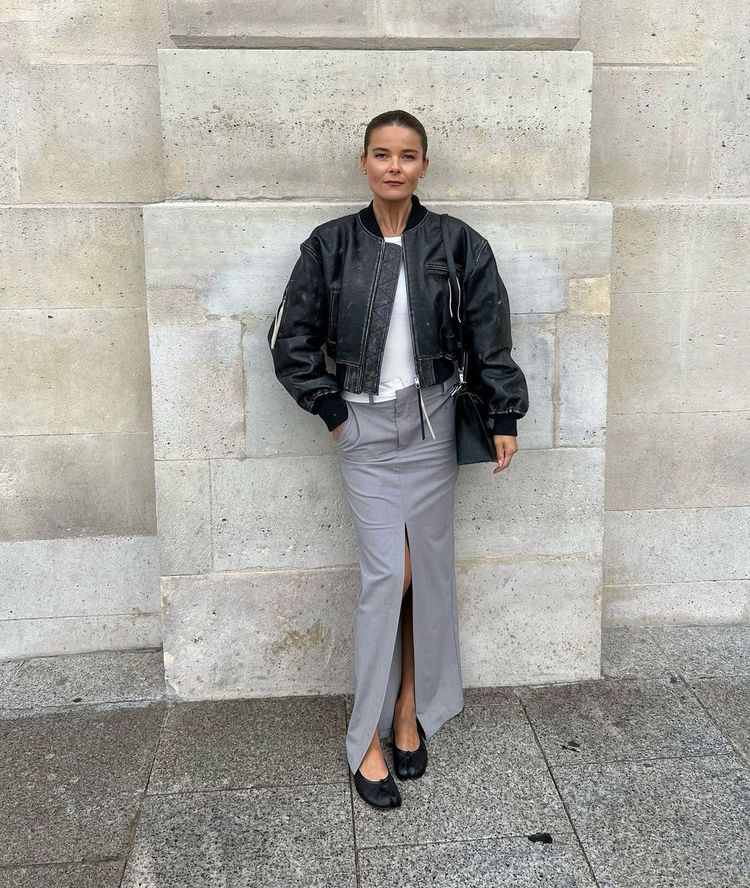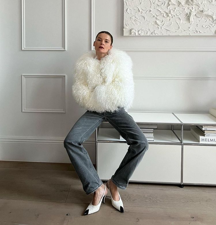 I would opt for an oversized cashmere sweater paired with a white T-shirt, denim trousers and comfortable shoes – either loafers or chic sneakers. After becoming a mother, I wear comfy shoes every day as I walk so much – so that has most definitely become a staple in my wardrobe.