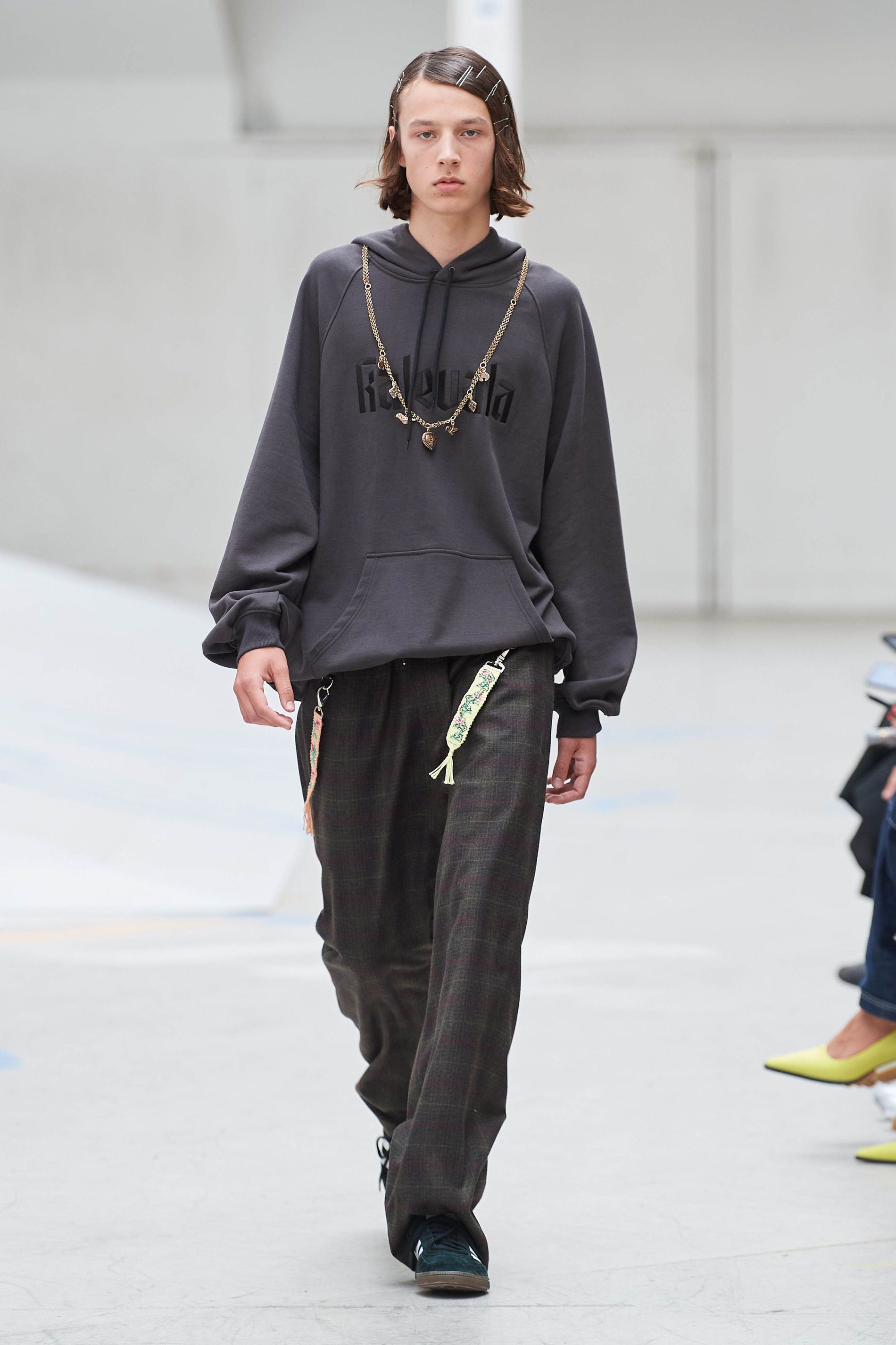 The many points of nostalgia span the designer's youth during the 1990s, his parents' in the 1960s, and his grandparents' in the 1930s. References should be “quite obvious throughout the collection,” according to Ekroth. The rose is a uniting motif linking the seemingly disparate periods; the three hand-painted floral prints – offset by breezy pastels borrowed from Ekroth’s memories and dark woollen tartans – play on the idea of looking at the past through rose-coloured glasses.