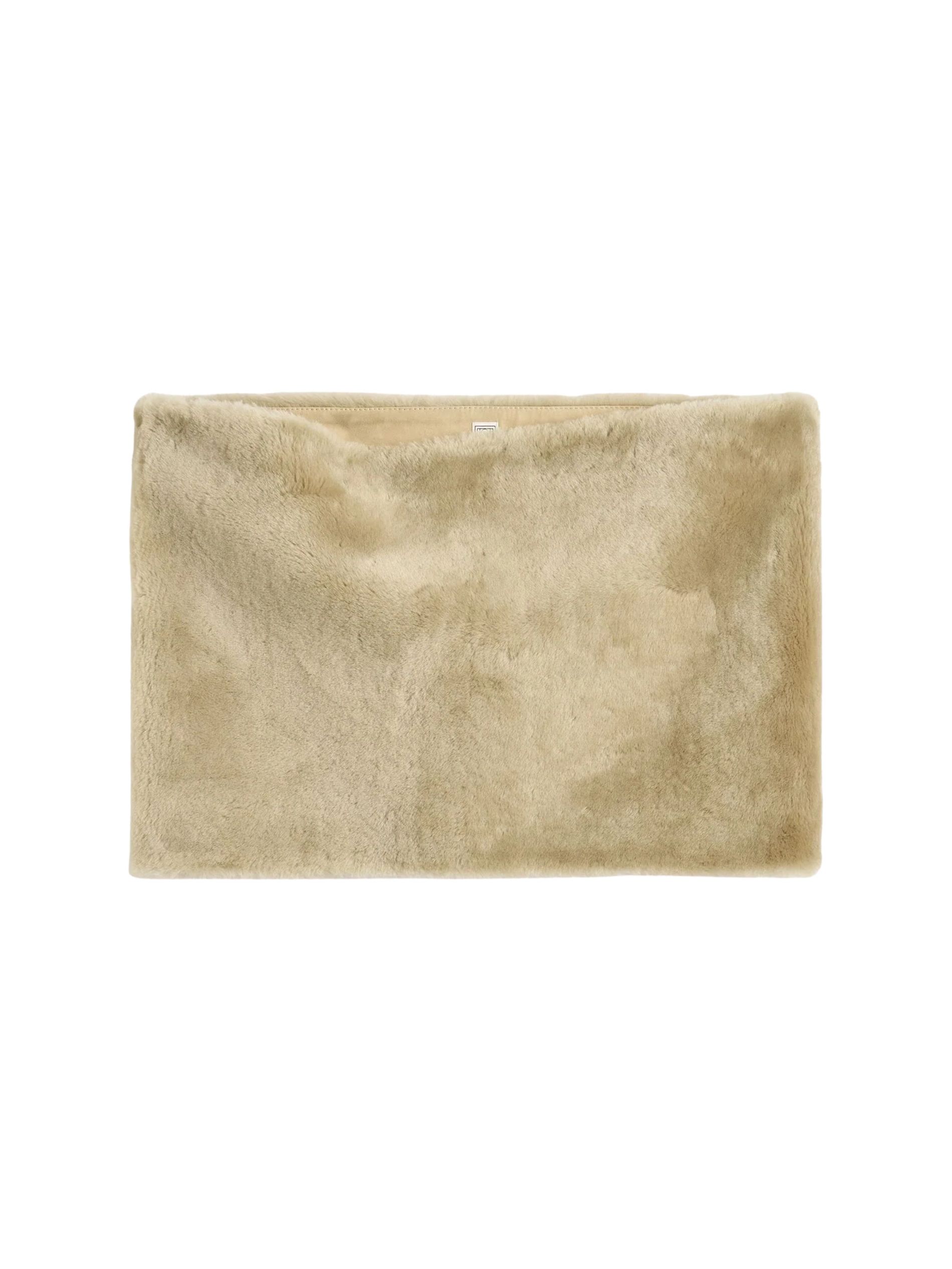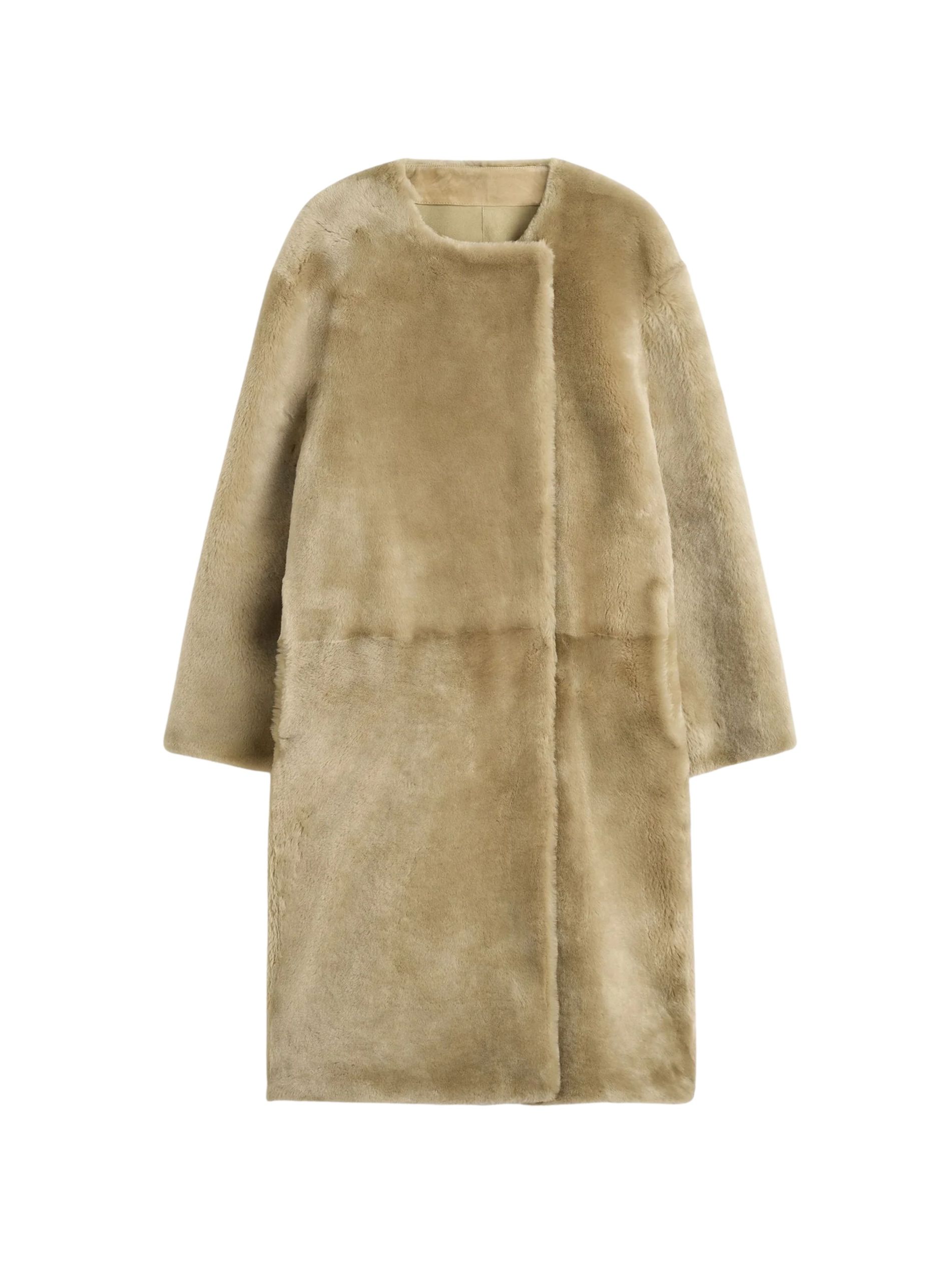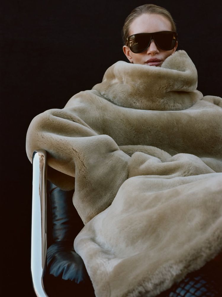 Huntington-Whiteley wrapped up for the winter season in a plush shearling coat from the Swedish label. Collarless, cosy, and reversible with a suede lining, the model paired the statement piece with a matching muff and finished the ensemble with Bottega Veneta woven boots and oversized YSL sunglasses.