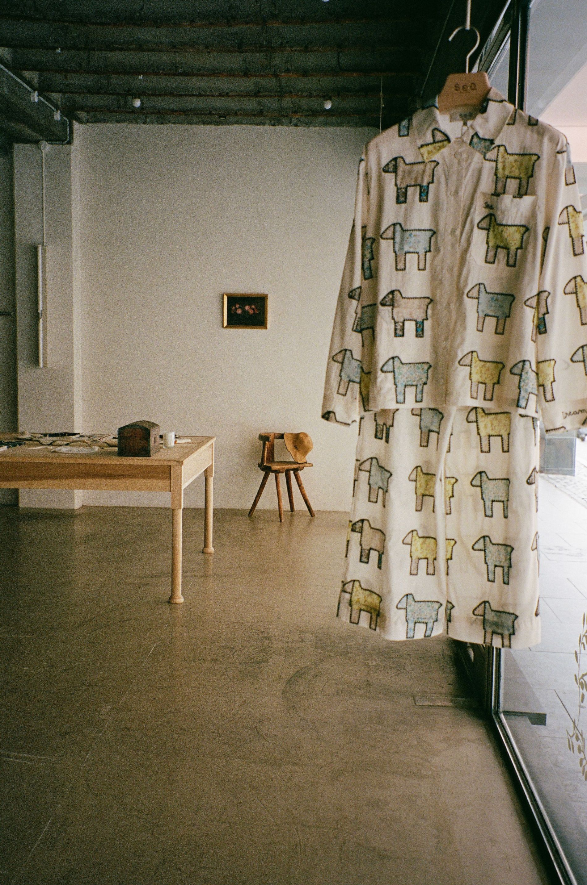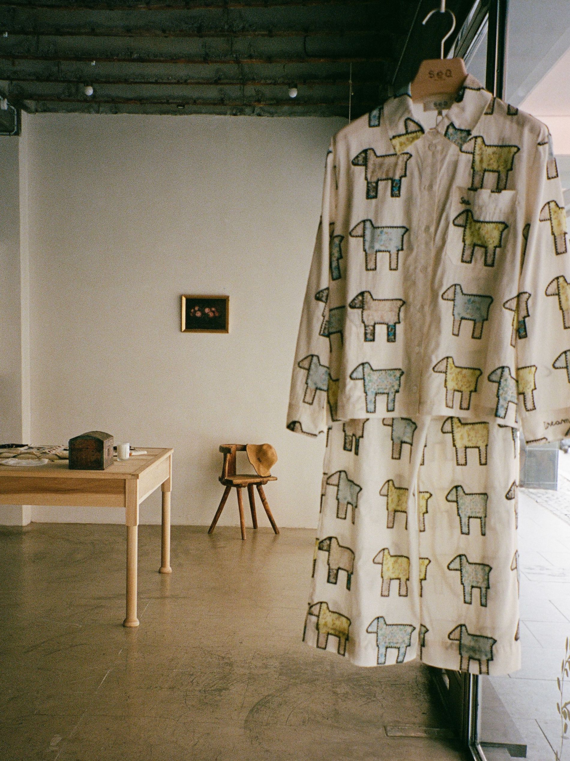 The result is a space that feels less like a pop-up and more like a quiet, tactile extension of Sea’s universe. The brand’s Pre-Fall and Fall 2025 collections, laden with intricate embroidery, delicate lace, and playful motifs, are displayed against this pared-back backdrop, allowing every handcrafted detail to take centre stage.
