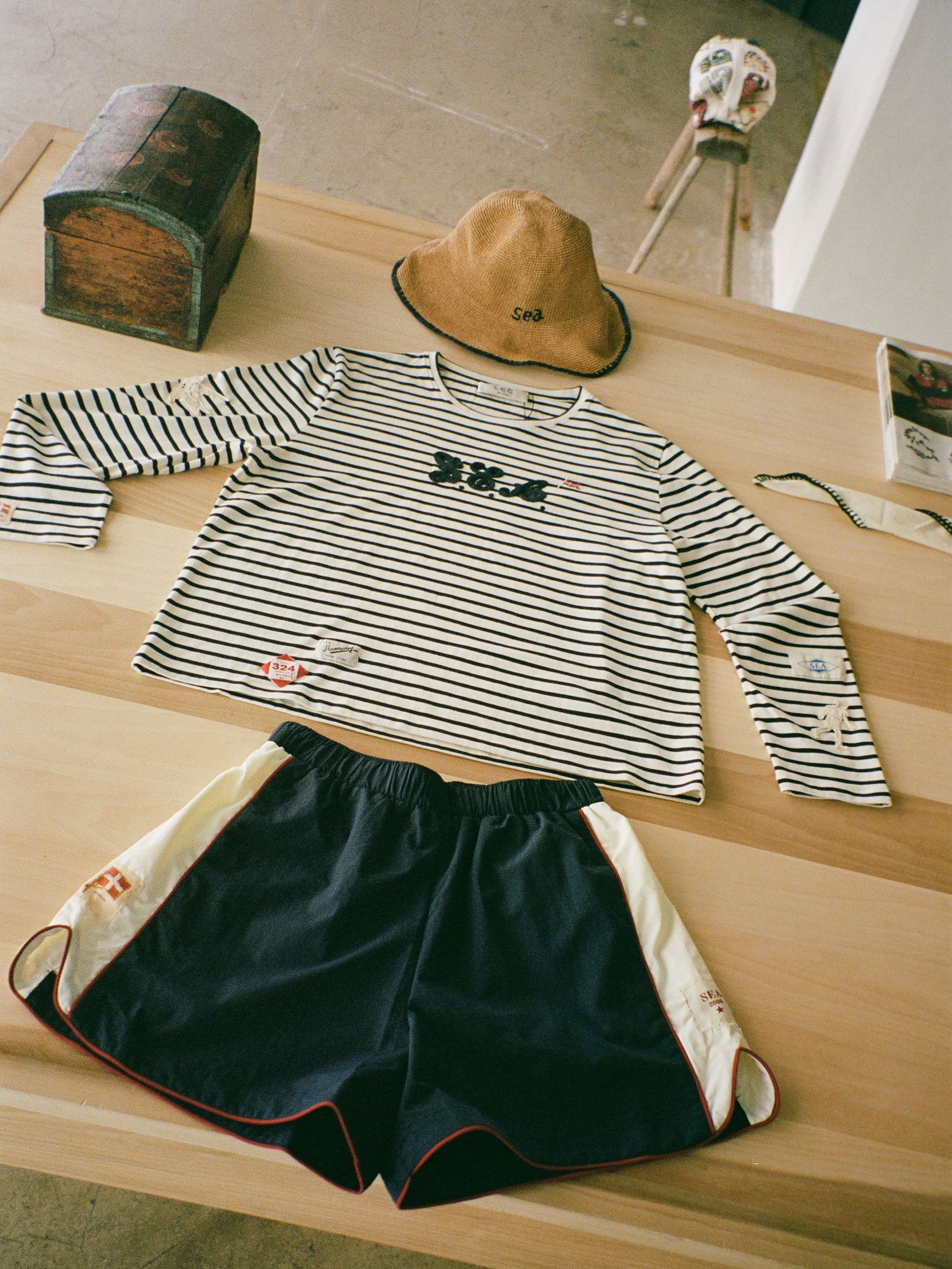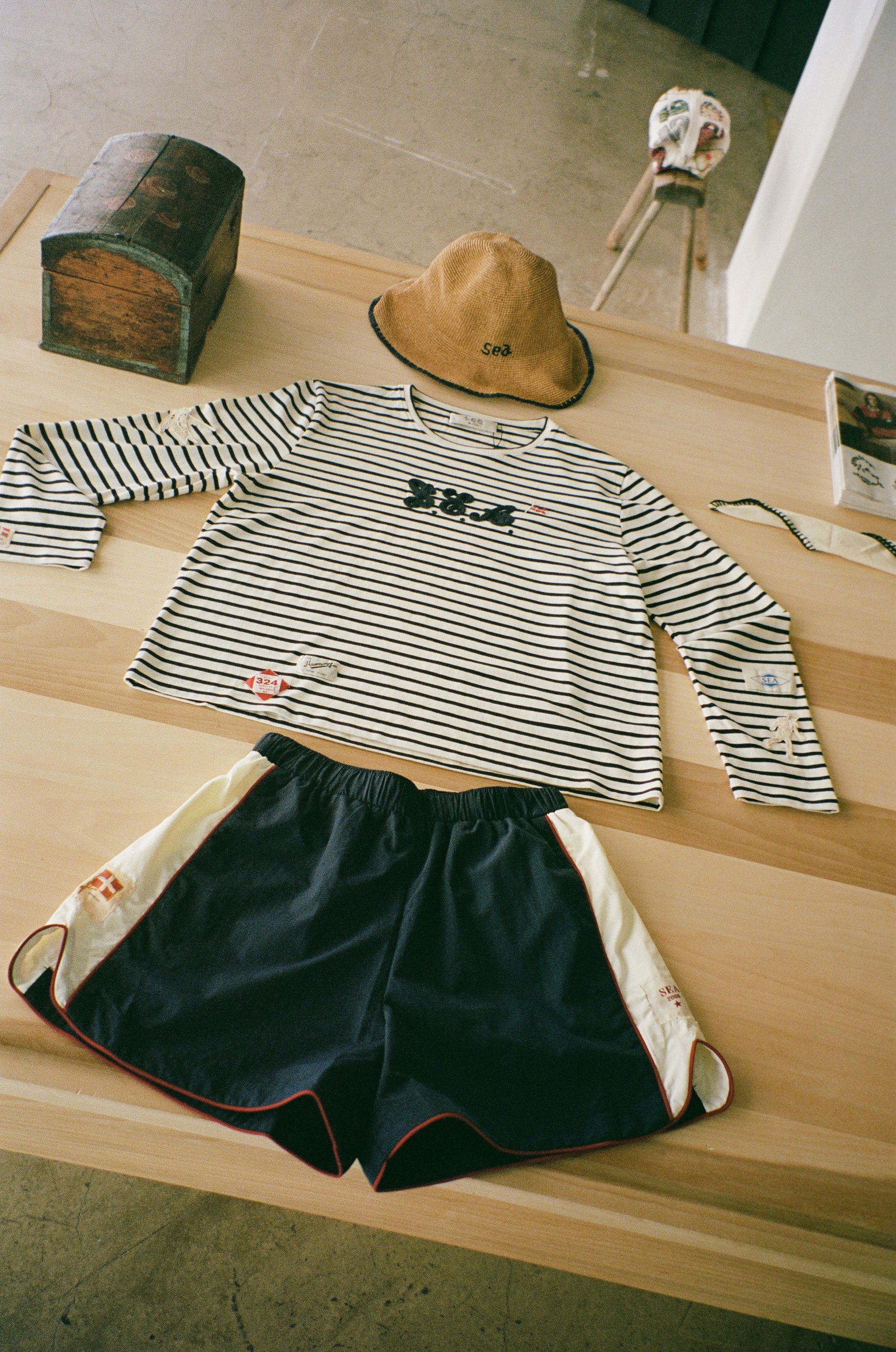 Especially for Copenhagen, Sea designed a series of limited-edition pieces that celebrate this cross-cultural connection: a marine-striped top embroidered with a Danish flag, track shorts featuring vintage tobacco label patches, and woven sun hats playfully adorned with Sea’s signature animal motifs. These pieces, available exclusively at the Møntergade pop-up, speak to the brand’s ongoing dialogue with craftsmanship and place.