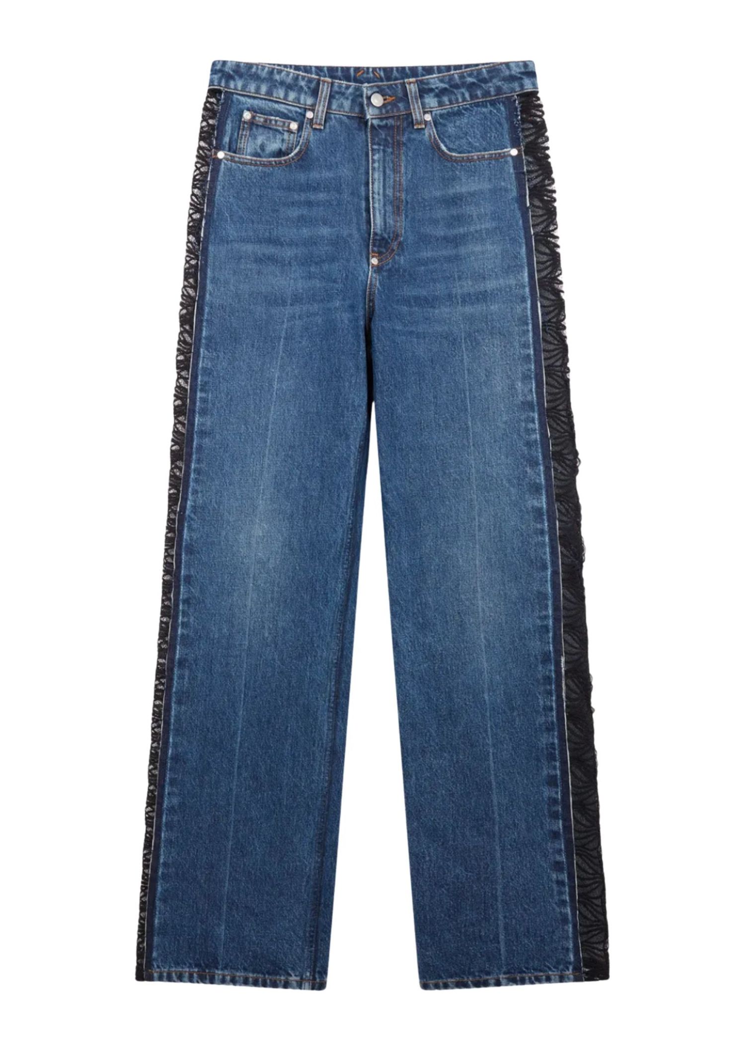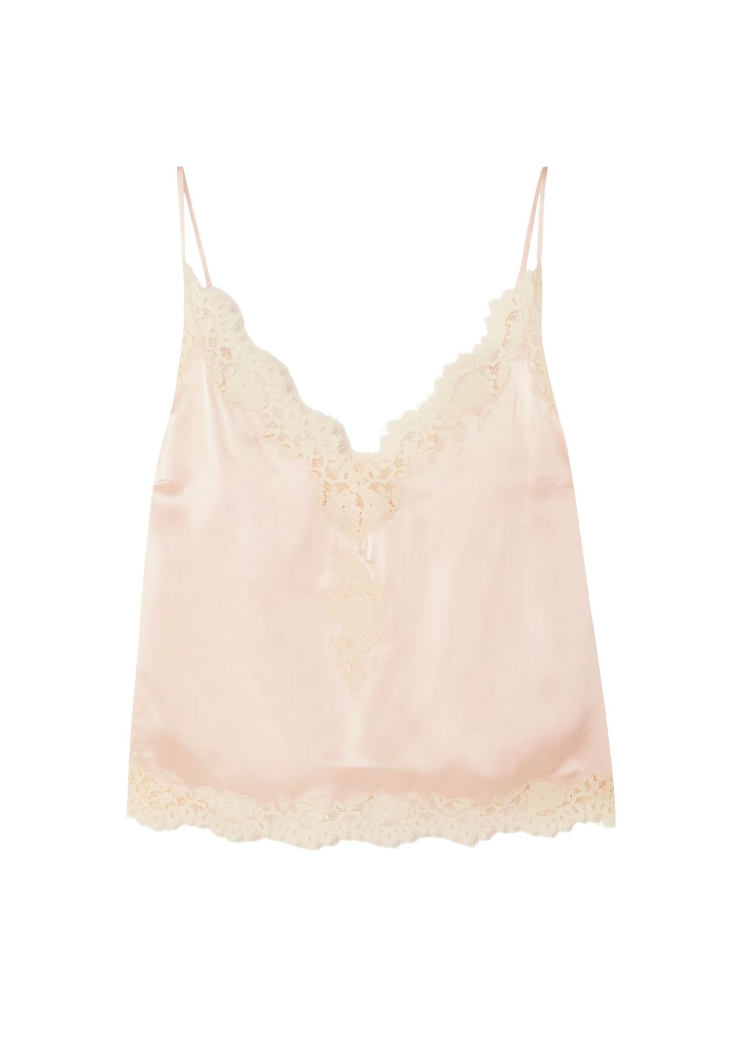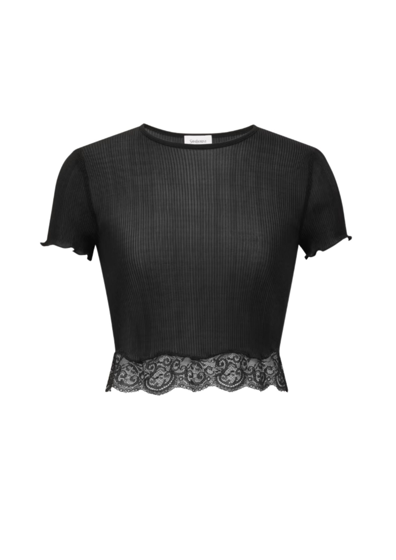 Looking to bring it into your own wardrobe? Try Dôen’s lace-trimmed camisole for layering, Nina Ricci’s satin mini for evening, or Stella McCartney’s lace-panelled jeans for an unexpected twist. For a subtle take, Saint Laurent’s ribbed silk tee is a refined option.