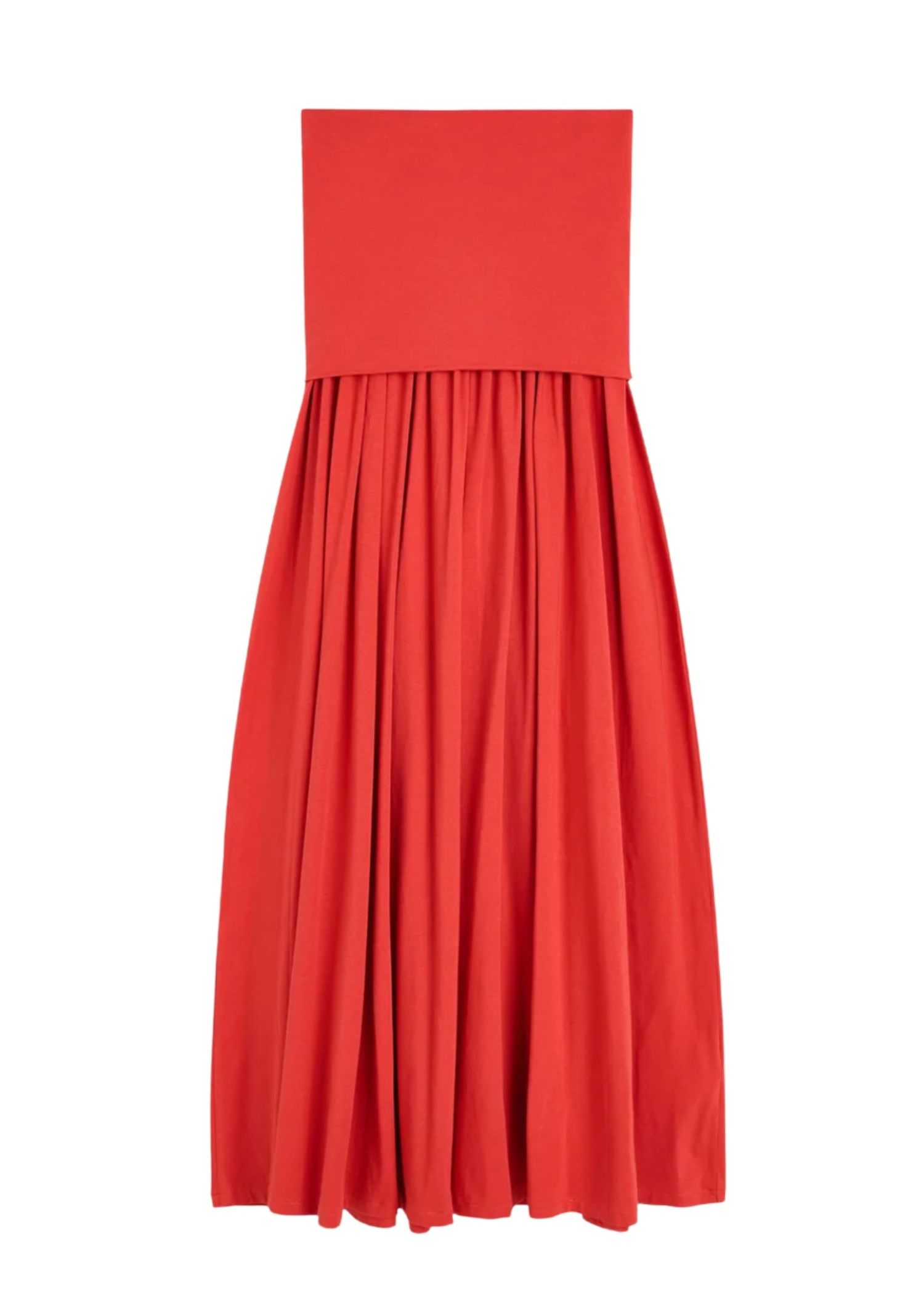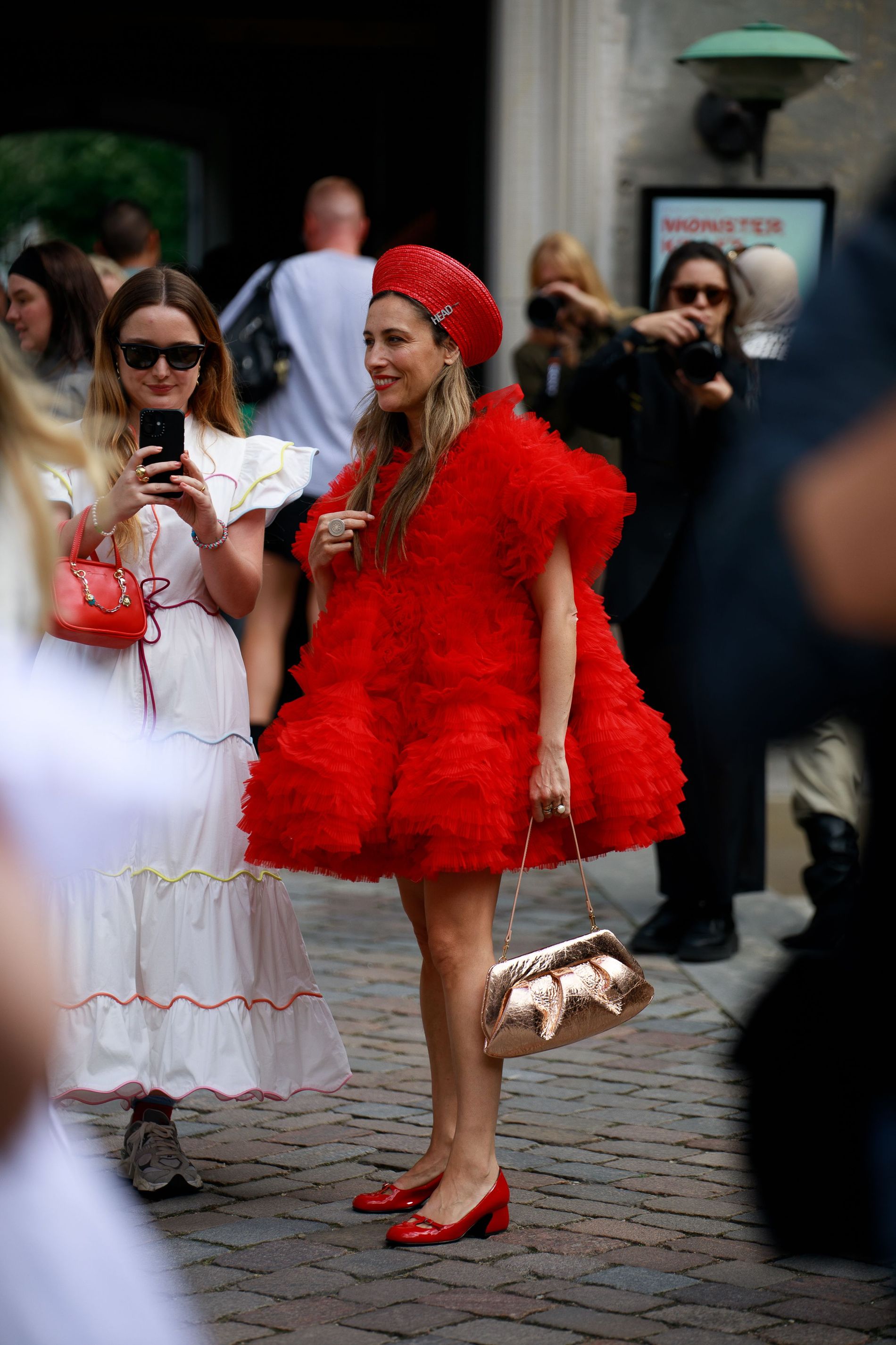 Tomato red made a bold statement on the autumn/winter '25 runways earlier this year and is set to be one of the season’s defining shades – already showing up on the streets of Copenhagen this week. At Prada, the colour appeared across wool coats, paper bag waist midi skirts, and dresses styled over pants, bringing warmth and energy to structured silhouettes. Balenciaga took a dramatic approach, sending a floor-length fur coat in vibrant red down the runway, cinched at the waist with a black leather belt.