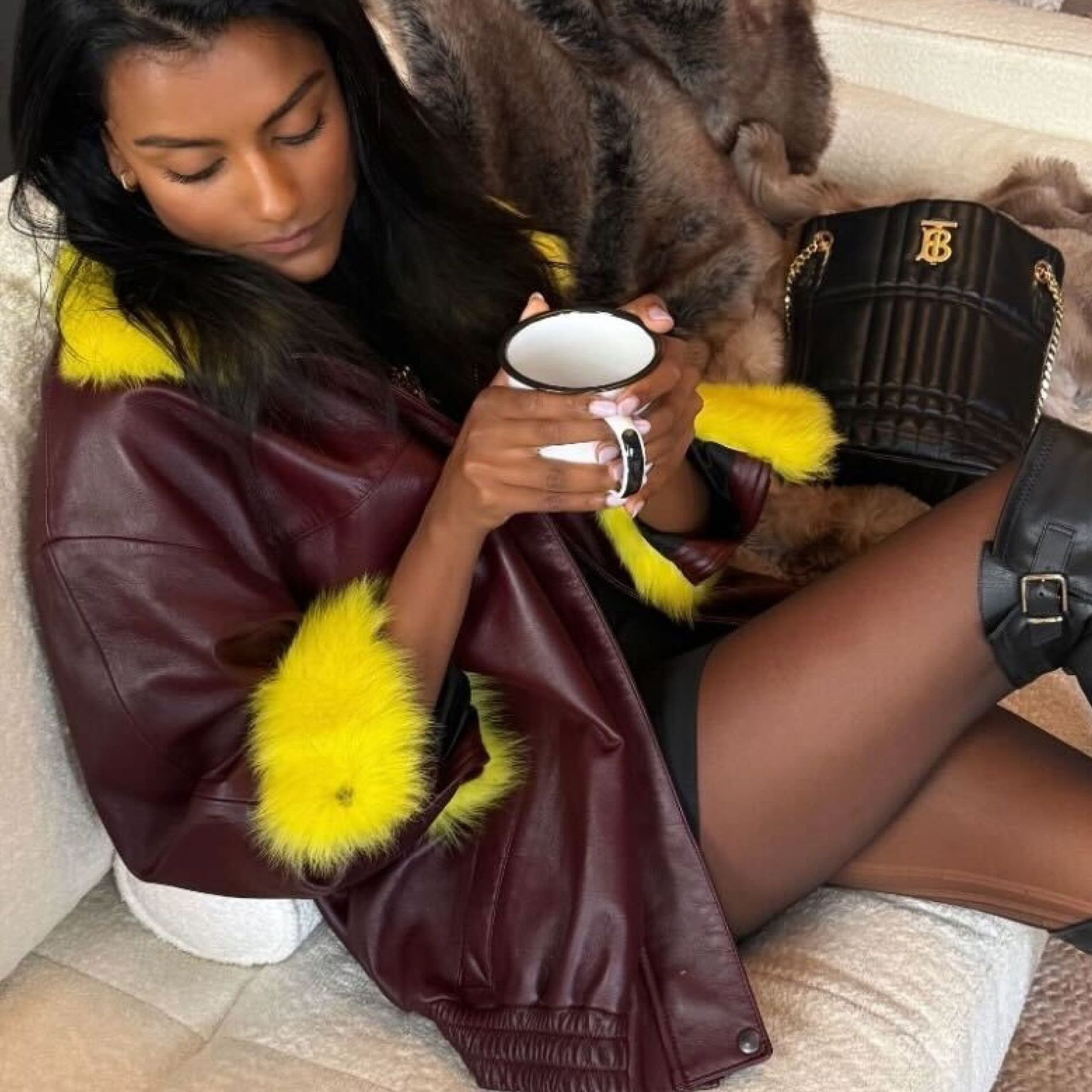 On November 4th, in a shot shared to her Instagram story, Ashley cemented her status as a fan of Nordic design, donning the Zoe bomber jacket with detachable collar from Finnish label Onar Studios. This isn't a piece for the sartorially faint of heart: the vibrant jacket, with burgundy its leather offset by vivid neon yellow shearling, is as bold as they come. Yet, the actress – reclining with a mug in hand, Burberry bucket bag by her side – wears it with an easy nonchalance that turns statement piece into personal signature.