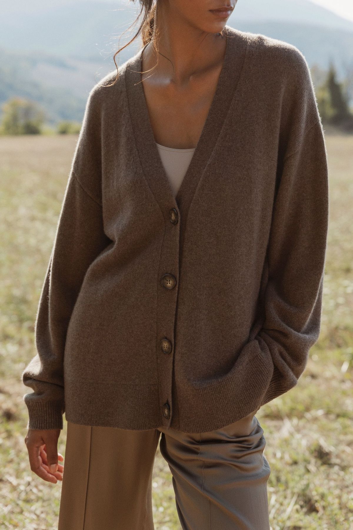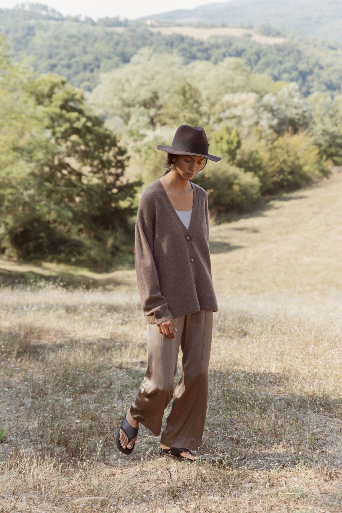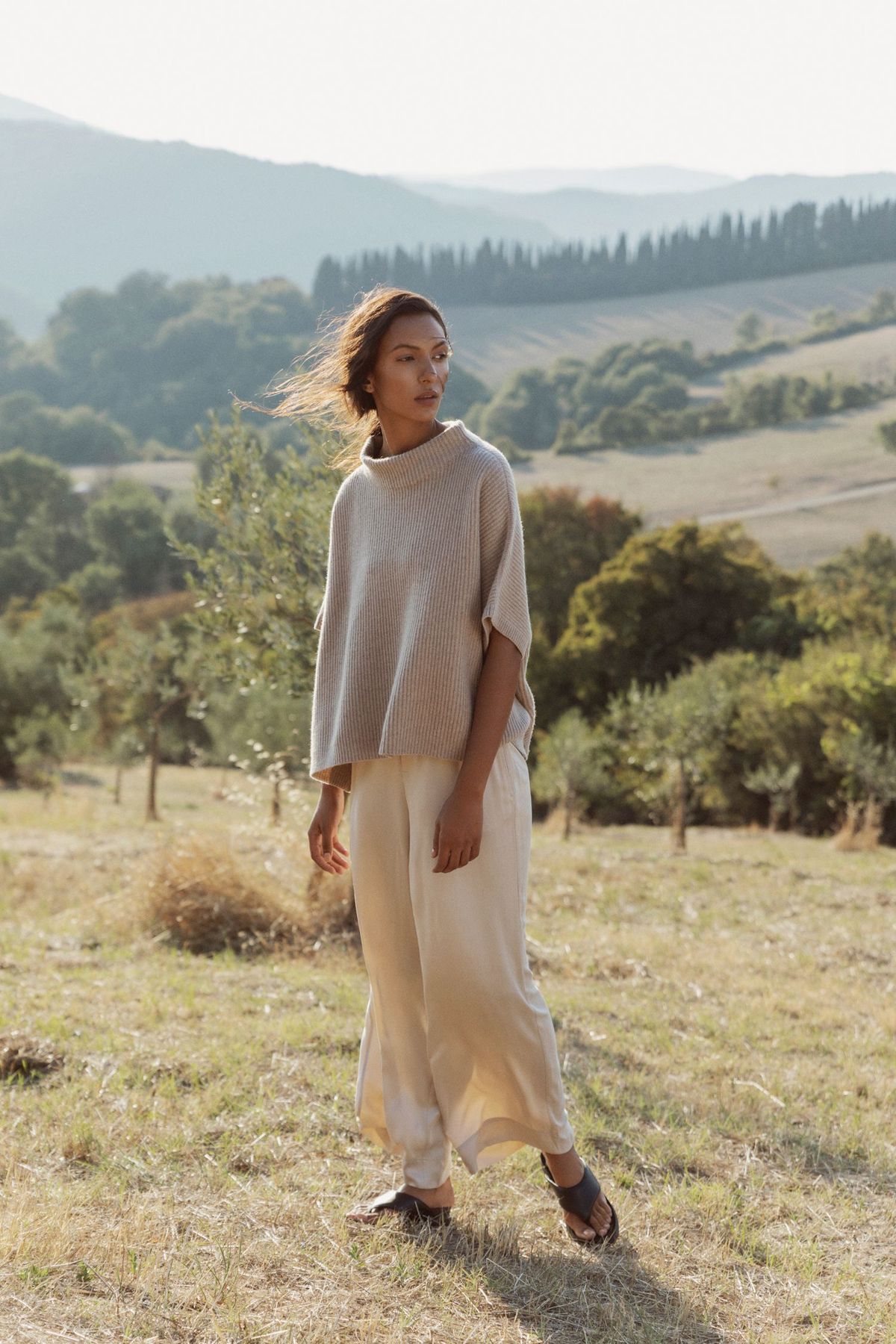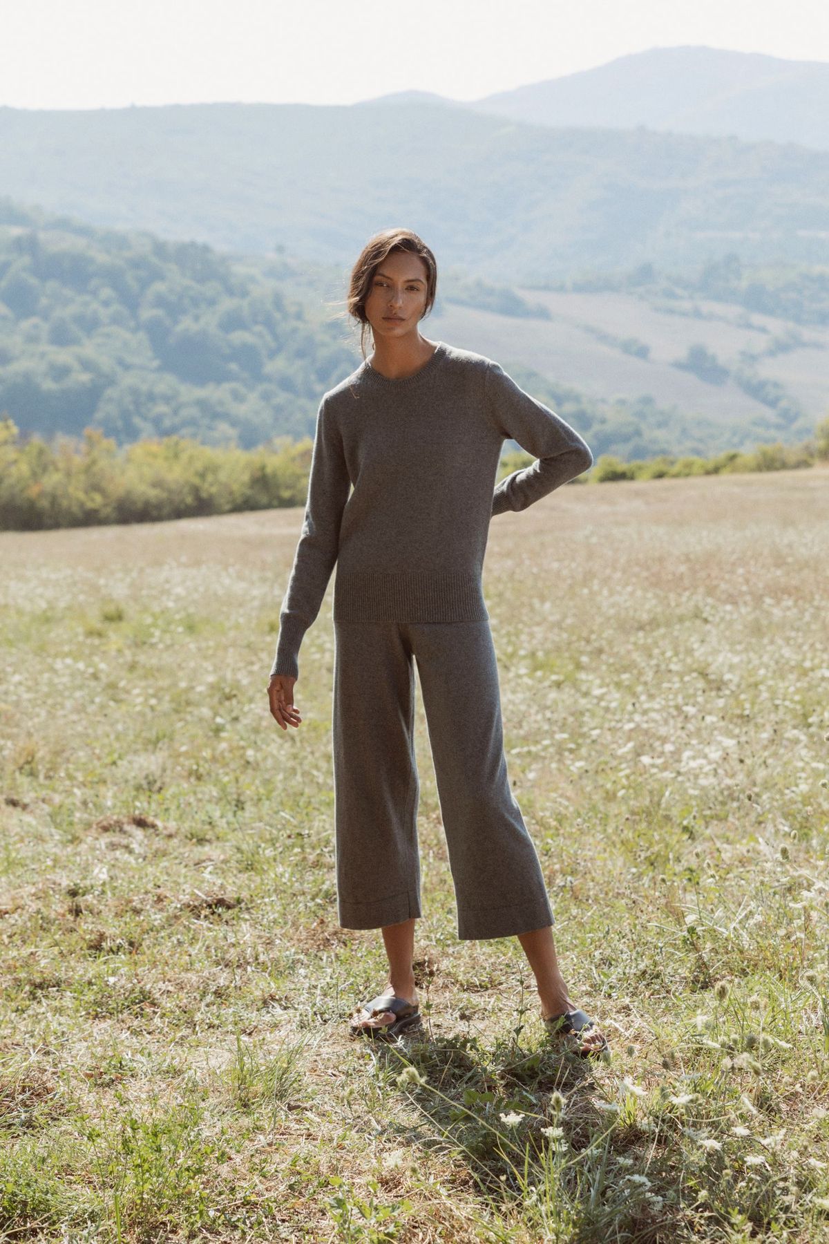 In the new capsule collection, a total of eight styles – six for women and two for men – have been introduced in three natural colourways, cutting out the dyeing process. Two classic styles return to the womenswear collection, the brand’s round-neck sweater and oversized cardigan – which are mirrored in the menswear. The brand’s best selling knit trousers and knit short sleeve top are also included in recycled cashmere.