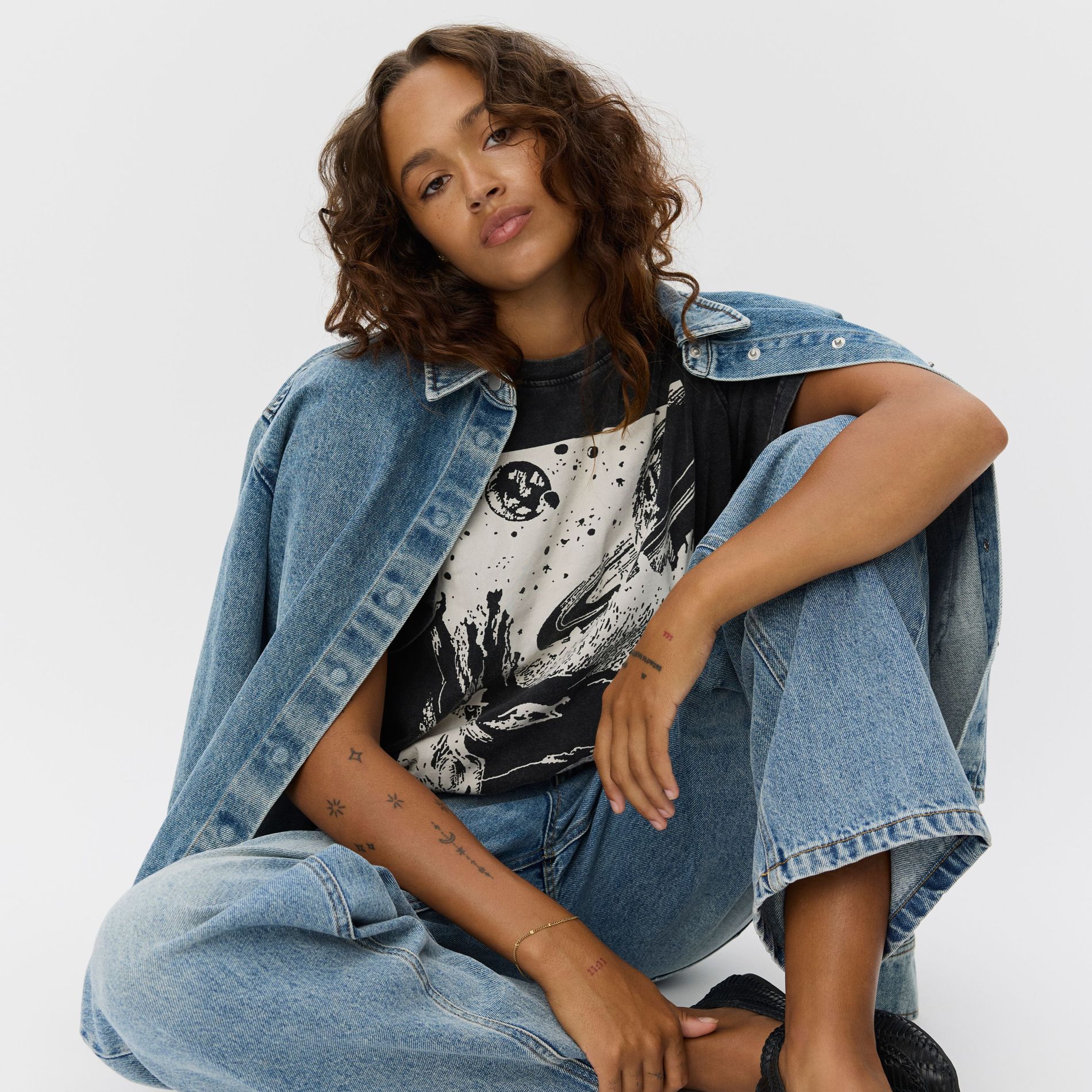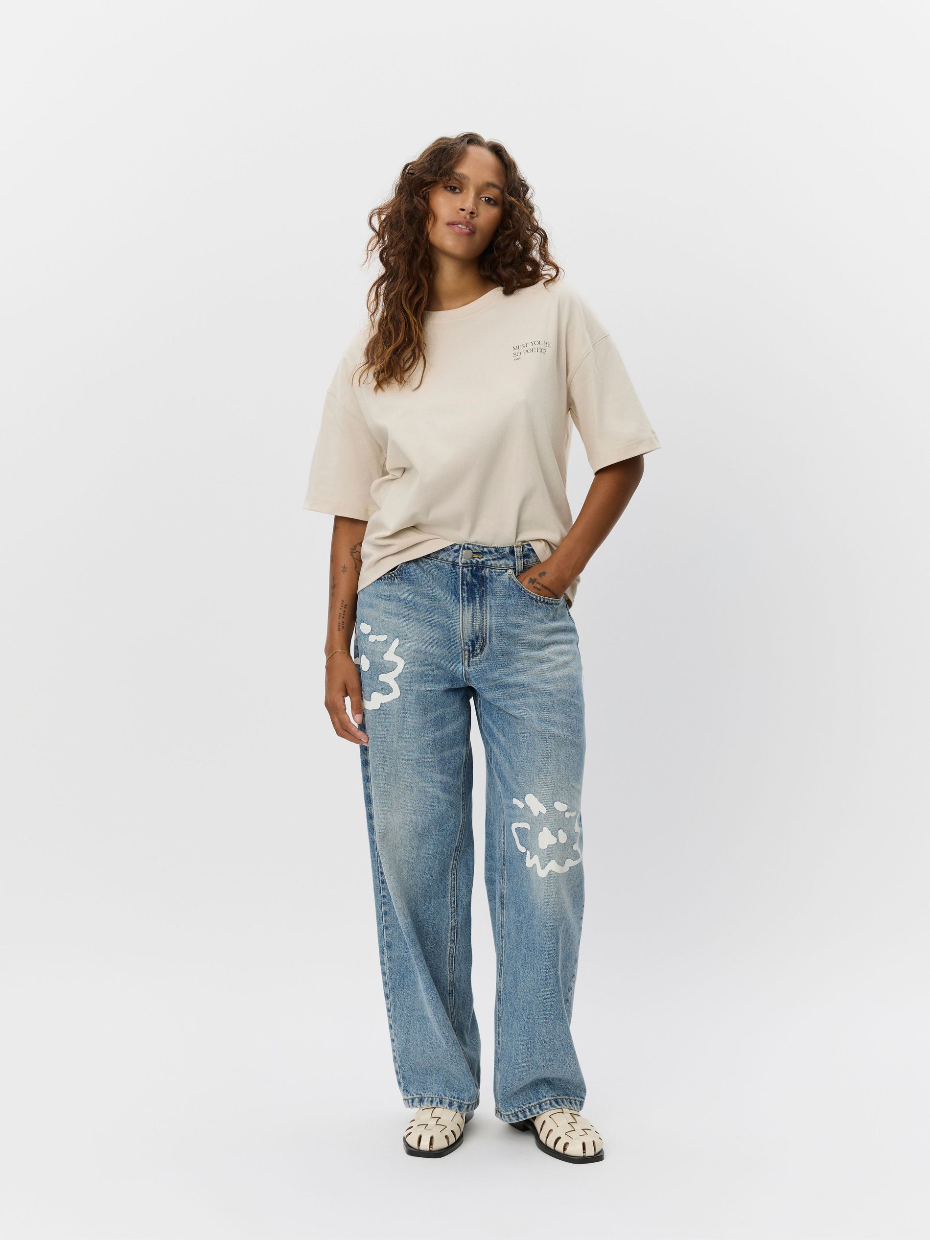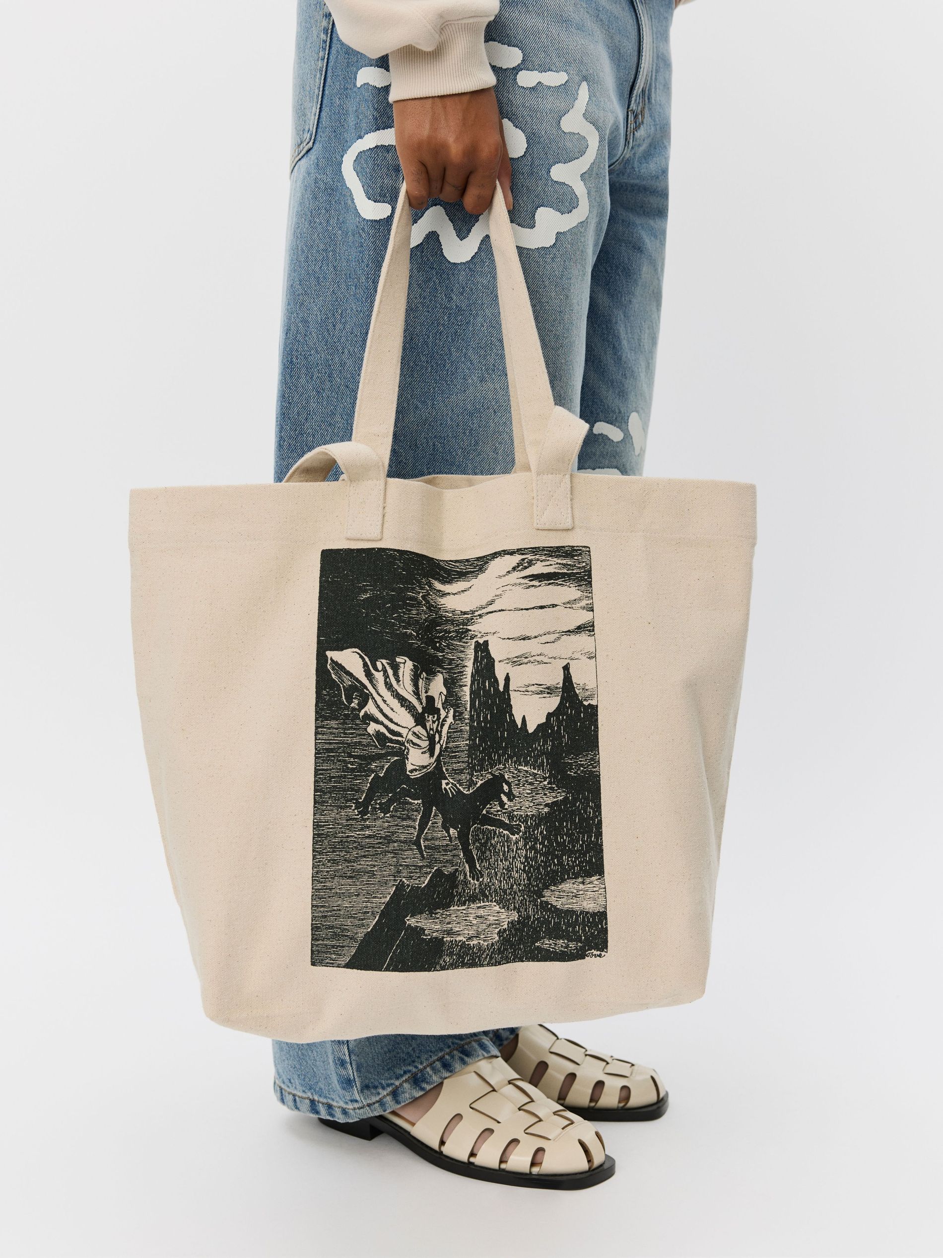 The collection also explores a more artistic sensibility, with denim serving as the canvas for whimsical Moomin motifs. Gentle florals cascade down one pair of jeans, complemented by a serene landscape adorning the back of a matching shirt. Rendered in a restrained palette of blues, beiges, and whites, these pieces possess a quiet versatility, allowing them to seamlessly integrate into any existing wardrobe (much like the Moomins themselves seamlessly integrated into our childhood).