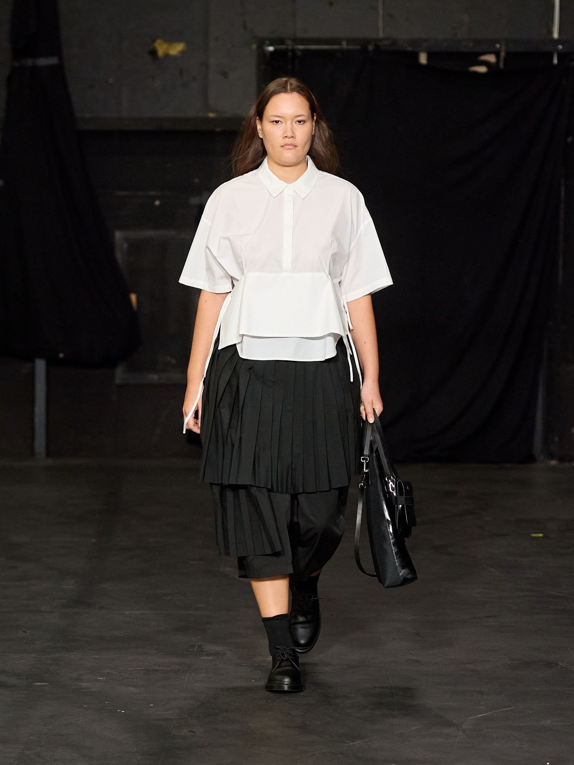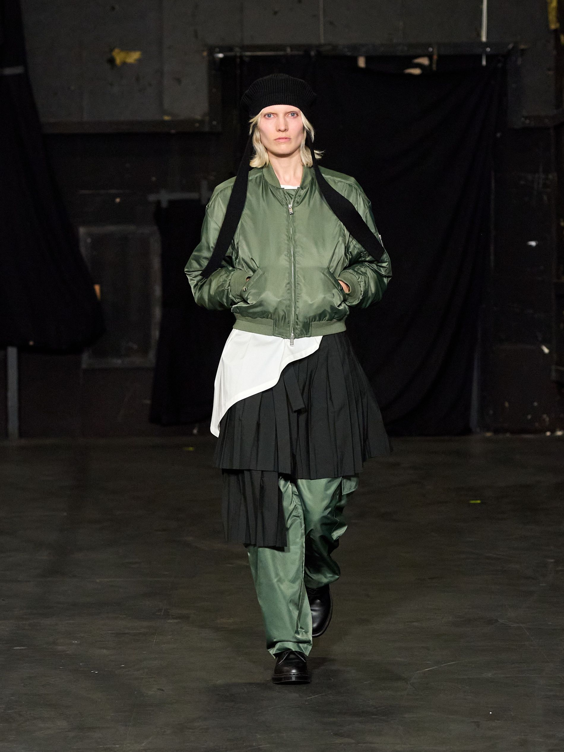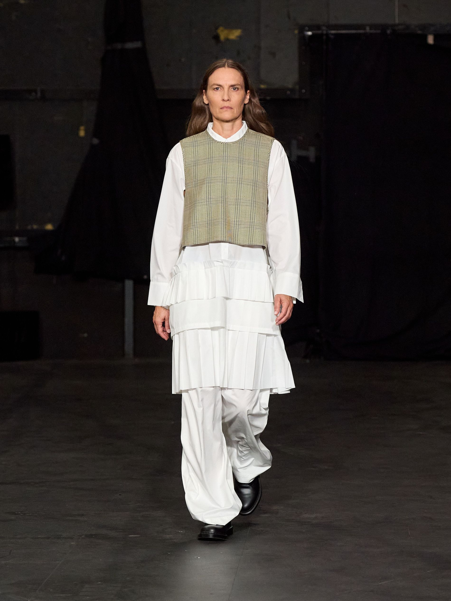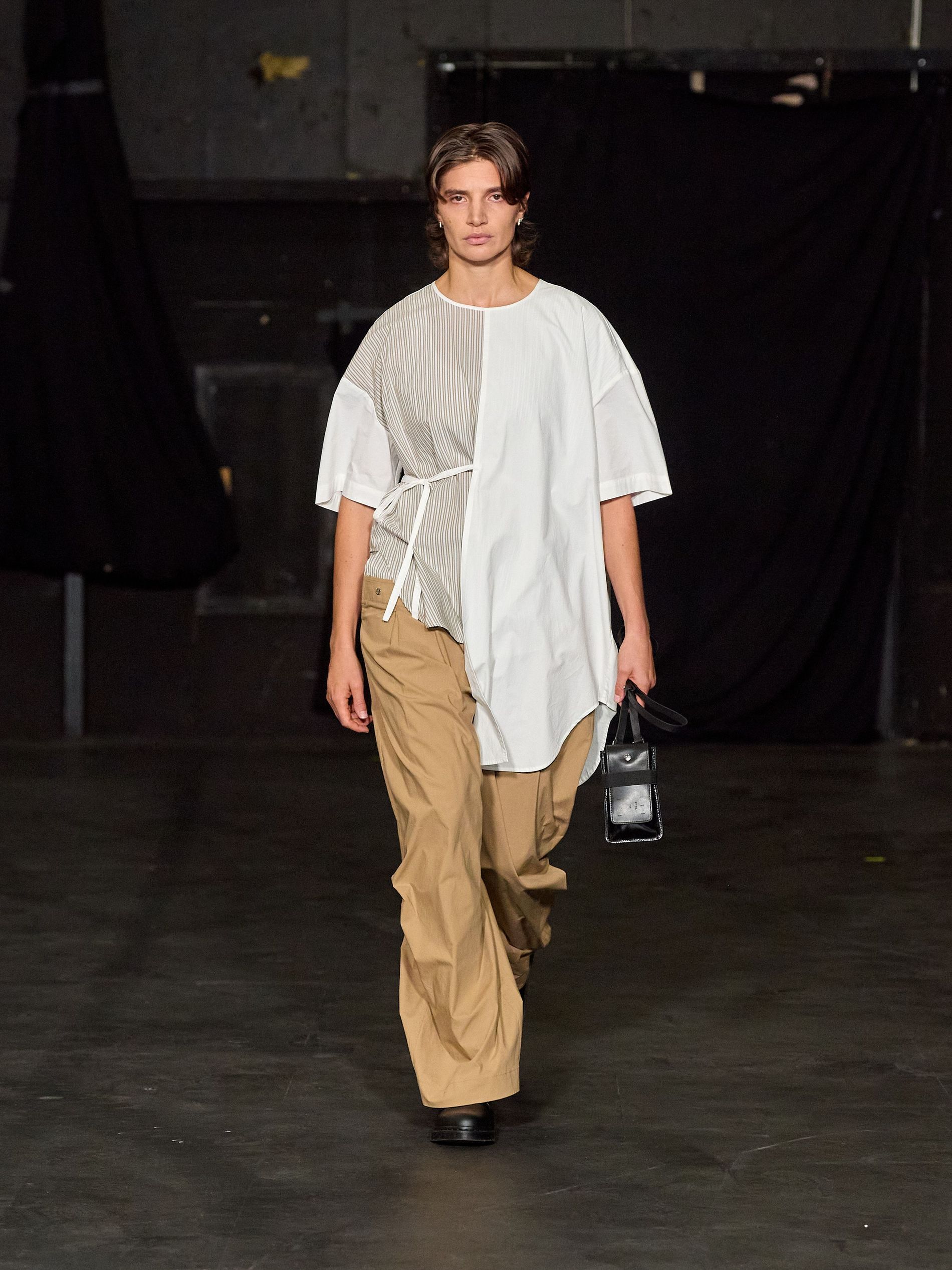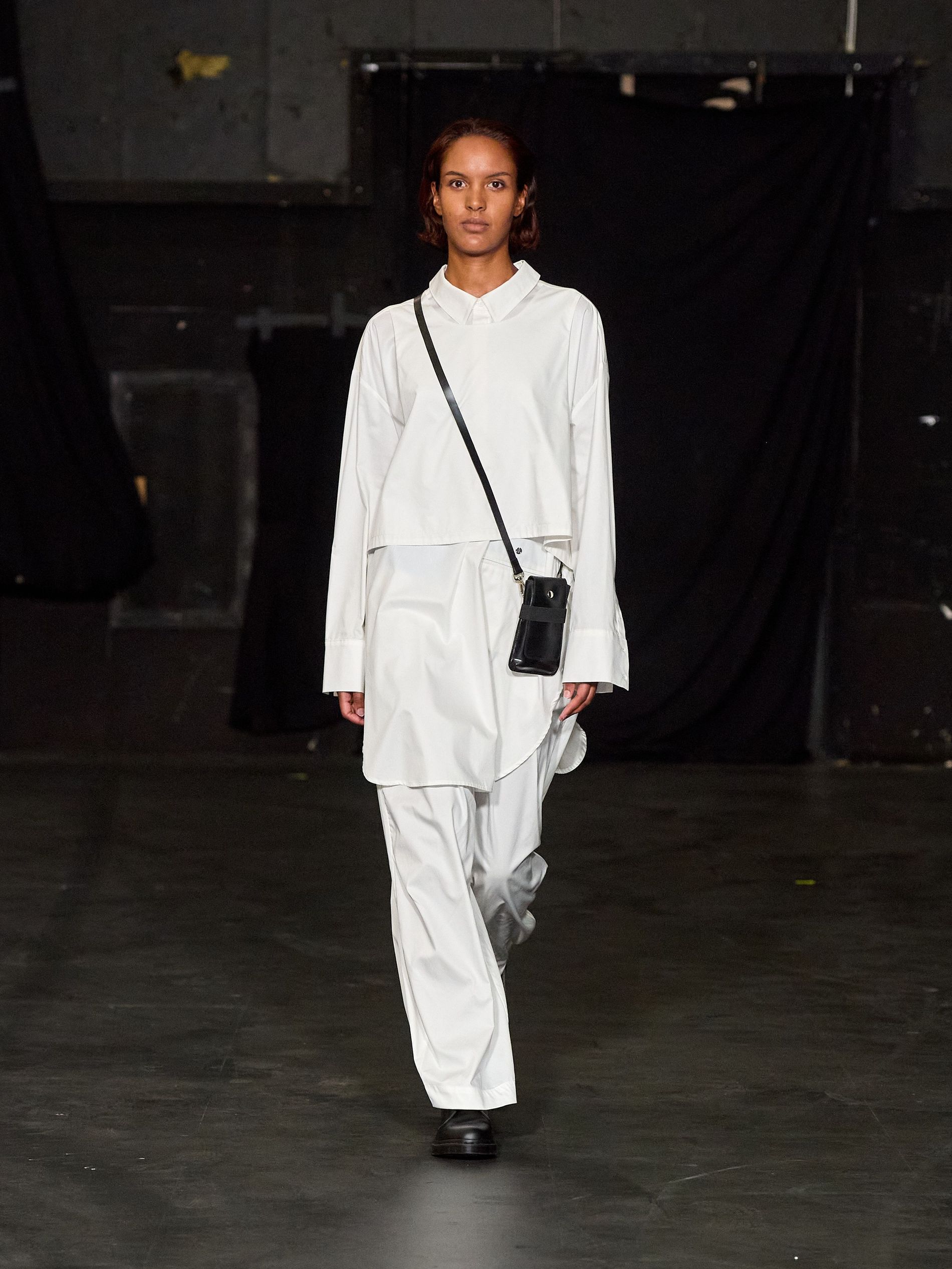 The garments (which, to emphasise their made-for-life ethos, are largely see-now-buy-now) build on that aforementioned design language, leaning more heavily into the notion of layers (both within the clothes themselves and via styling) and thoughtful asymmetry. A black pleated apron skirt, for instance, featuring a midi layer and a mini layer, is worn over relaxed trousers and apron shirts with tied sides (another feature of the Stel universe – adaptability and size inclusivity) is popped over a classic Oxford button-down. Any nods towards streetwear veer towards a more Japanese interpretation, where technical fabrics reign supreme (no Supreme pun intended). The barrel-legged cargo pants and matching padded bomber are sure to scratch the itch of long-time Astrid Andersen fans.