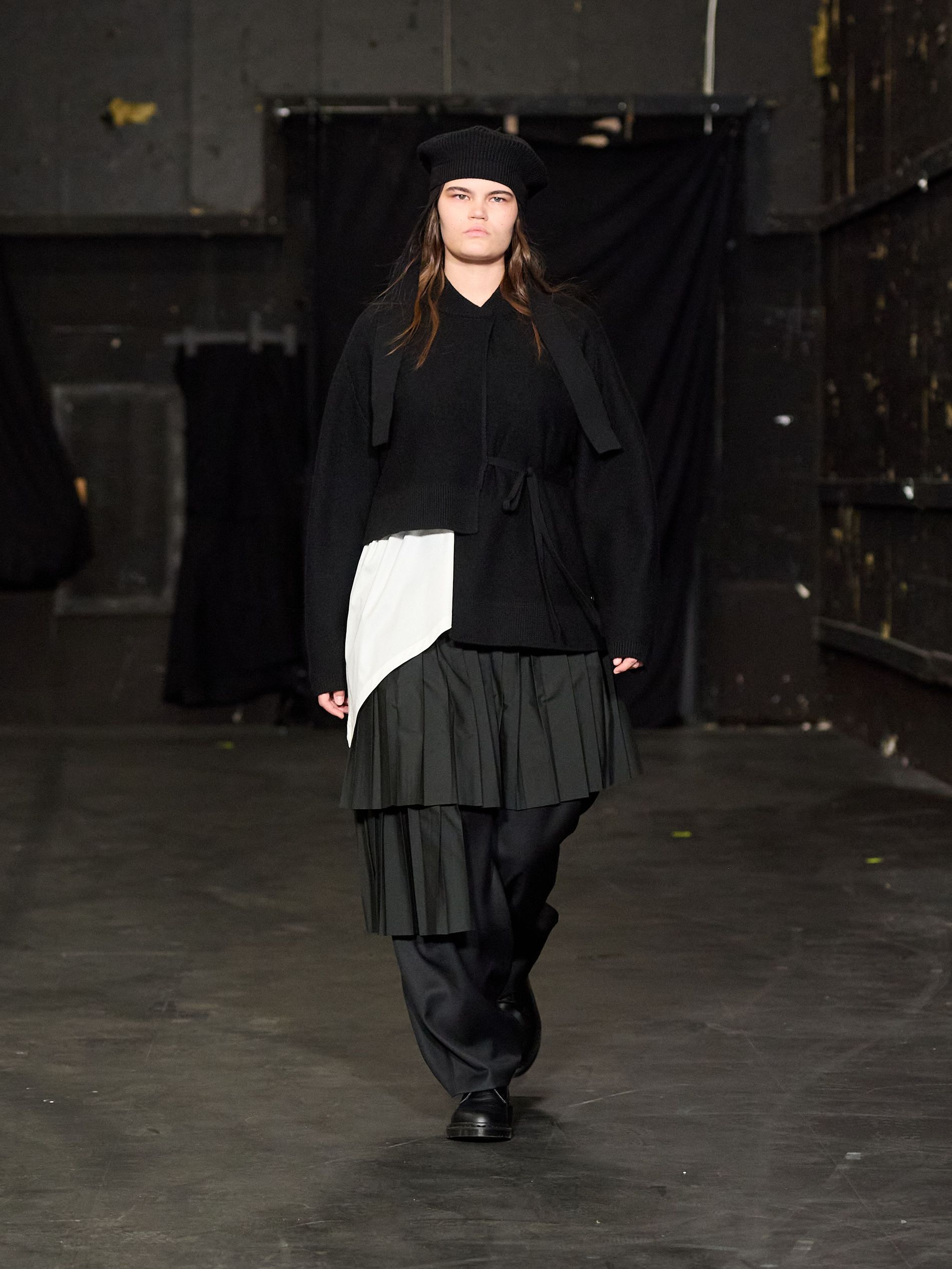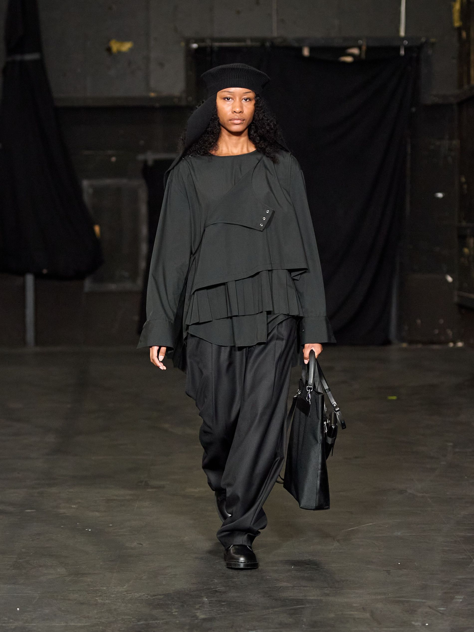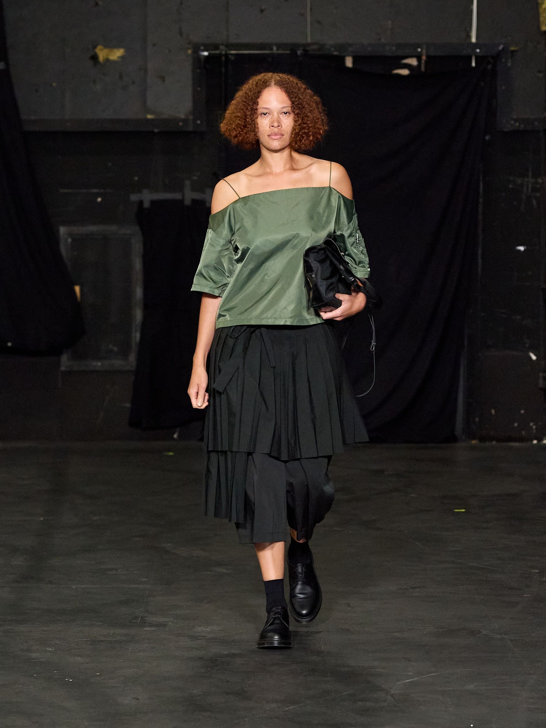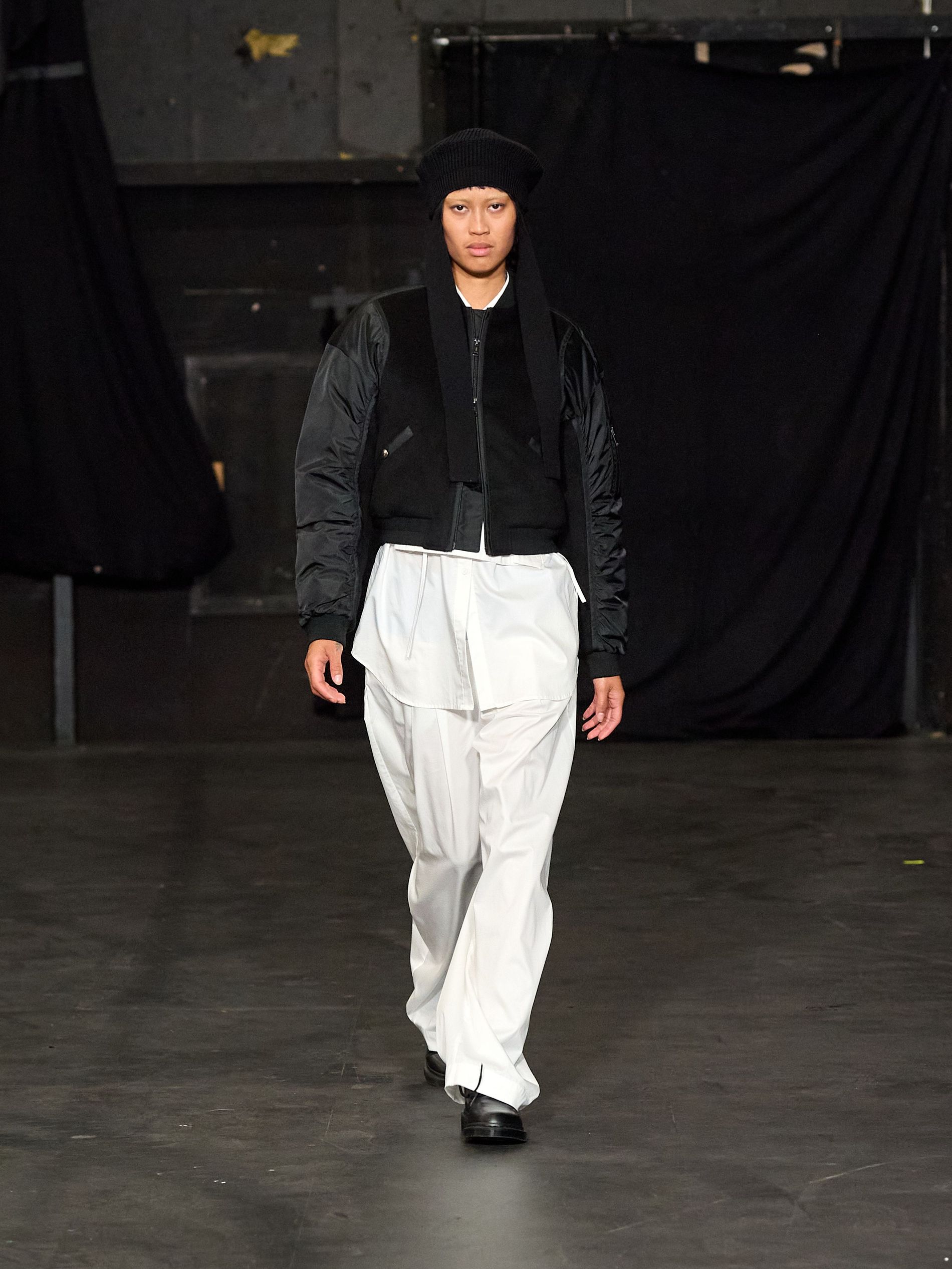The garments (which, to emphasise their made-for-life ethos, are largely see-now-buy-now) build on that aforementioned design language, leaning more heavily into the notion of layers (both within the clothes themselves and via styling) and thoughtful asymmetry. A black pleated apron skirt, for instance, featuring a midi layer and a mini layer, is worn over relaxed trousers and apron shirts with tied sides (another feature of the Stel universe – adaptability and size inclusivity) is popped over a classic Oxford button-down. Any nods towards streetwear veer towards a more Japanese interpretation, where technical fabrics reign supreme (no Supreme pun intended). The barrel-legged cargo pants and matching padded bomber are sure to scratch the itch of long-time Astrid Andersen fans.