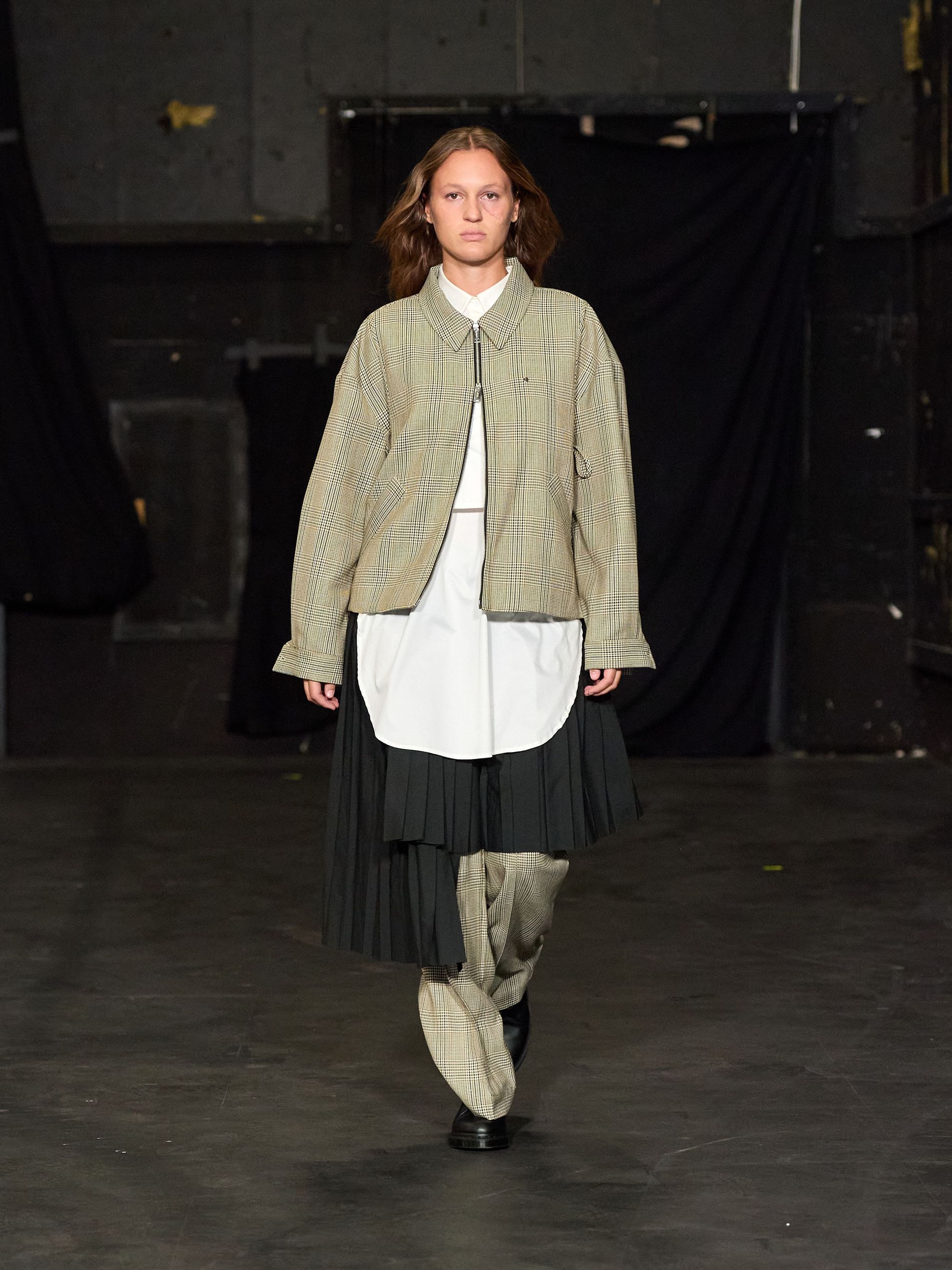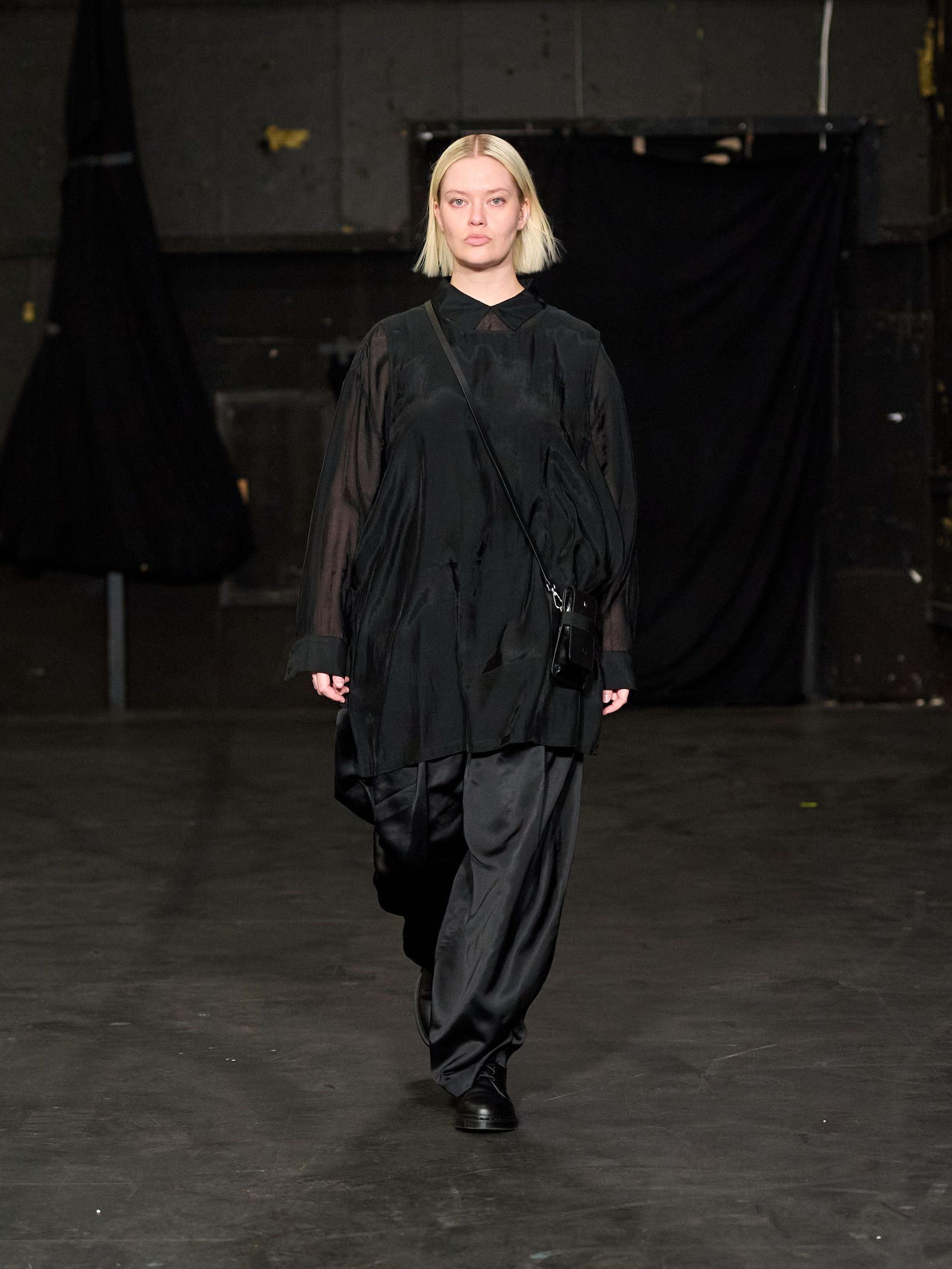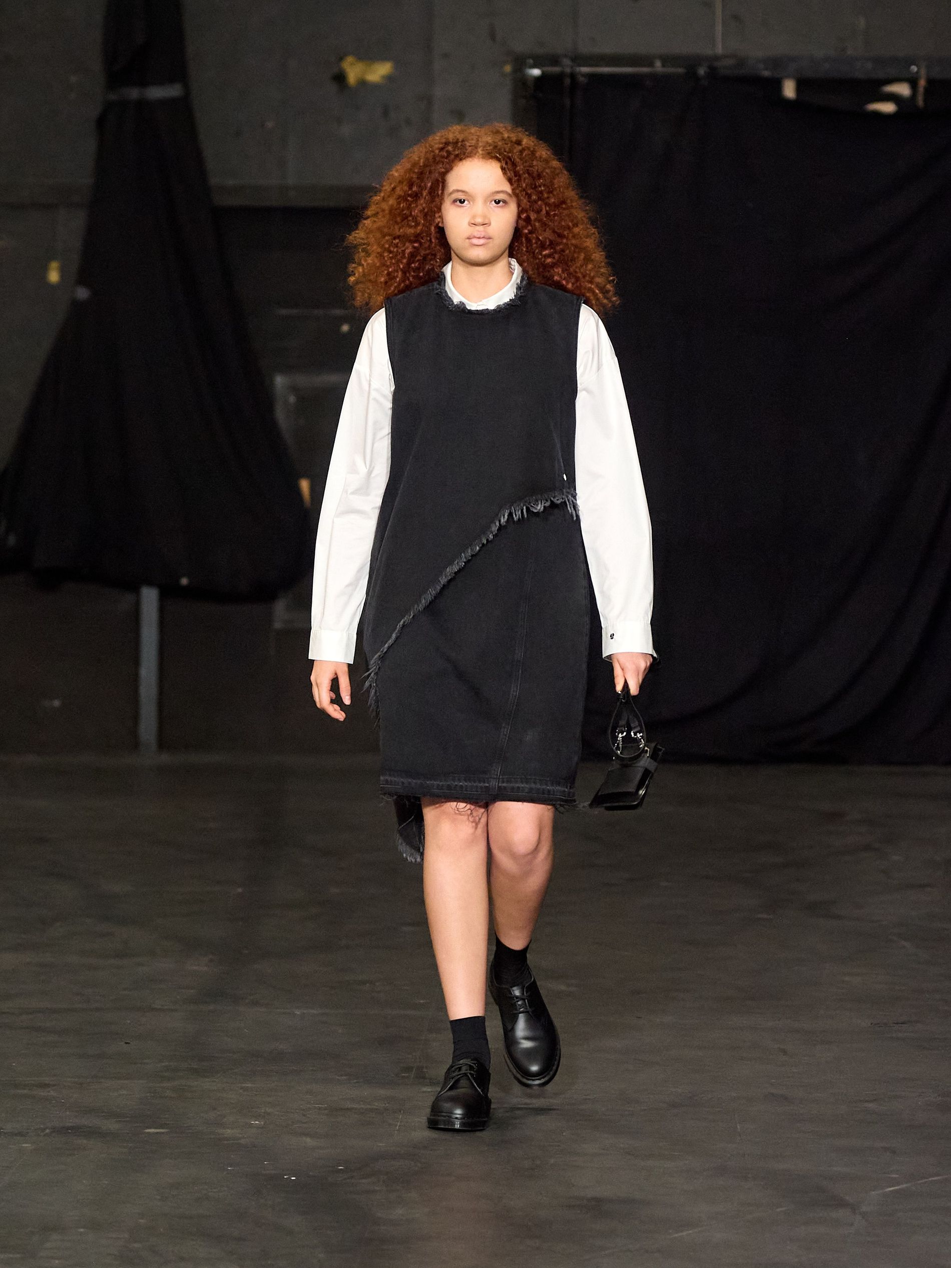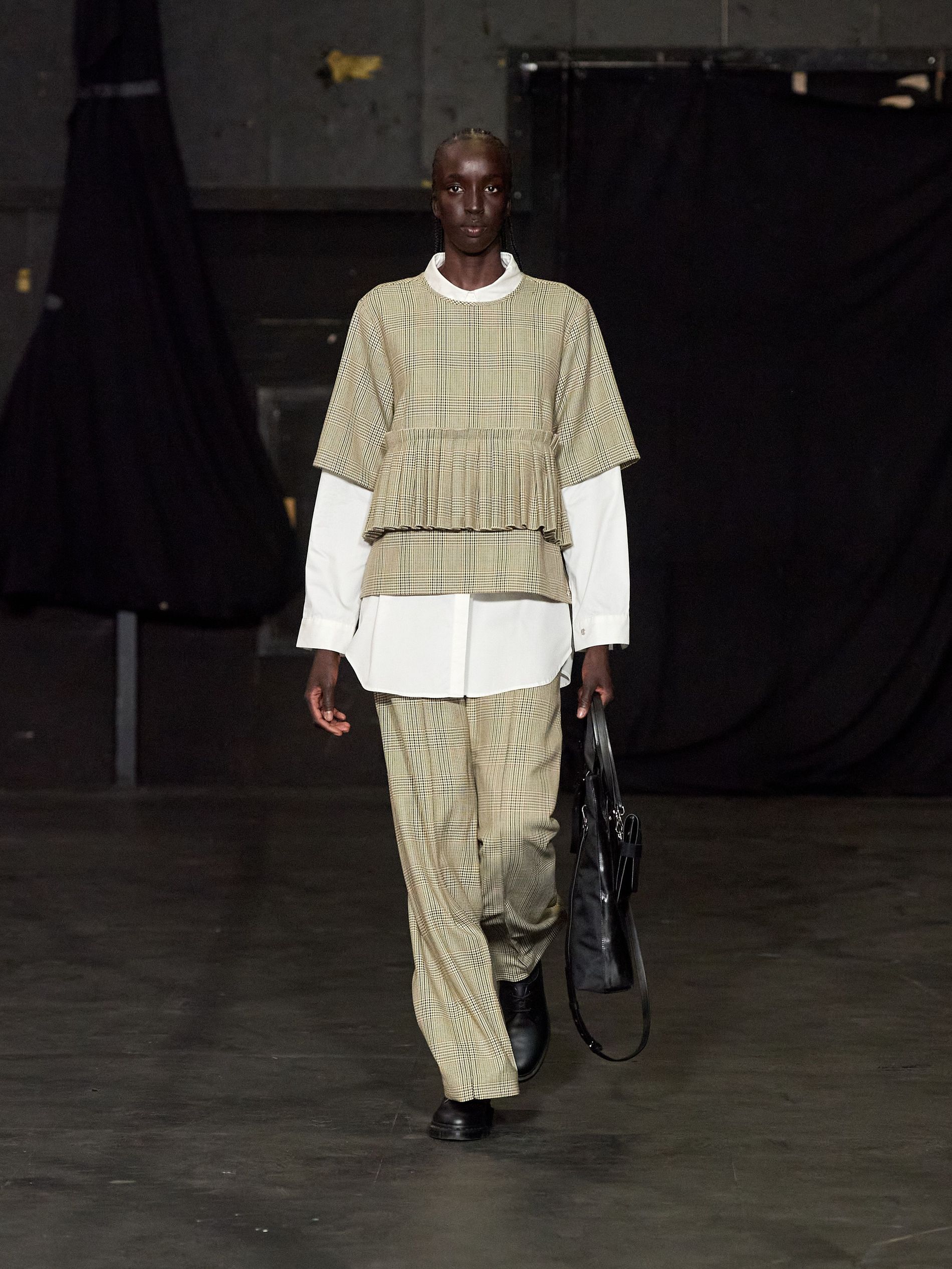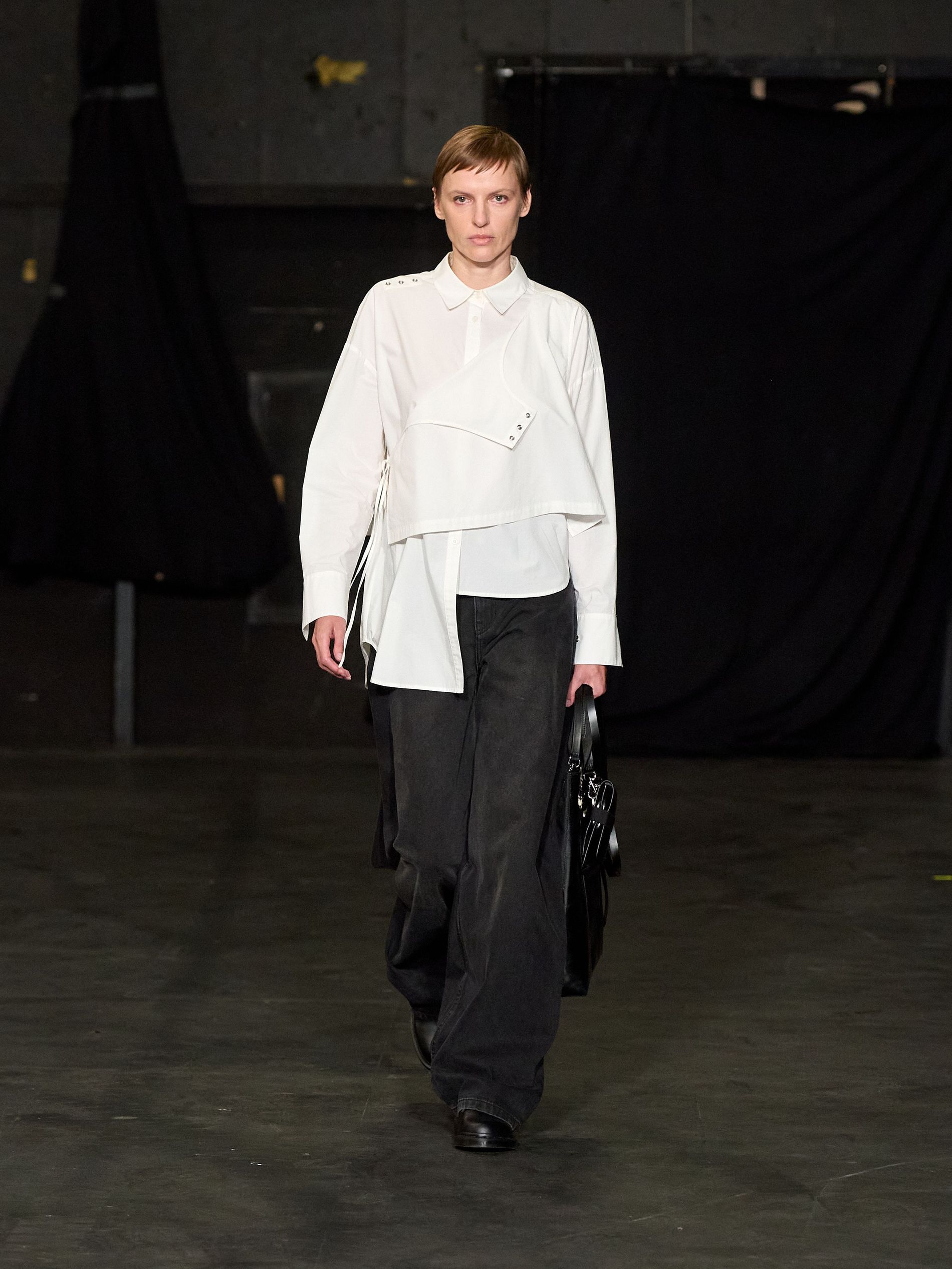 The garments (which, to emphasise their made-for-life ethos, are largely see-now-buy-now) build on that aforementioned design language, leaning more heavily into the notion of layers (both within the clothes themselves and via styling) and thoughtful asymmetry. A black pleated apron skirt, for instance, featuring a midi layer and a mini layer, is worn over relaxed trousers and apron shirts with tied sides (another feature of the Stel universe – adaptability and size inclusivity) is popped over a classic Oxford button-down. Any nods towards streetwear veer towards a more Japanese interpretation, where technical fabrics reign supreme (no Supreme pun intended). The barrel-legged cargo pants and matching padded bomber are sure to scratch the itch of long-time Astrid Andersen fans.