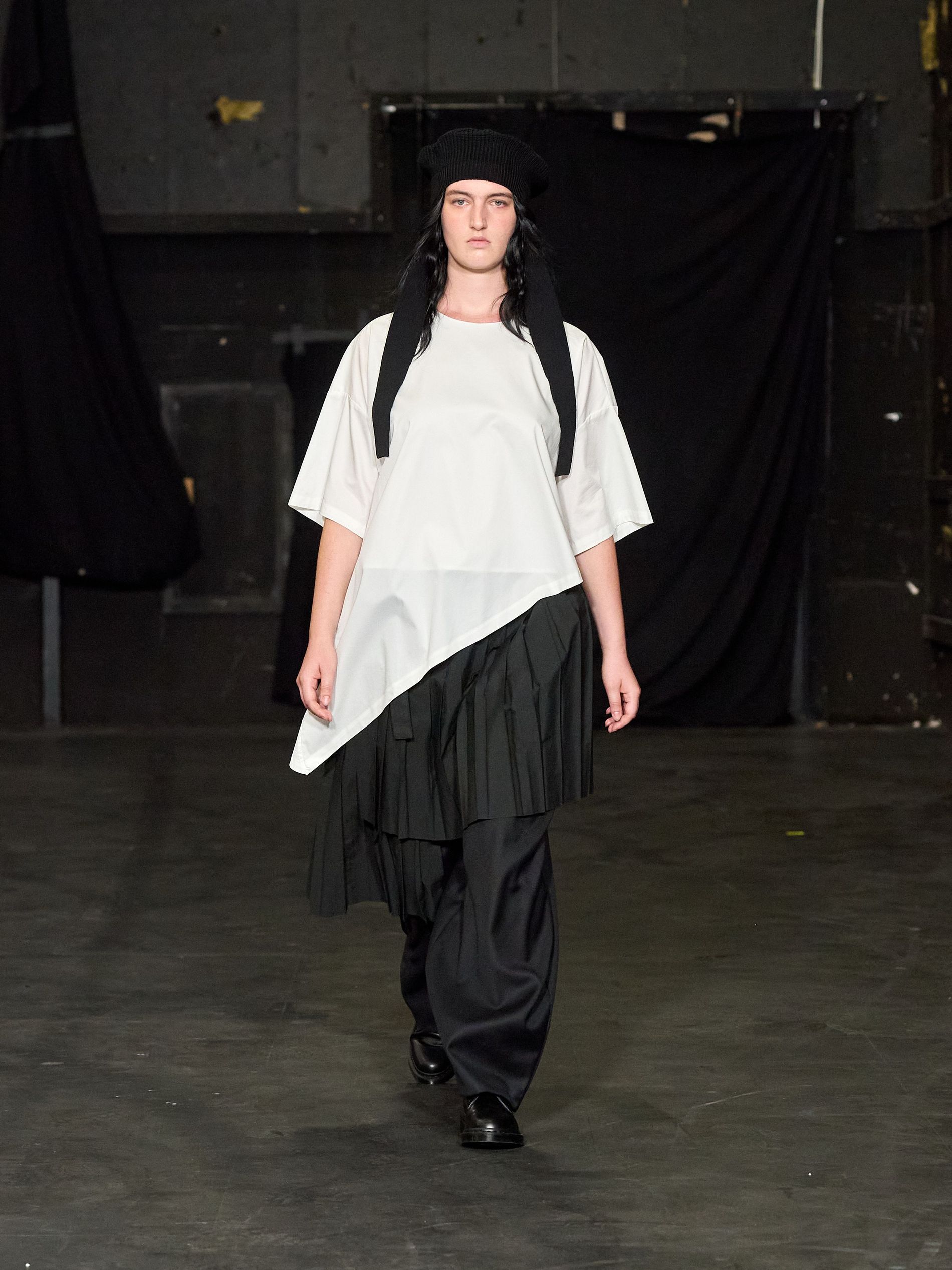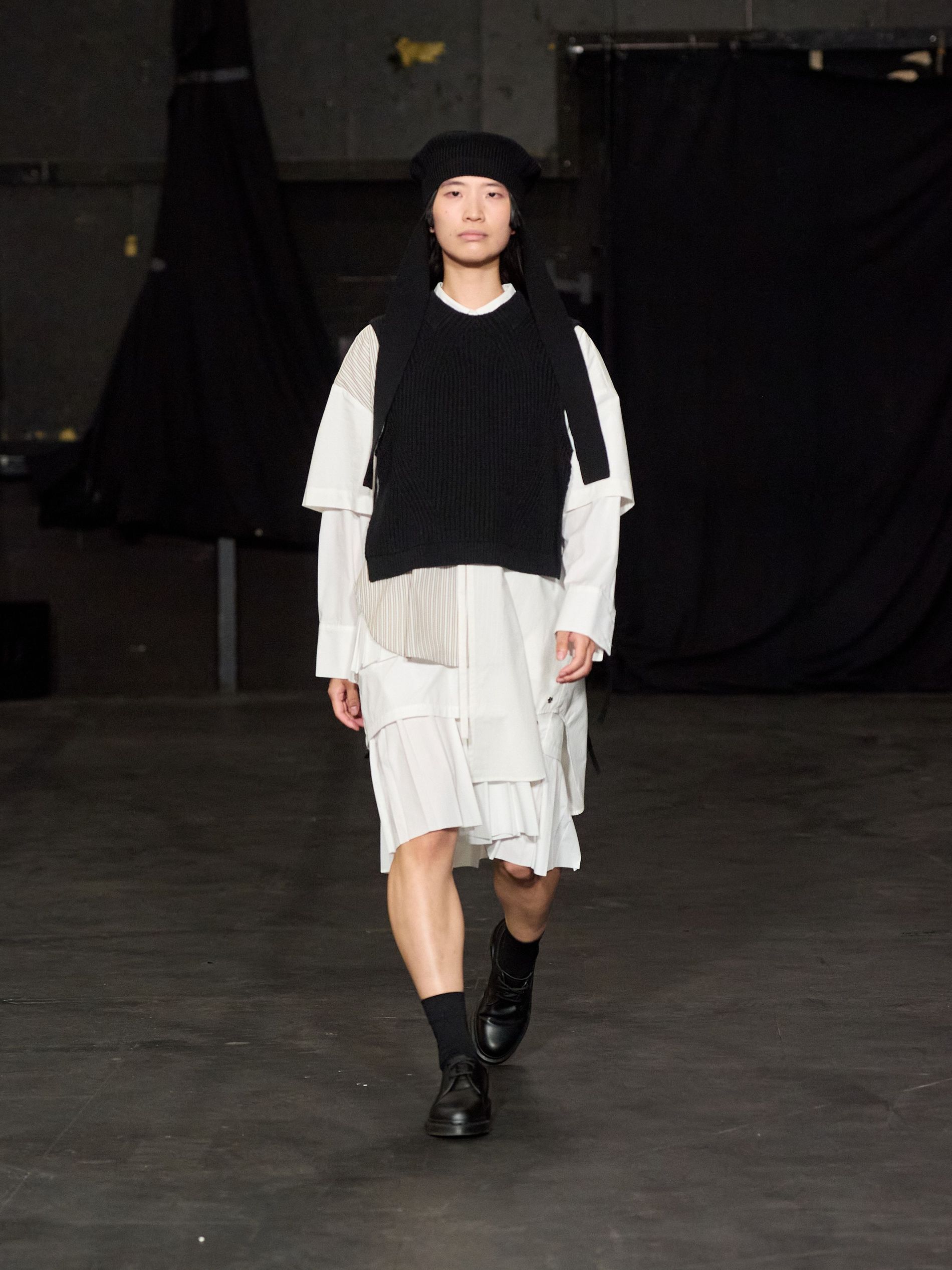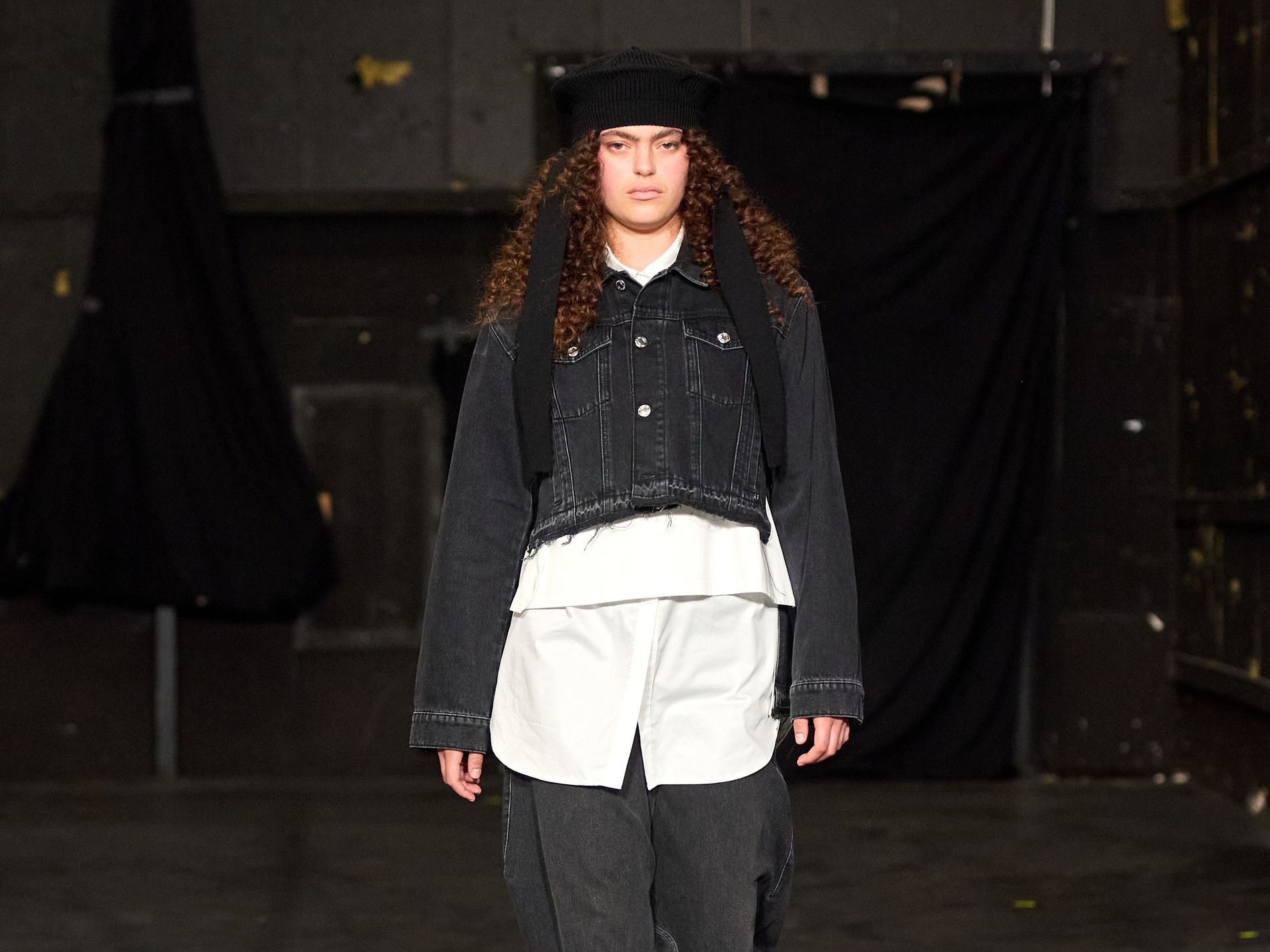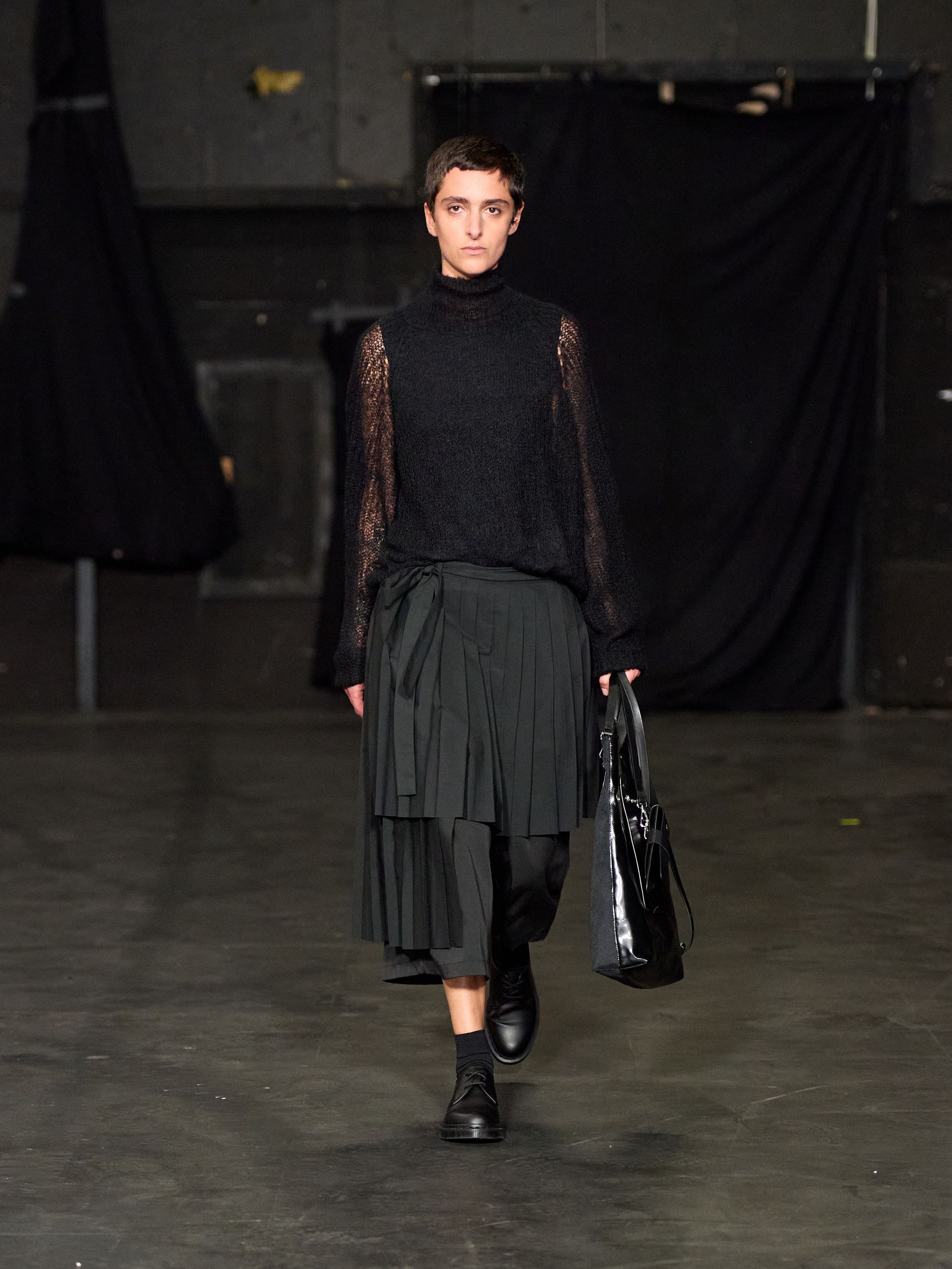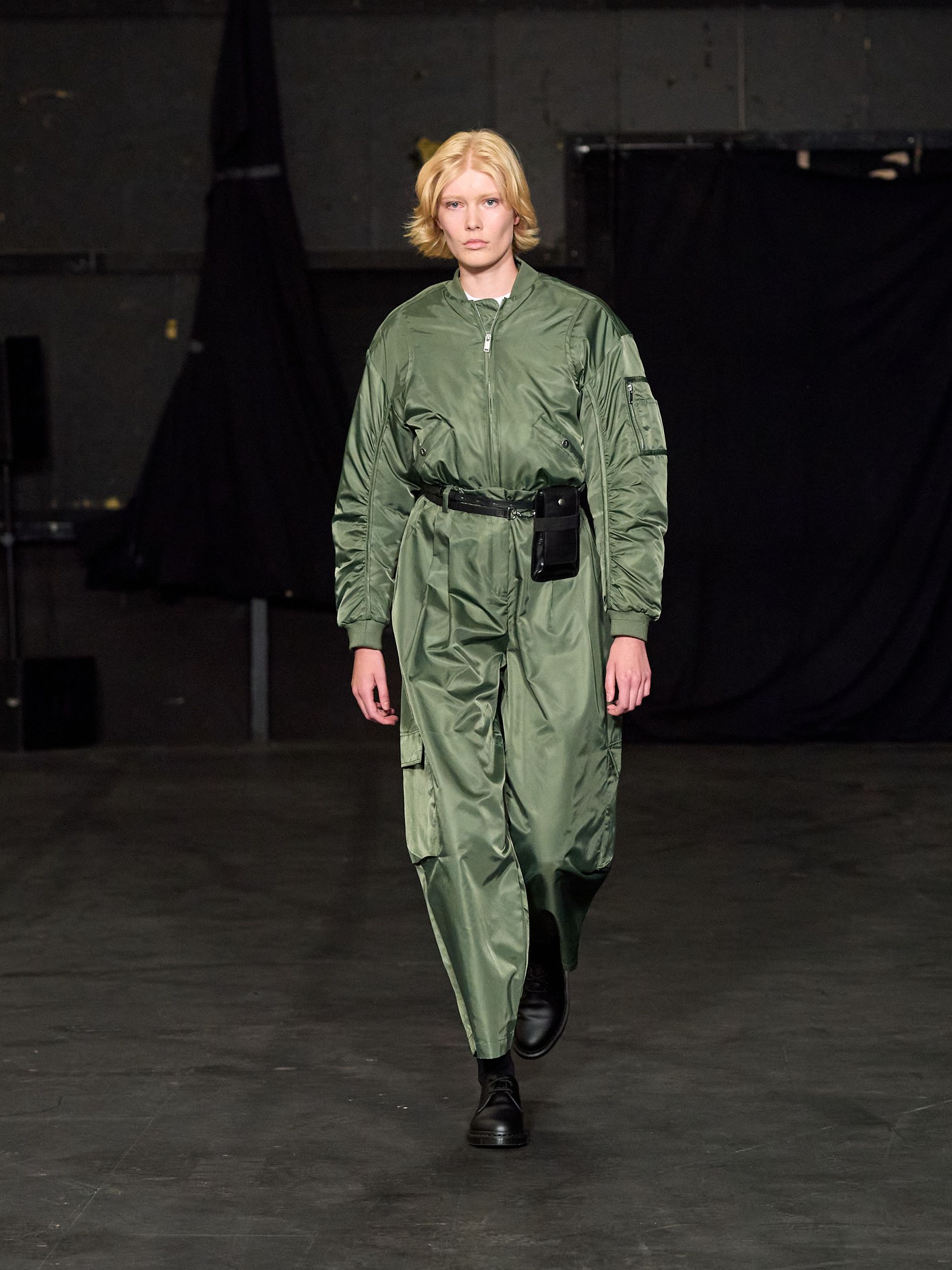 The garments (which, to emphasise their made-for-life ethos, are largely see-now-buy-now) build on that aforementioned design language, leaning more heavily into the notion of layers (both within the clothes themselves and via styling) and thoughtful asymmetry. A black pleated apron skirt, for instance, featuring a midi layer and a mini layer, is worn over relaxed trousers and apron shirts with tied sides (another feature of the Stel universe – adaptability and size inclusivity) is popped over a classic Oxford button-down. Any nods towards streetwear veer towards a more Japanese interpretation, where technical fabrics reign supreme (no Supreme pun intended). The barrel-legged cargo pants and matching padded bomber are sure to scratch the itch of long-time Astrid Andersen fans.
