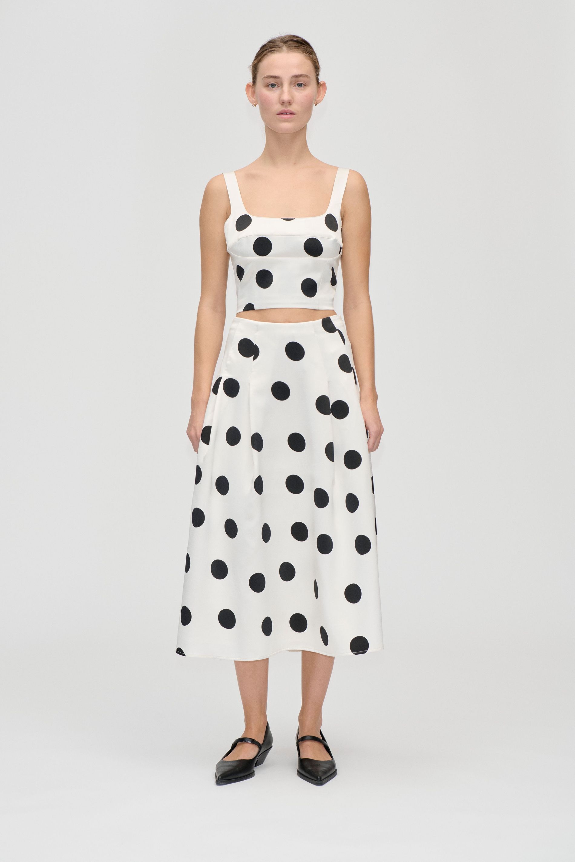Created in collaboration with the show’s costume team, the look features a structured bustier top and fluid A-line skirt, both rendered in a bold polka dot print. Constructing the set in heavy silk, meanwhile, adds a touch of luxury well-suited to the occasion. “The cut is intentionally simple, allowing the print and the fabric to speak,” says Goya. “It felt perfect for her arrival in Venice, a new chapter, and a new city for her.” Emily accessorised the look with white cat eye sunglasses and chunky gold hoops, her hair swept back in an elegant bun. It was a moment so iconic, it made the first press stills of the season.