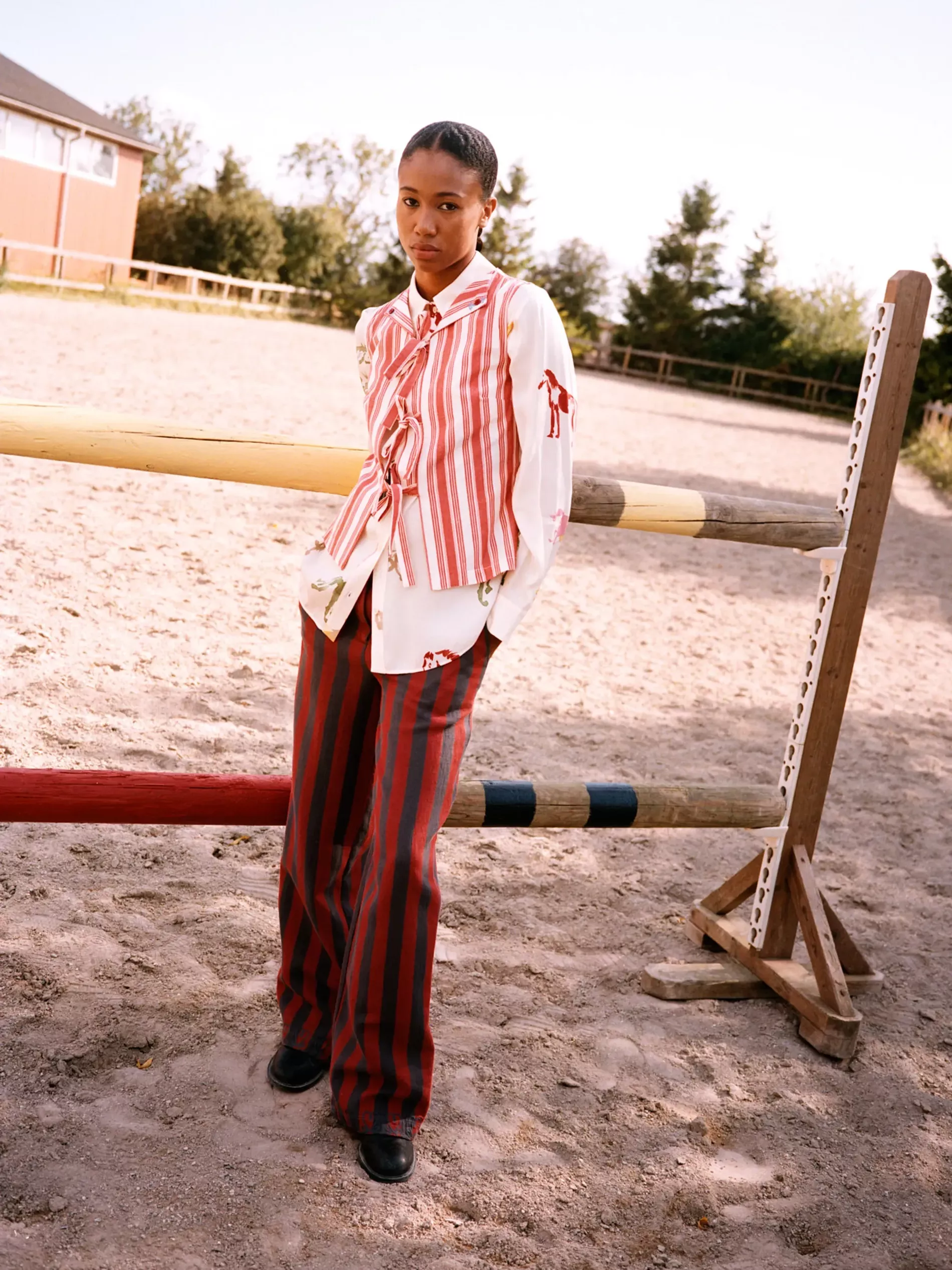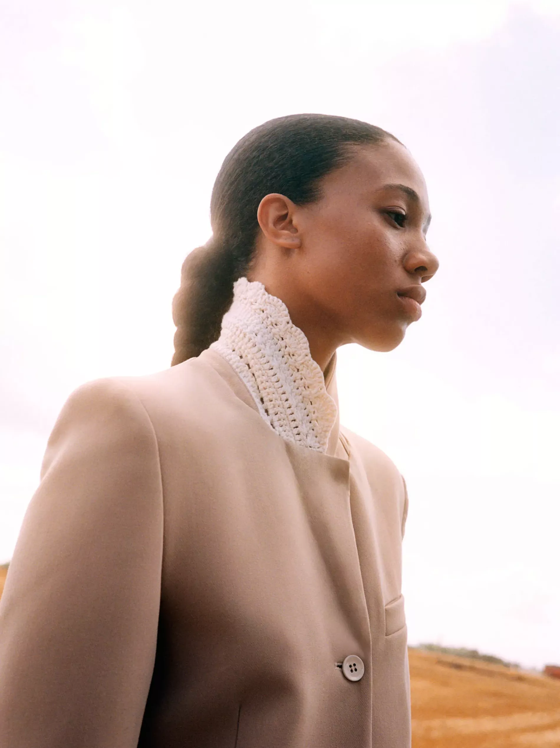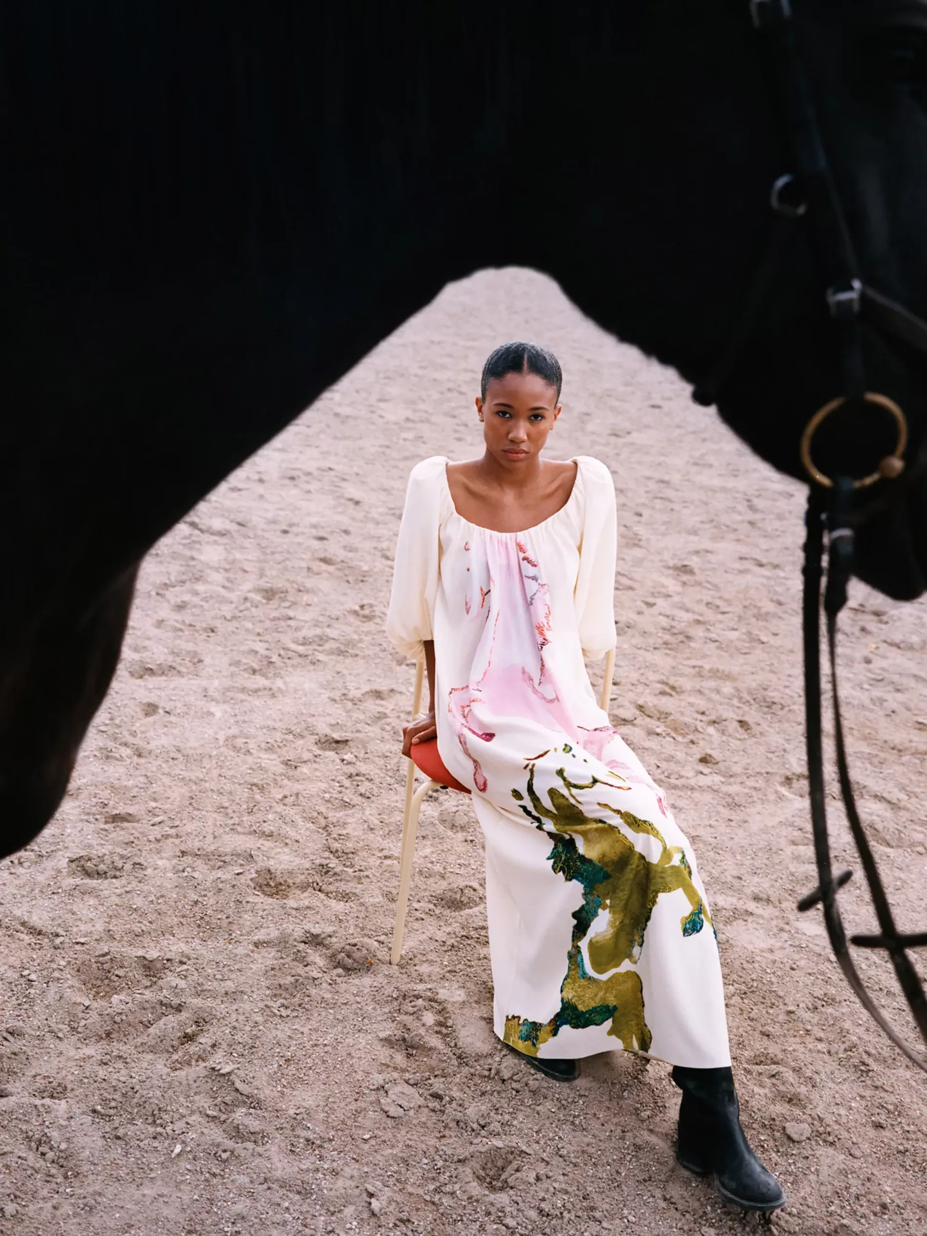 The backstory for spring probably made sense on the mood board but was overcomplicated in the telling. The team imagined a traveler arriving at an 18th-century country house by horse (which explains the equine print and patterns). Overlaid on this were references to Jane Austen and Oscar Wilde. The garments got to the point more directly. Ceramic buttons, crochet (used on half collars), an engaging print of porcelain plates, and a monogram like you might find on a linen napkin conveyed the world-of-interiors theme with various levels of subtlety. “All of the details have come from this world that you feel like you are looking into,” said Goya of the wondrous voyeurism allowed by being hosted in someone’s house. “You can recognise something, but it’s not your own.”