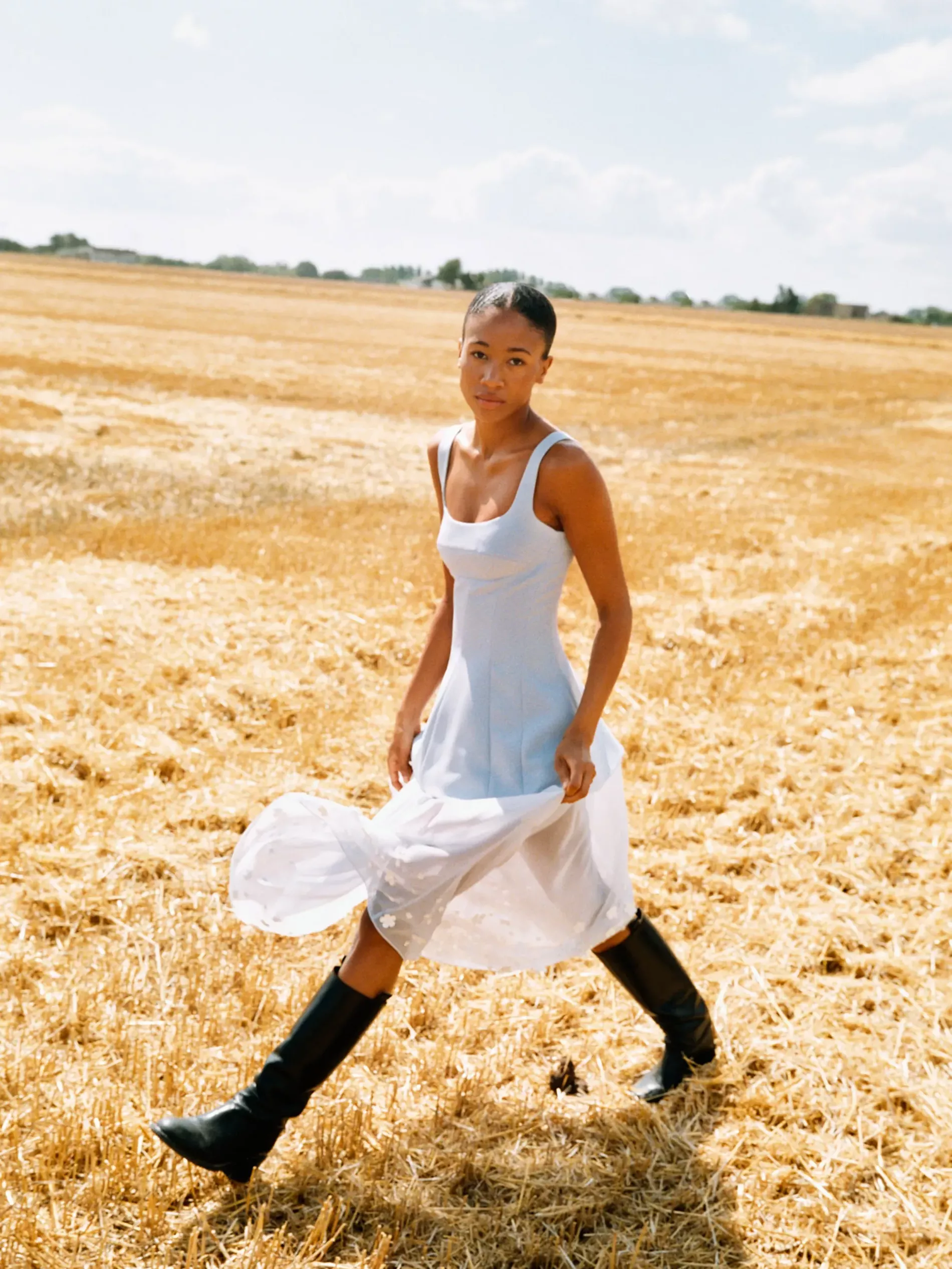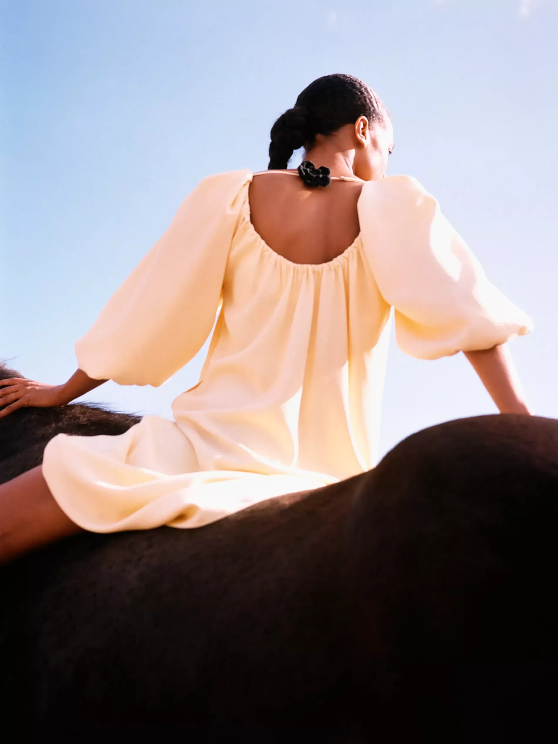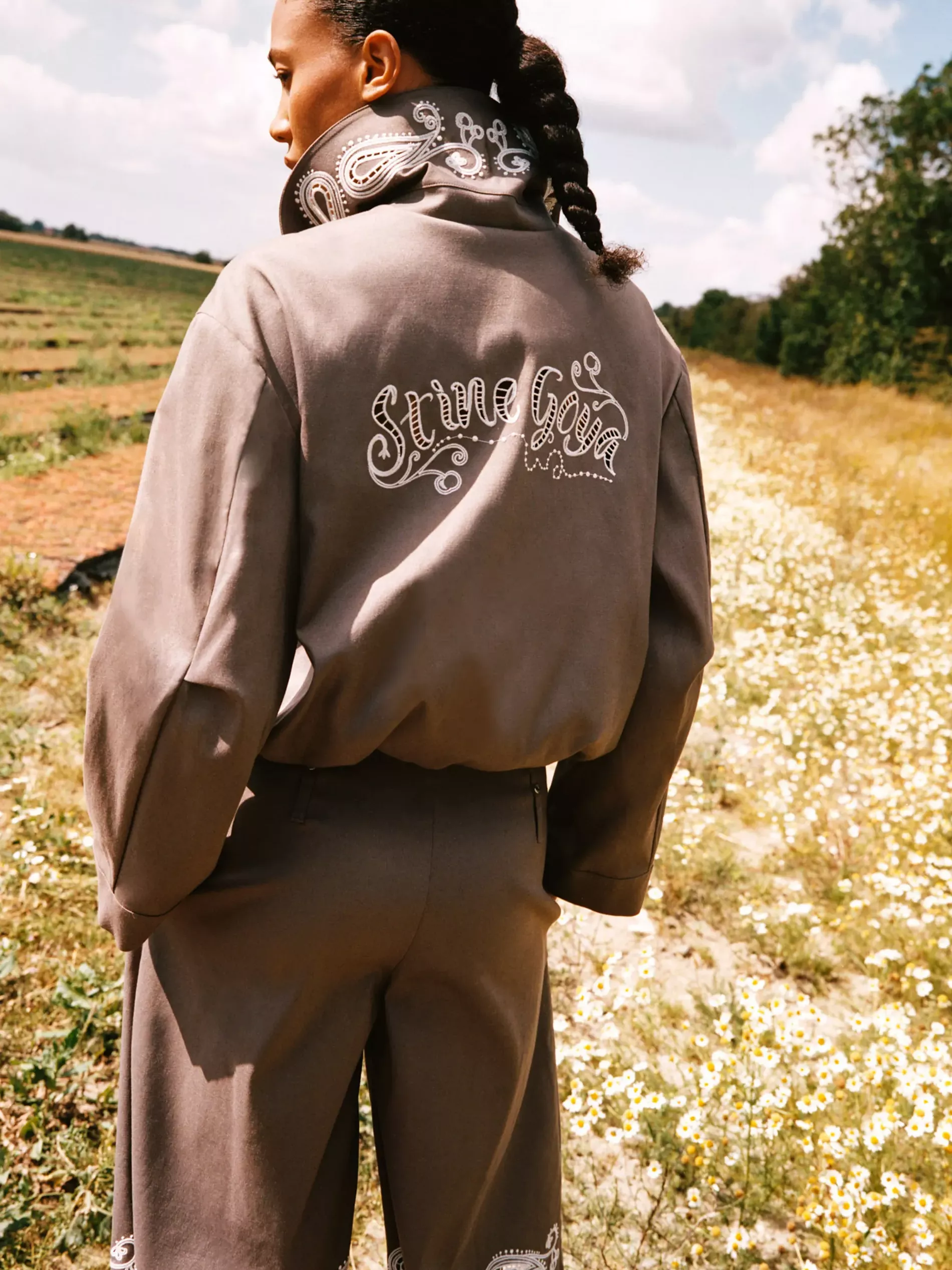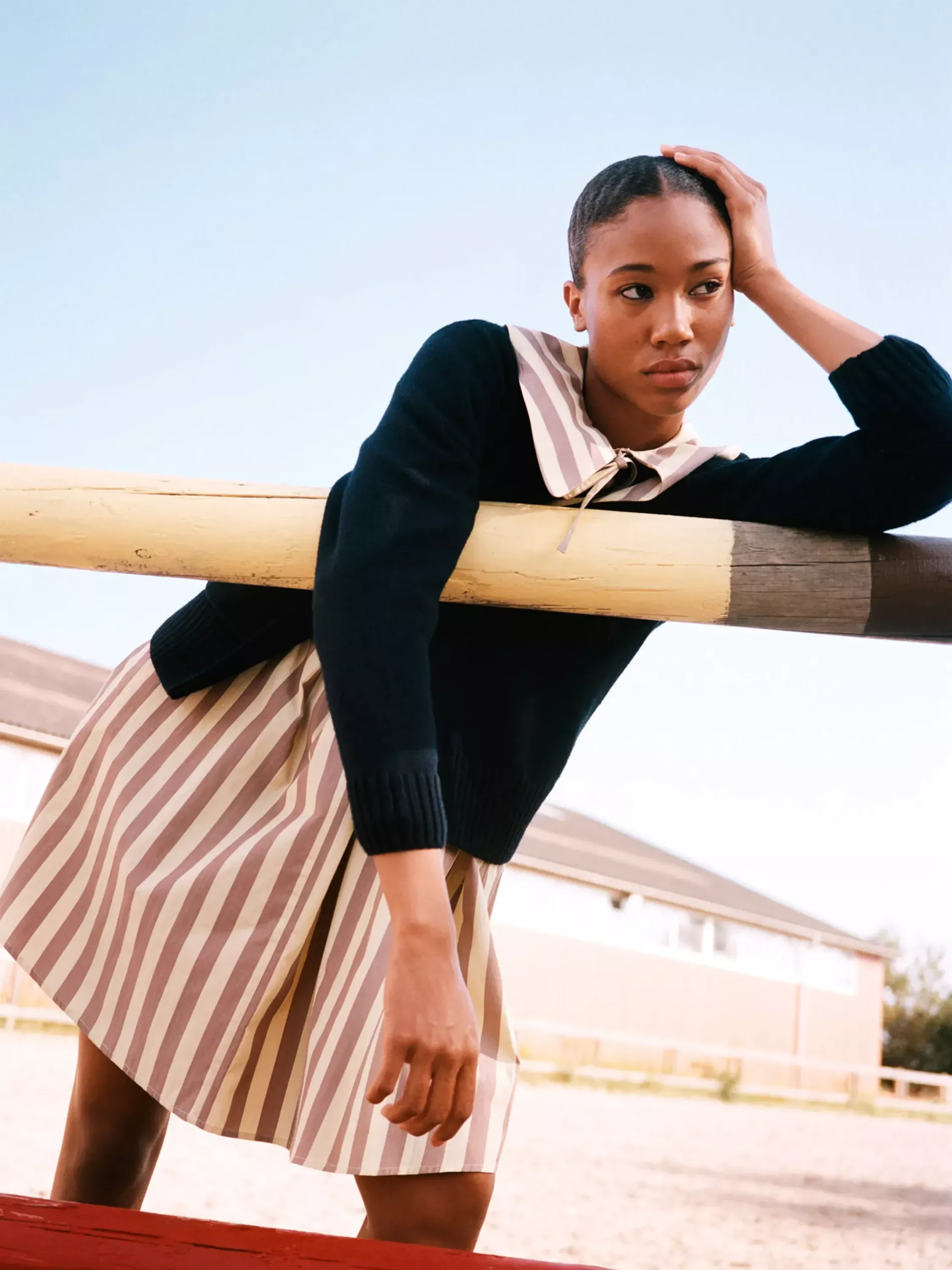 The backstory for spring probably made sense on the mood board but was overcomplicated in the telling. The team imagined a traveler arriving at an 18th-century country house by horse (which explains the equine print and patterns). Overlaid on this were references to Jane Austen and Oscar Wilde. The garments got to the point more directly. Ceramic buttons, crochet (used on half collars), an engaging print of porcelain plates, and a monogram like you might find on a linen napkin conveyed the world-of-interiors theme with various levels of subtlety. “All of the details have come from this world that you feel like you are looking into,” said Goya of the wondrous voyeurism allowed by being hosted in someone’s house. “You can recognise something, but it’s not your own.”