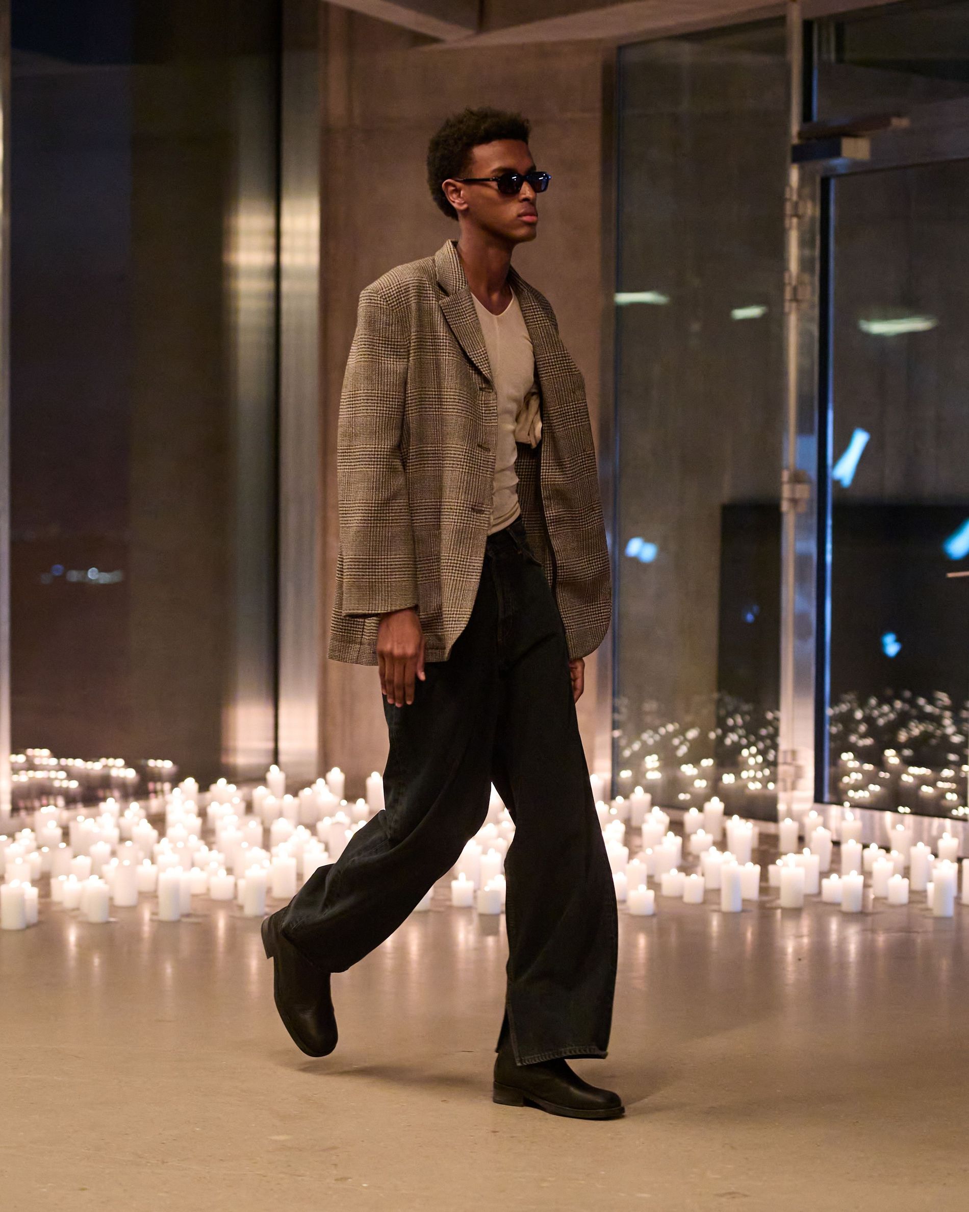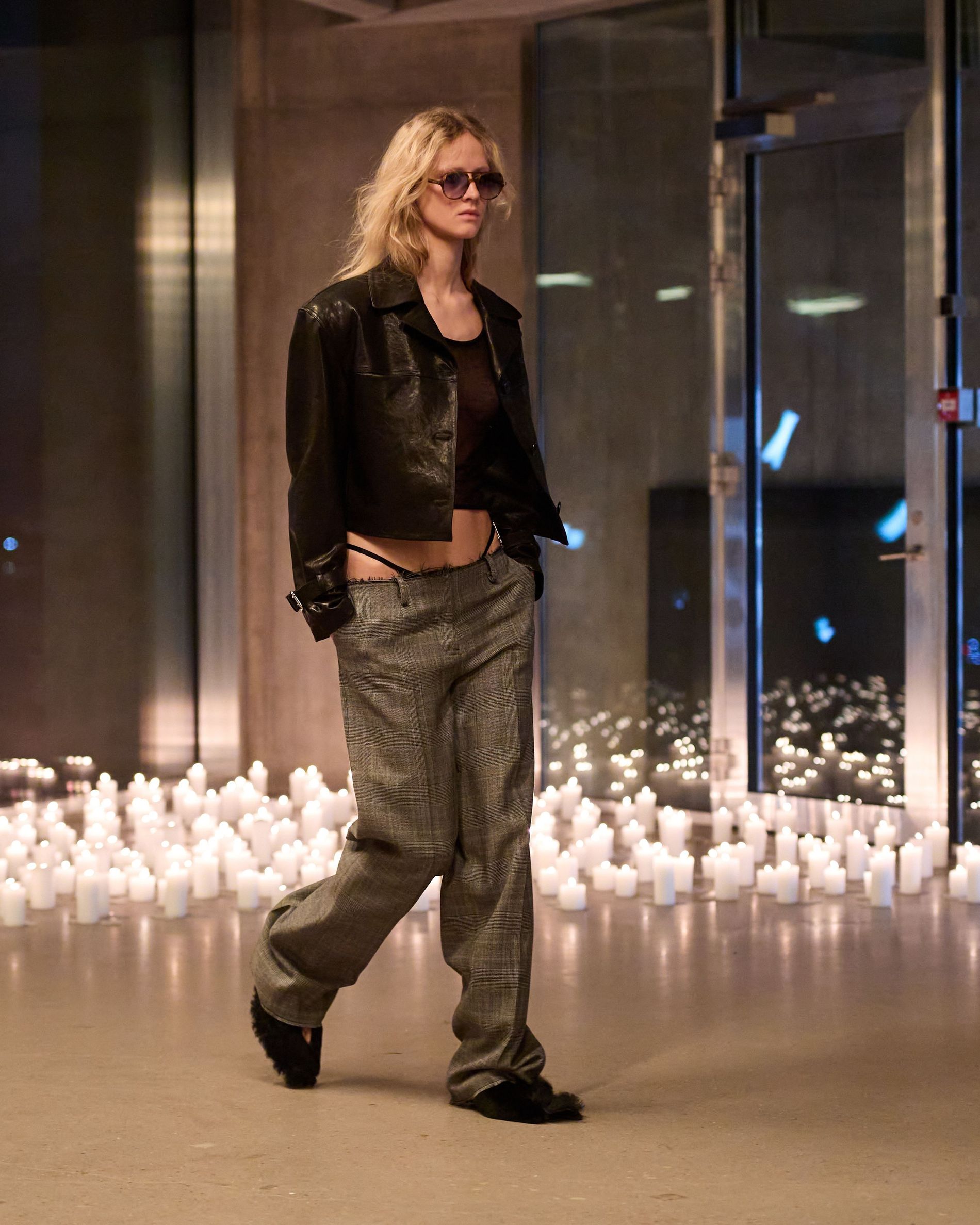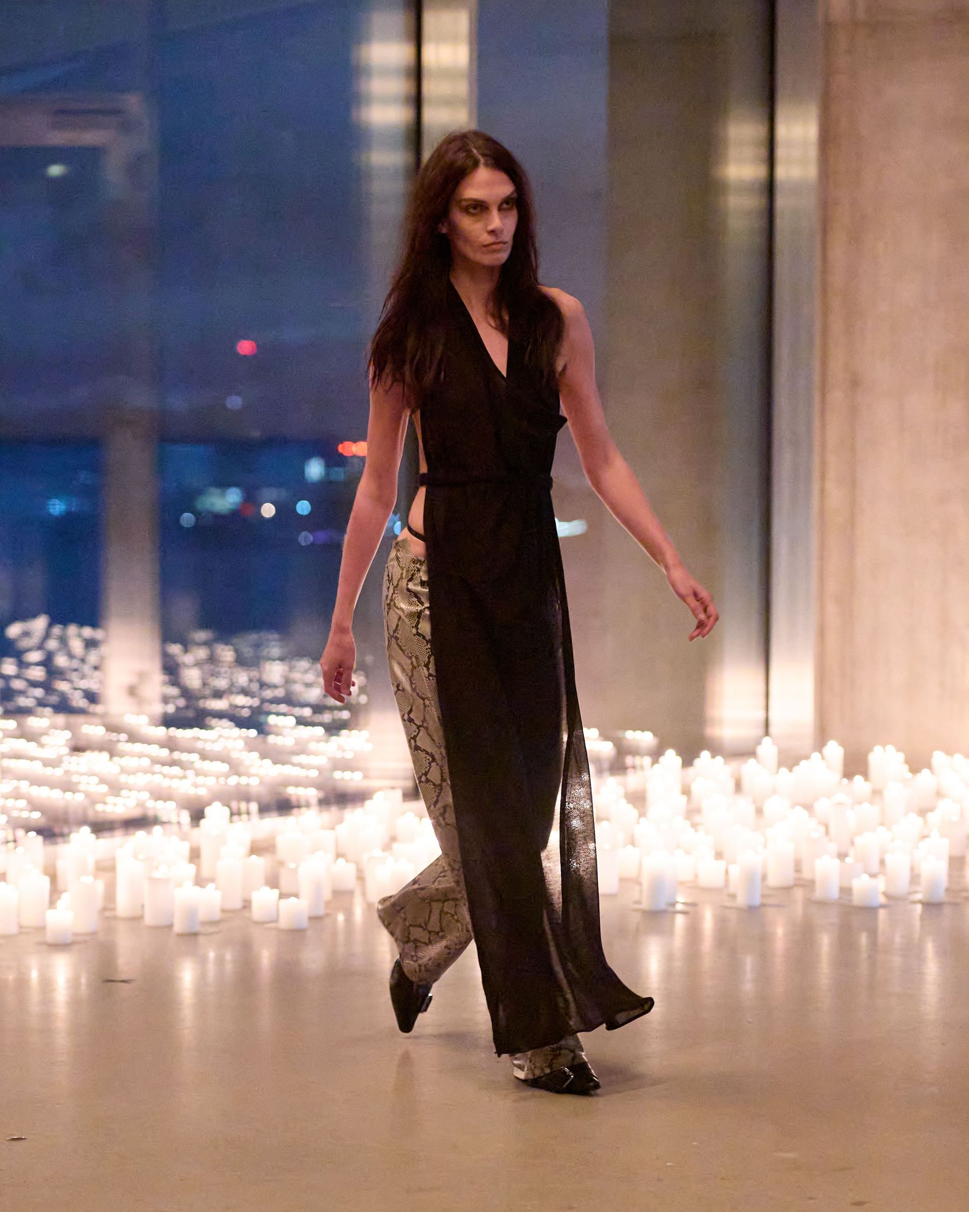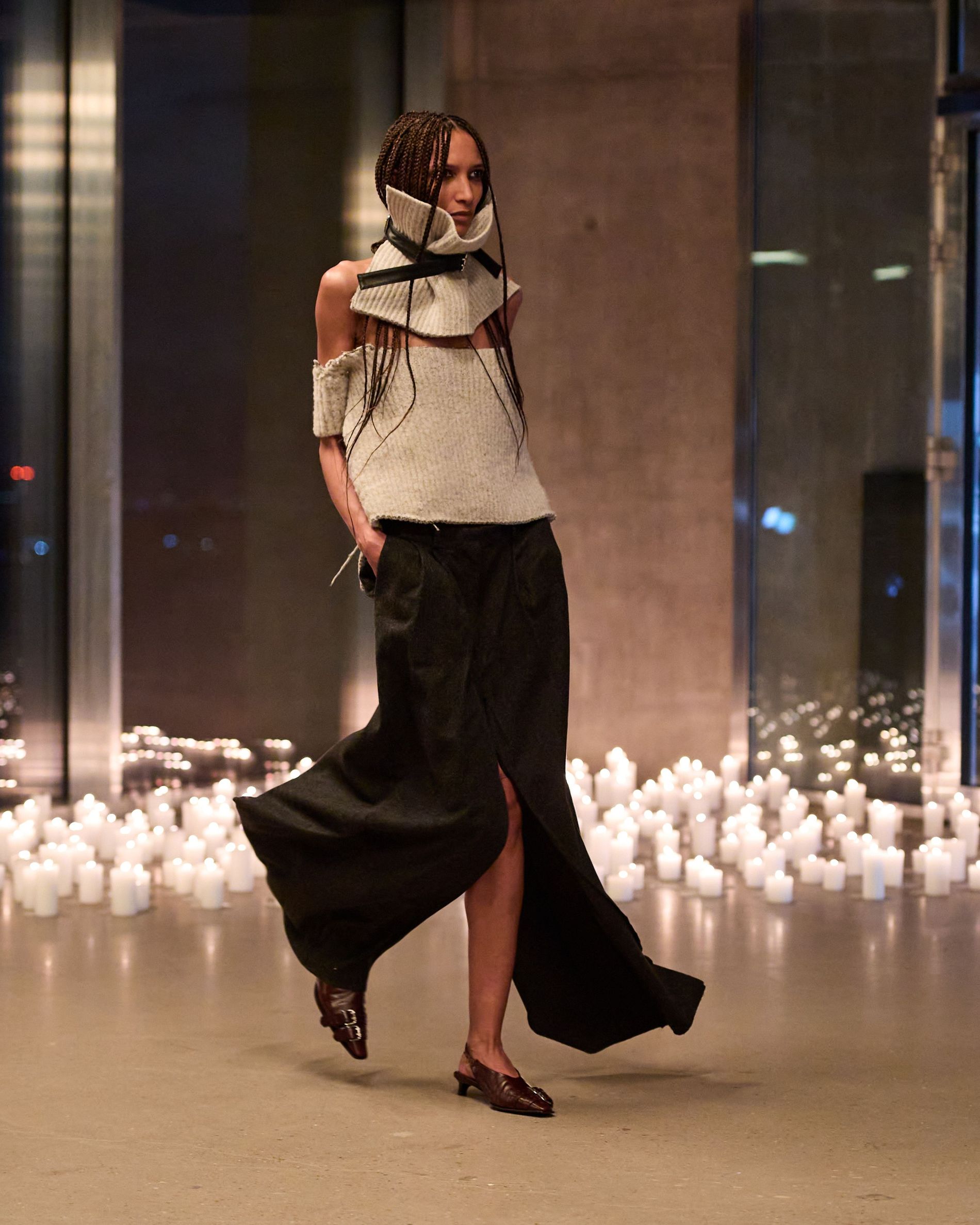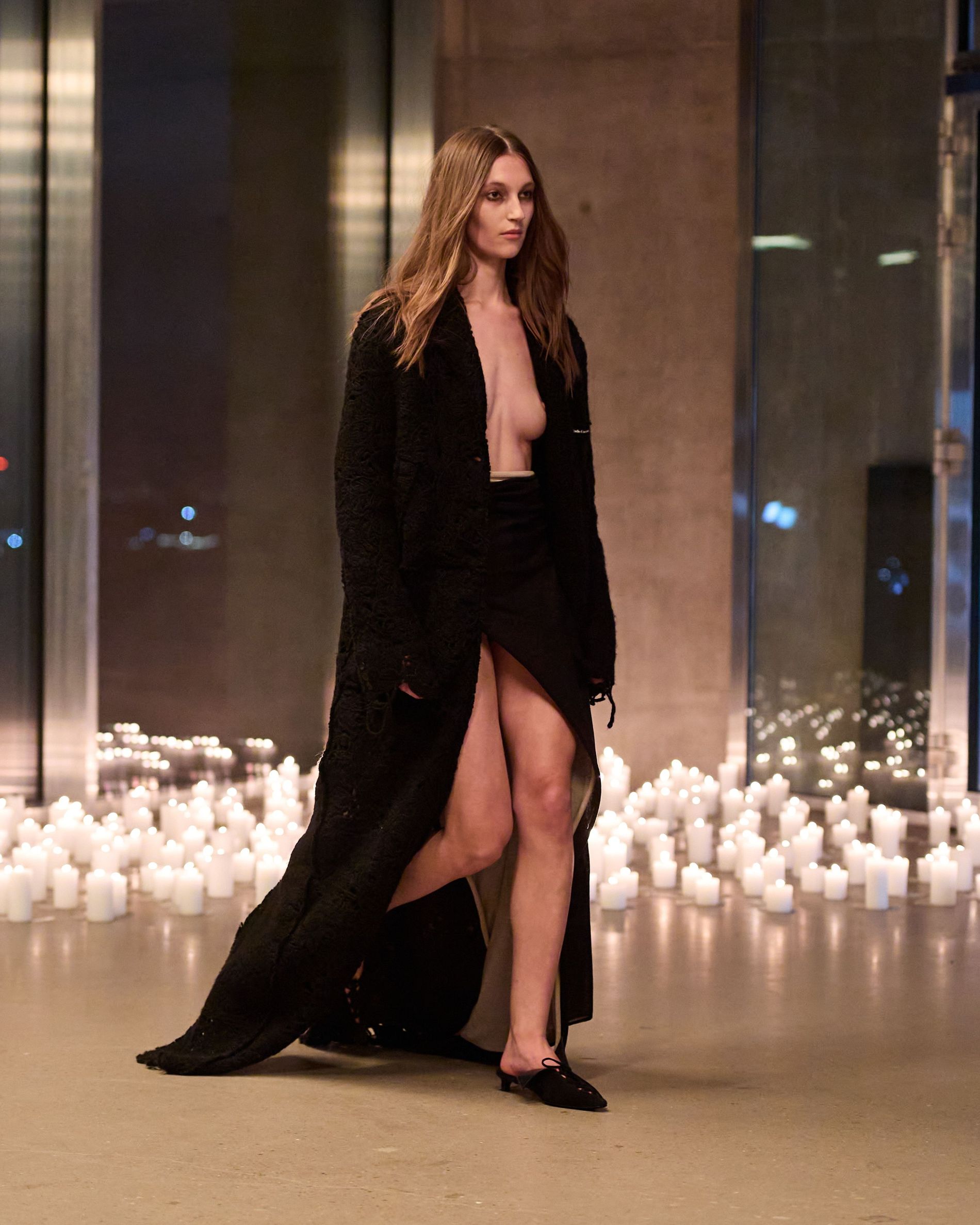 For its CPHFW debut, Swedish brand Studio Constance certainly set a mood. Held in an expressive concrete-floored room with water-facing floor to ceiling windows (the space is within the Bjarke Ingels Group HQ), a sea of candles flickered along one wall as ominous base-heavy music played. “The collection comes from this raw, deep, dark emotional standpoint,” says founder Rebecca Dovenryd Almberg. “It’s inspired by my emotional state right now.”