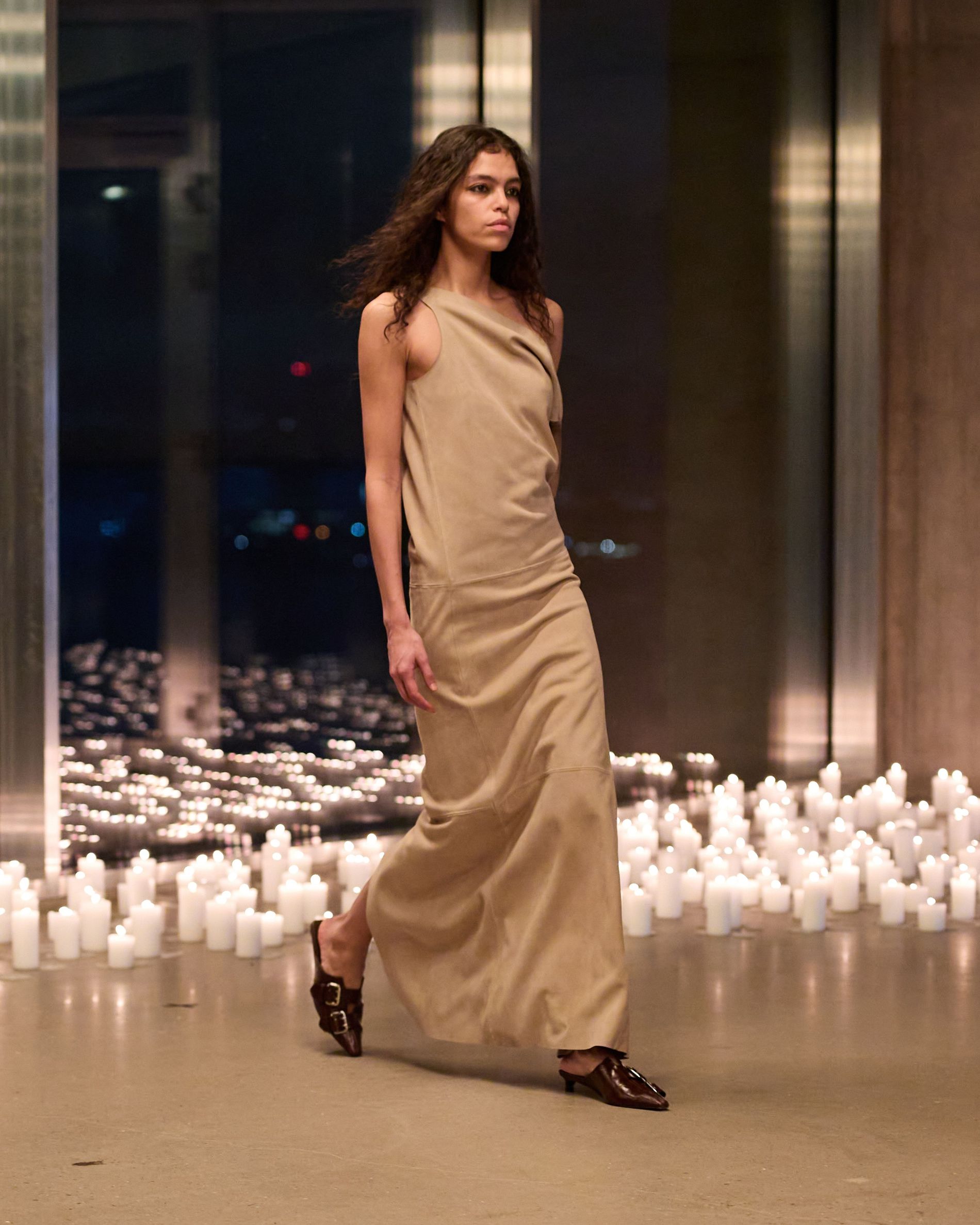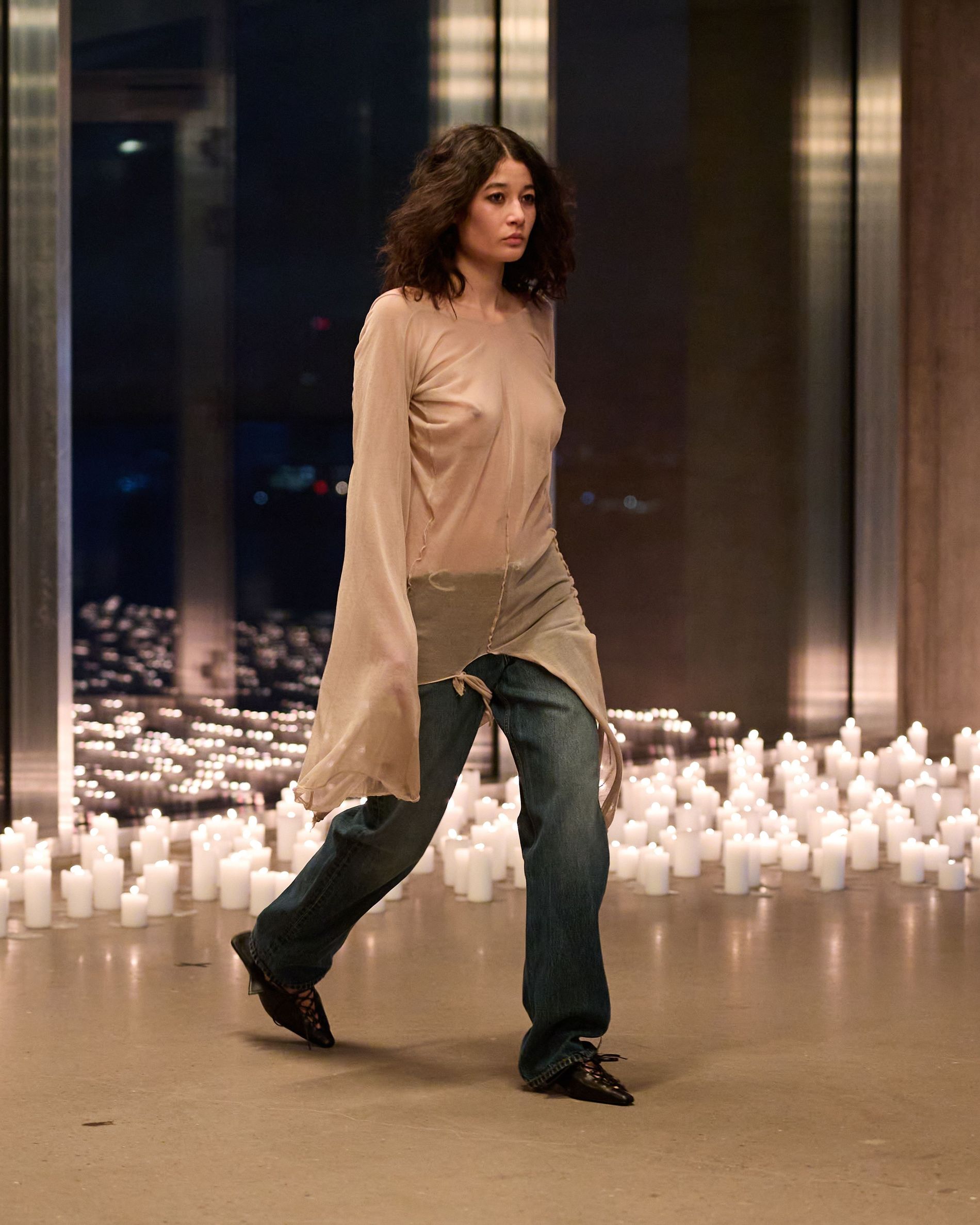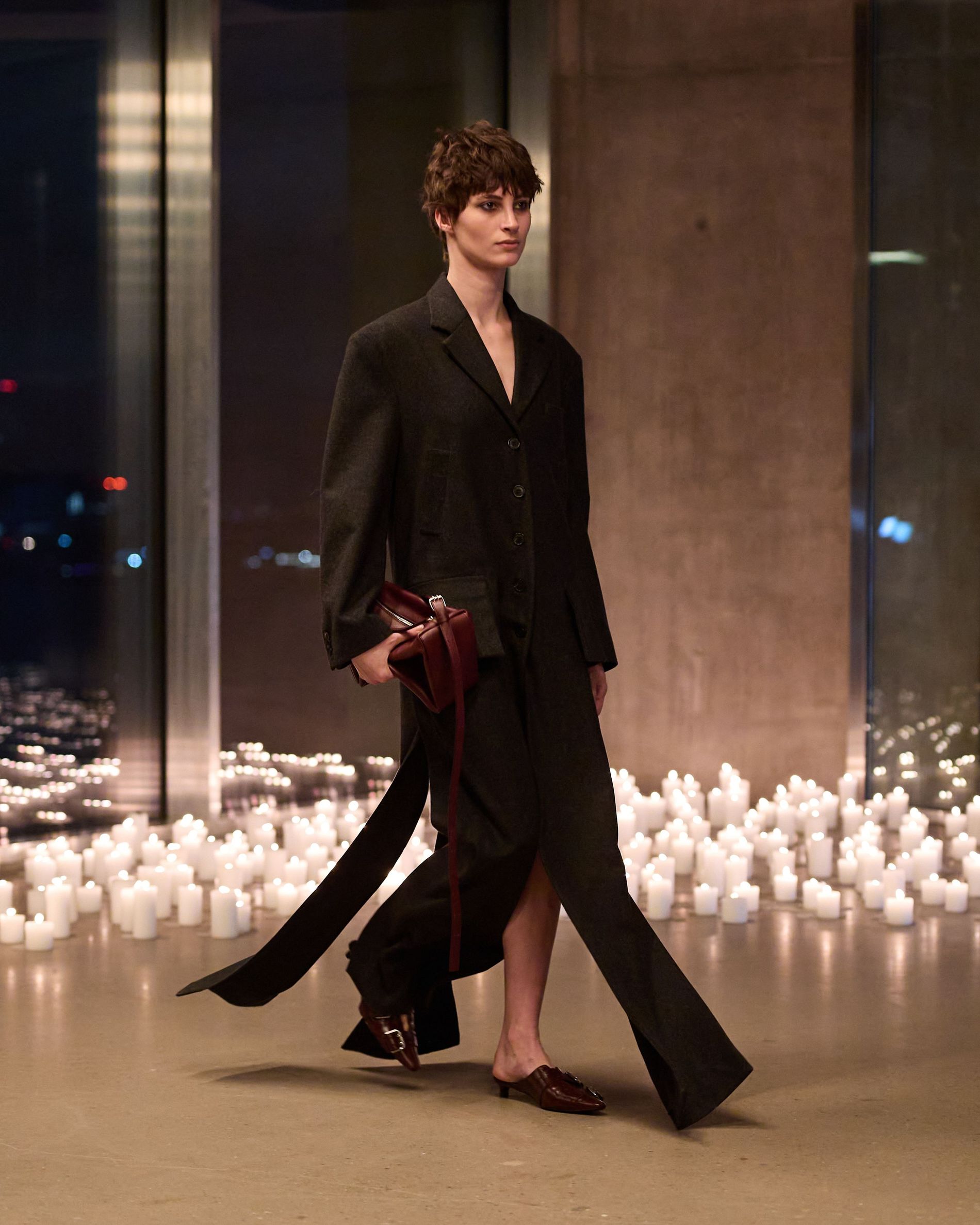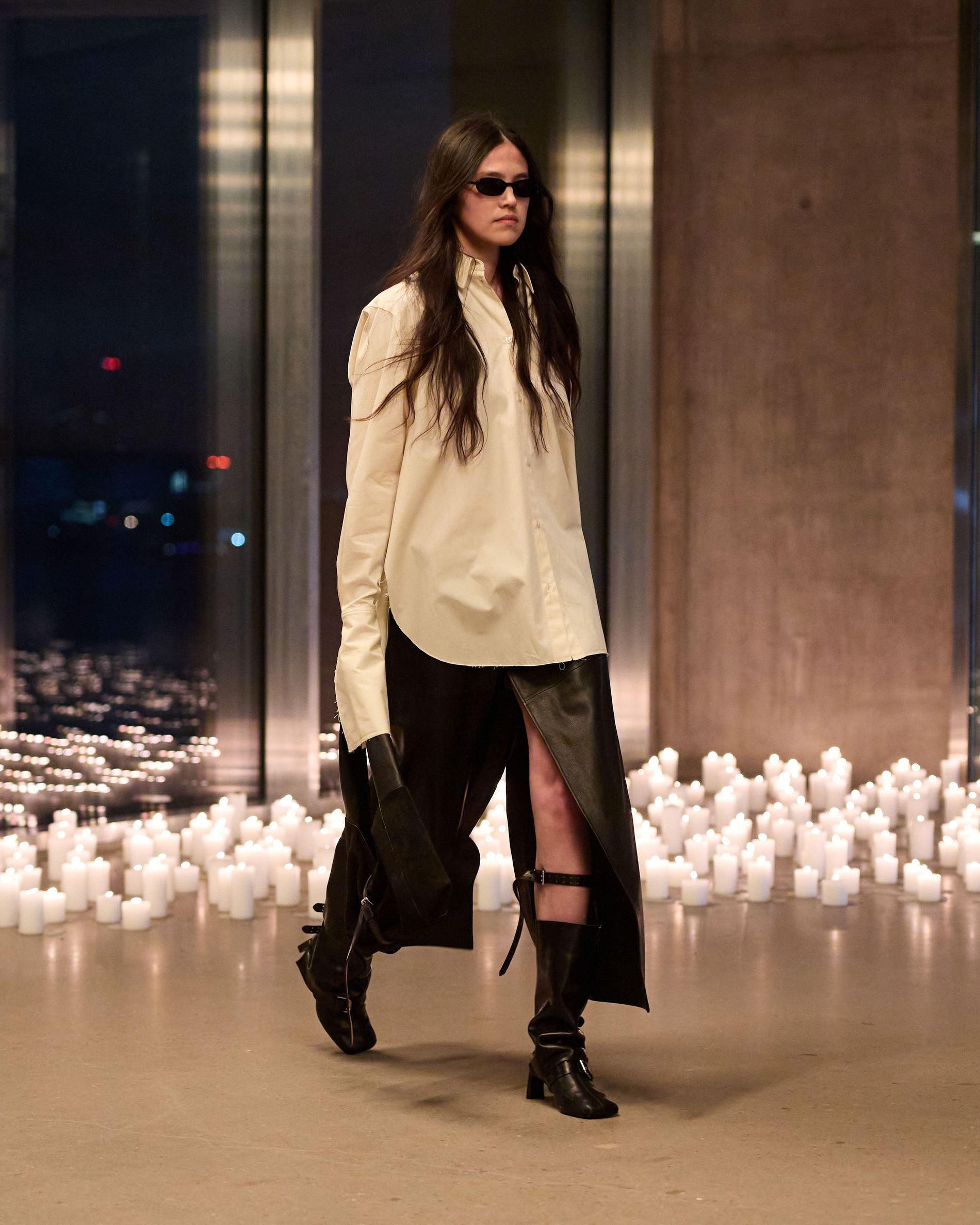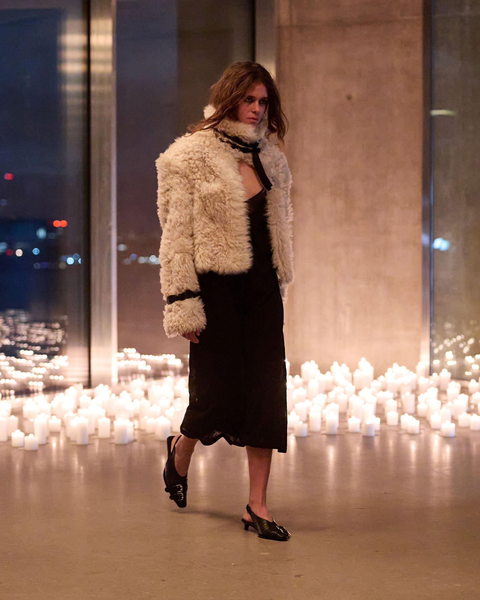 For its CPHFW debut, Swedish brand Studio Constance certainly set a mood. Held in an expressive concrete-floored room with water-facing floor to ceiling windows (the space is within the Bjarke Ingels Group HQ), a sea of candles flickered along one wall as ominous base-heavy music played. “The collection comes from this raw, deep, dark emotional standpoint,” says founder Rebecca Dovenryd Almberg. “It’s inspired by my emotional state right now.”
