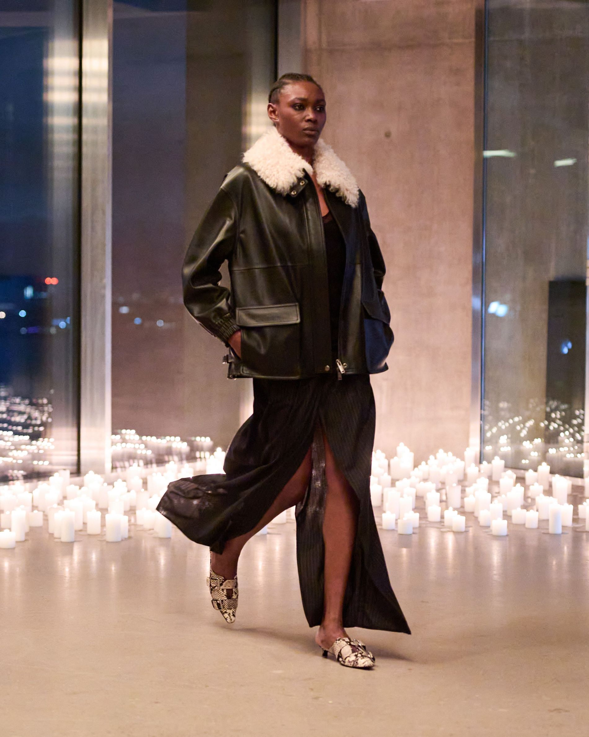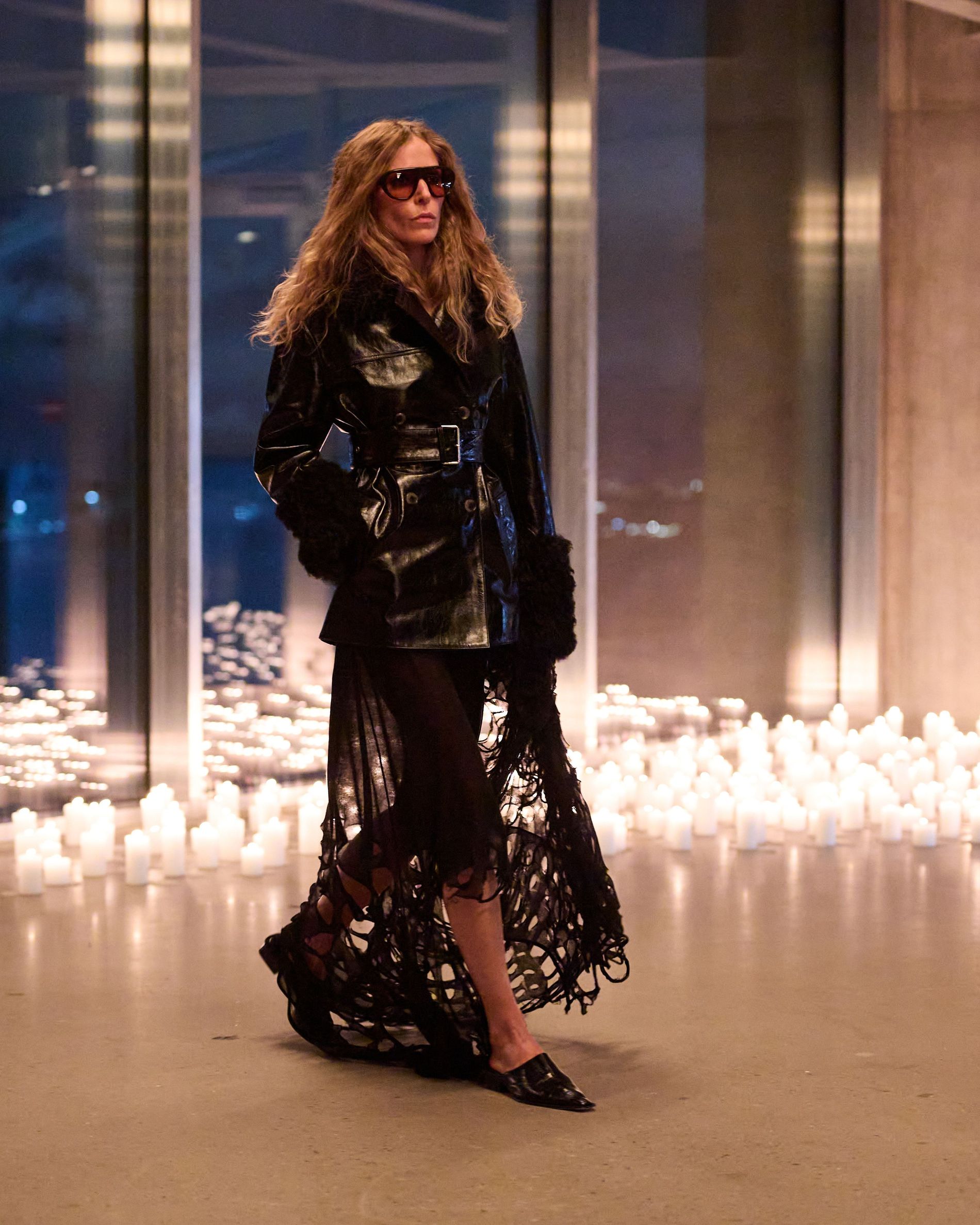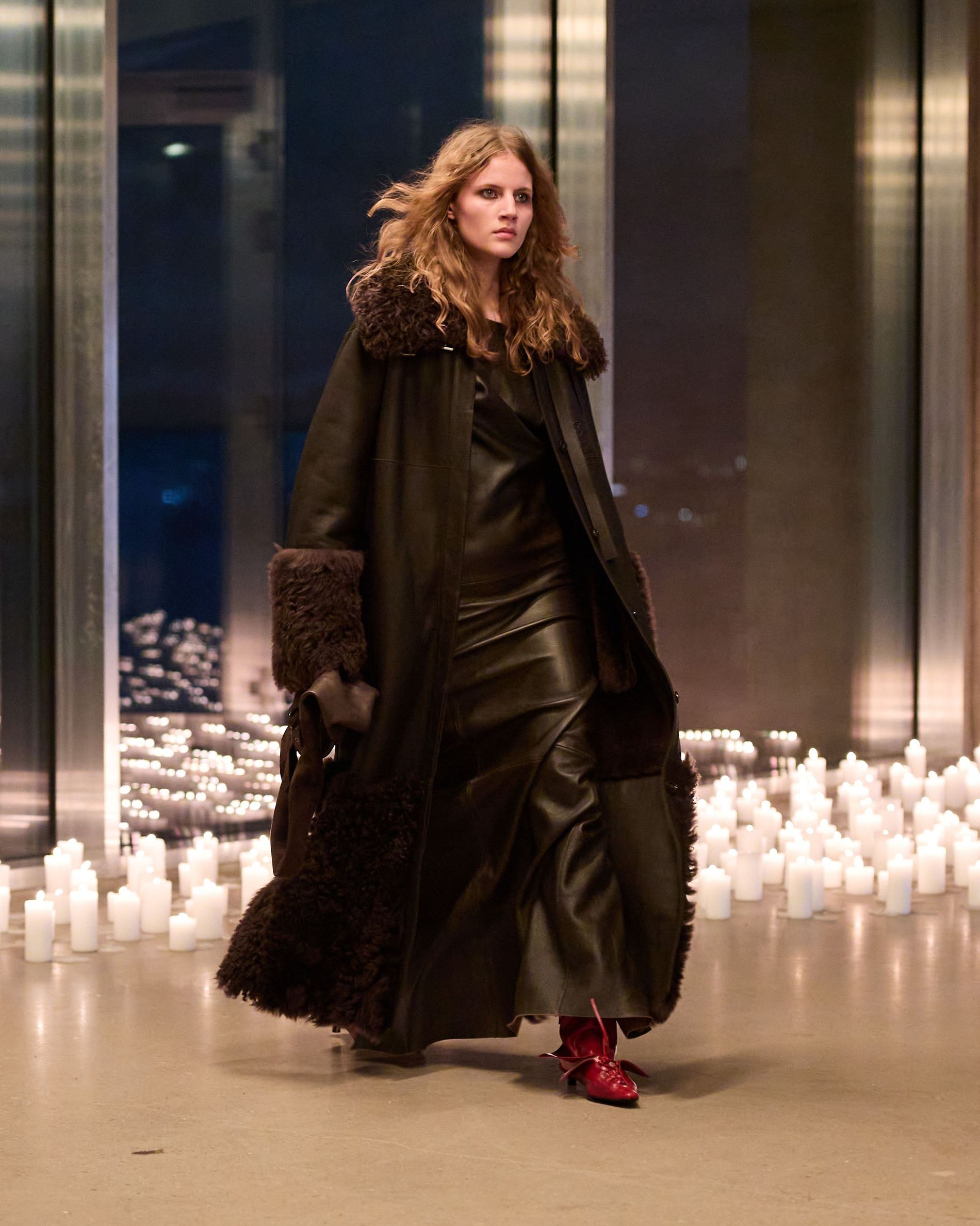 Those already familiar with Constance came anticipating the outerwear. Both the delicious buttery leather trench coat, complete with detachable curly shearling hood, and the floor-sweeping overcoat fashioned from leftover felted yarn are instantly covetable (particularly this week, when the weather leaves something to be desired).