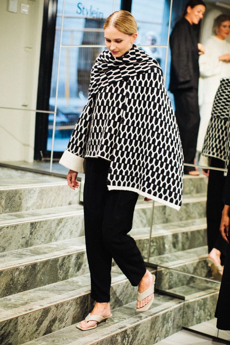 The brand explained during their Stockholm Fashion Week presentation that instead of drawing inspiration from tangiable things, people or popular culture, they aim to create a world inhabited by their muse. For the spring/summer 2022 collection she started her summer in London, wrapped up in large taupe scarves to combat the office aircon. Next, a trip to Athens, where the Stylein muse enjoyed a mid-summer city break in a striped set consisting of a puffed up top and midi skirt. Finally, we went to Ibiza for a beach holiday with an all black ensemble - a linen caftan layered over a fish net skirt and swimsuit.