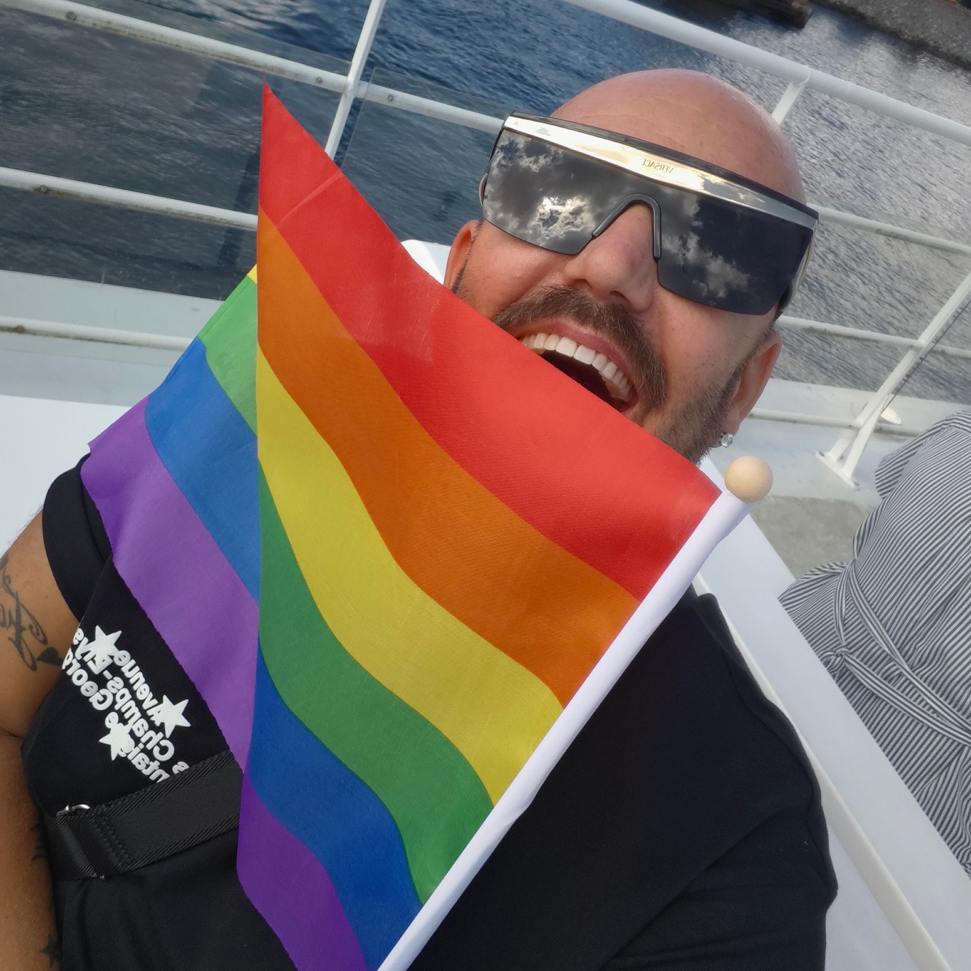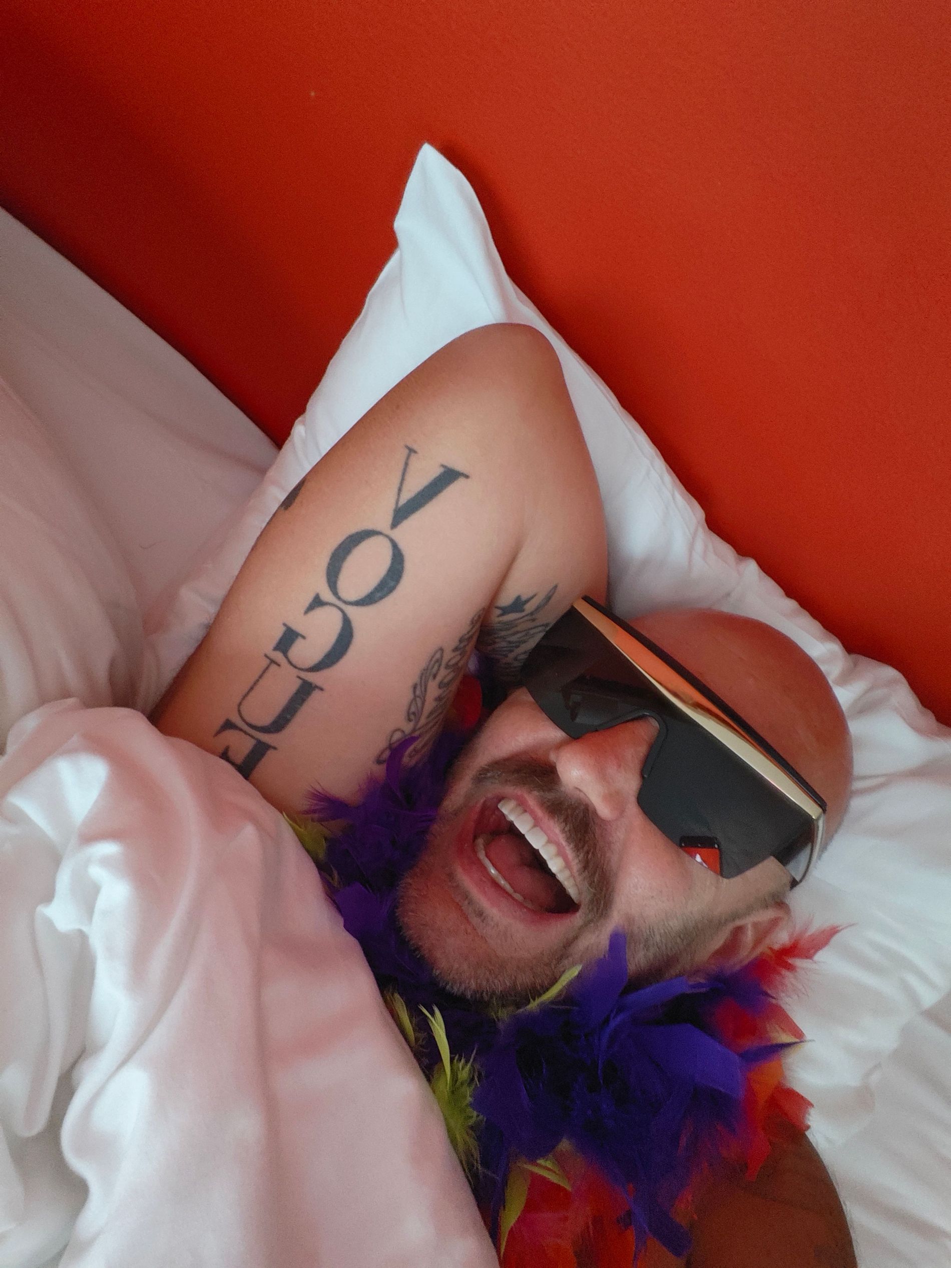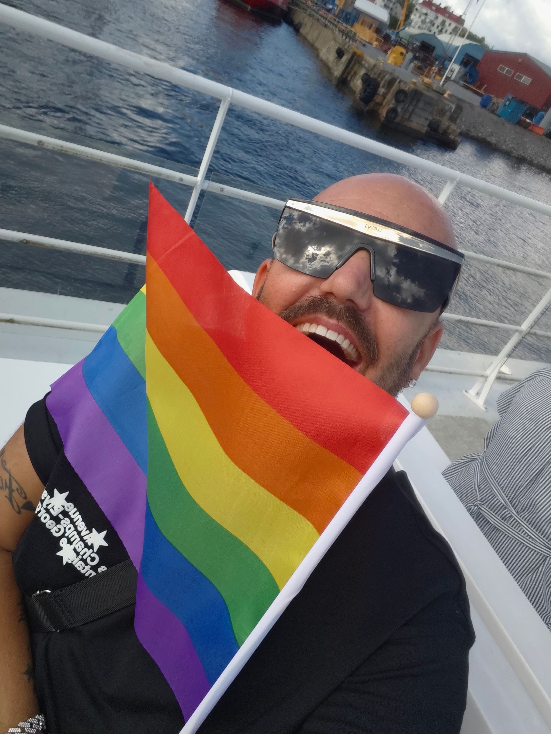 “Godmorning Stockholm! Finally the pride parade day. I woke up like this: Versace sunglasses and a pride feather boa. Let's start the day guys!”