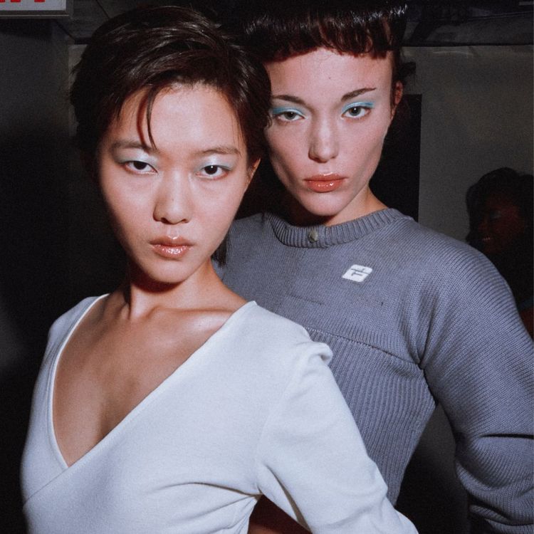 At Fang NYC, the starting point was 1990s Berlin rave culture. "I wanted skin to read like heat, not highlight. Luminous and slightly metallic." This was achieved by mixing Submission's highlighters Deep and Lucid into moisturiser so it caught the photography pit's flashes like sweat. Eyes were built from diffused charcoal pressed with silver glitter and framed by graphic black liner under the eye. Once the clothes and models came into play, the look sharpened. “It still had that club kid energy,” says Jaeger, “just distilled into something polished, controlled, and honest.”