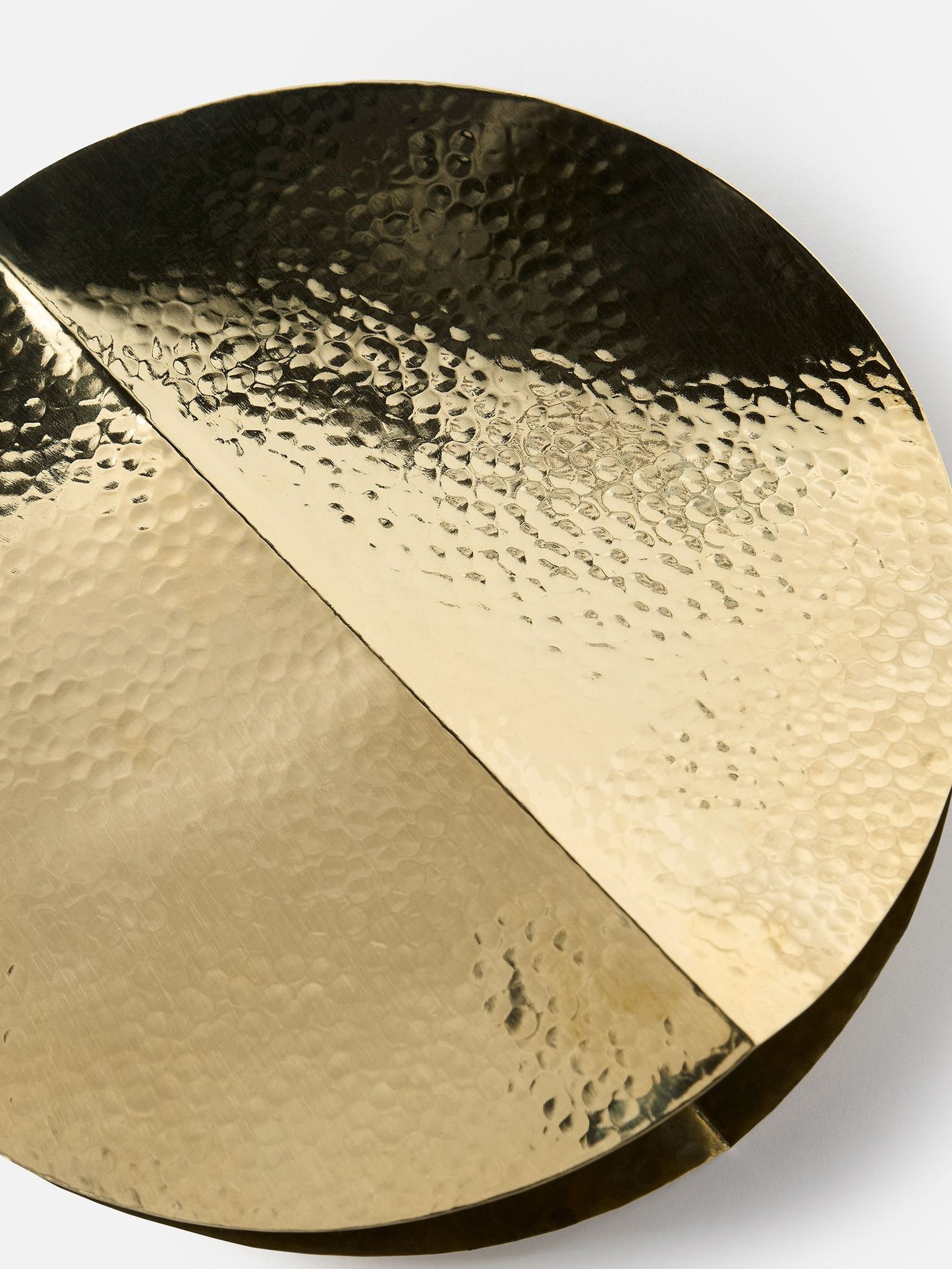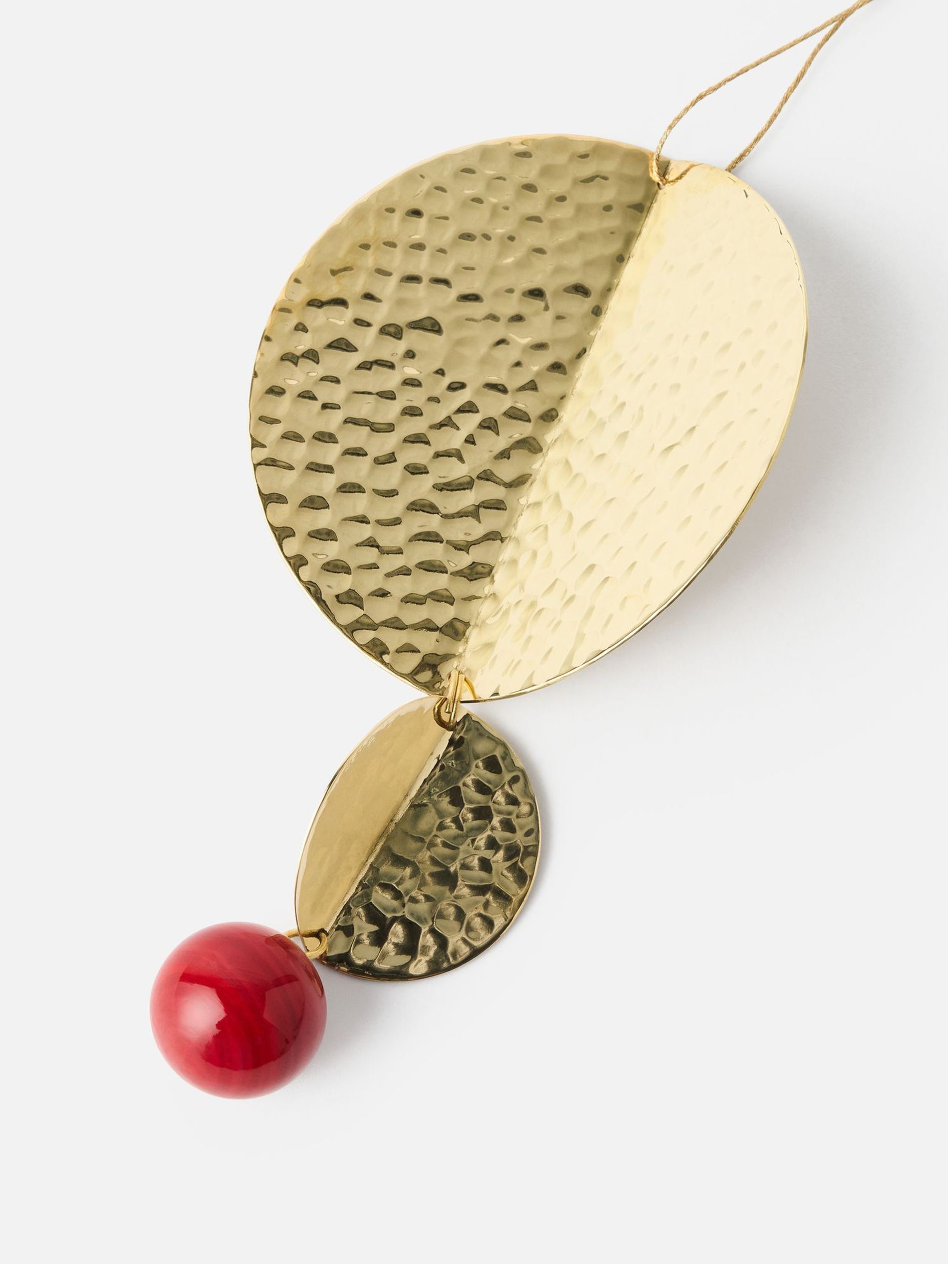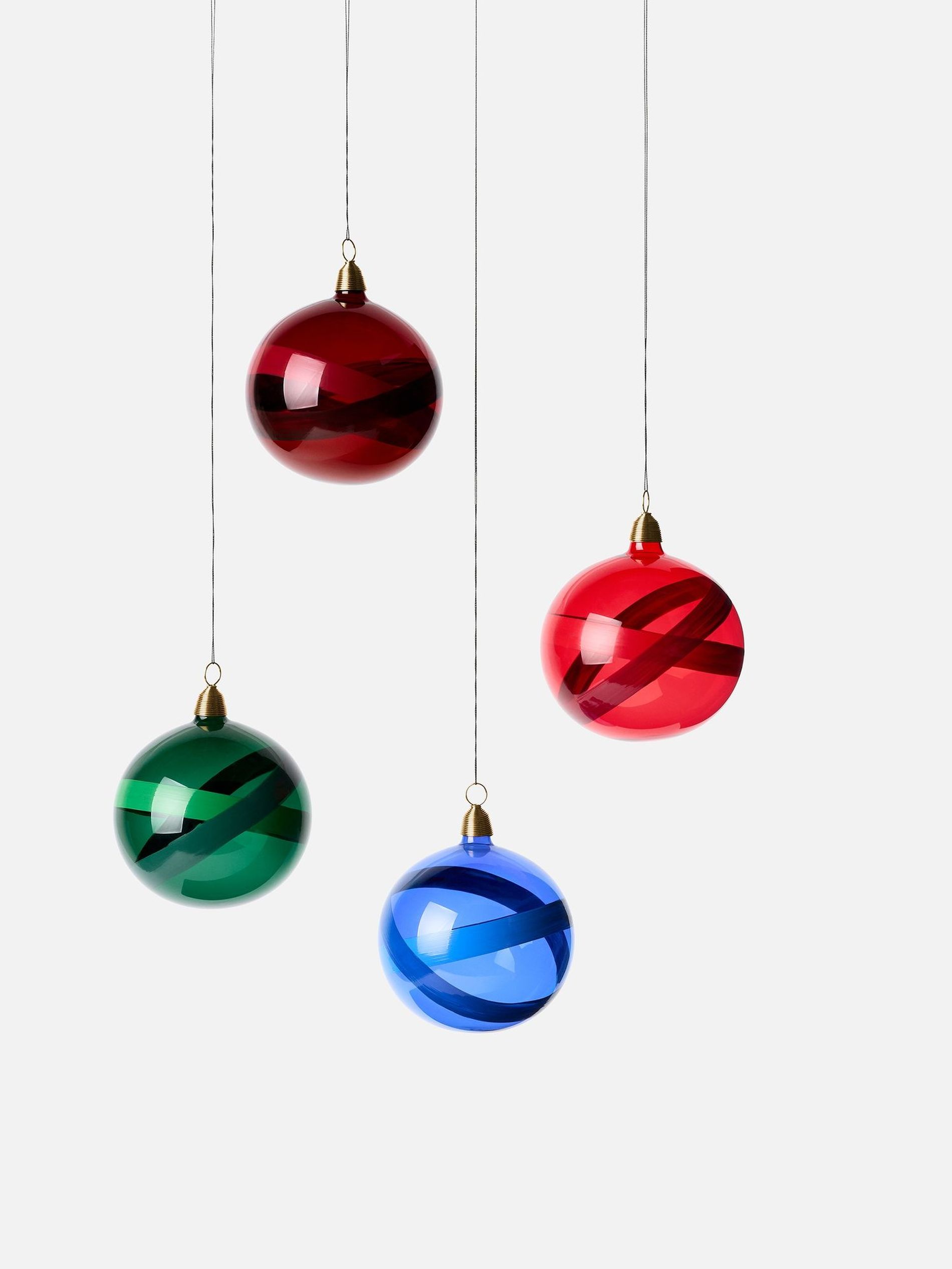 At the heart of Barrett’s collection is an exploration of the theme 'Unfold', which reveals itself in geometric ornaments of hammered brass that were inspired by the simplicity of folding paper. “Our idea was to create something contemporary with roots in tradition,” Barrett explains. “Transforming paper into metal – where a simple fold turns the two-dimensional into three-dimensional. It’s a kind of unfolding that gives depth and a modern spirit.” The hammered brass is gently folded along the centre, a technique that allows the ornaments to glimmer with the light reflecting off their surfaces. Designed with versatility in mind, the circular shapes also hold glass spheres in colours drawn from 'Poisons', and can be hung from trees, doors, or windows, where they play with shadow and light, turning simplicity into sculpture.