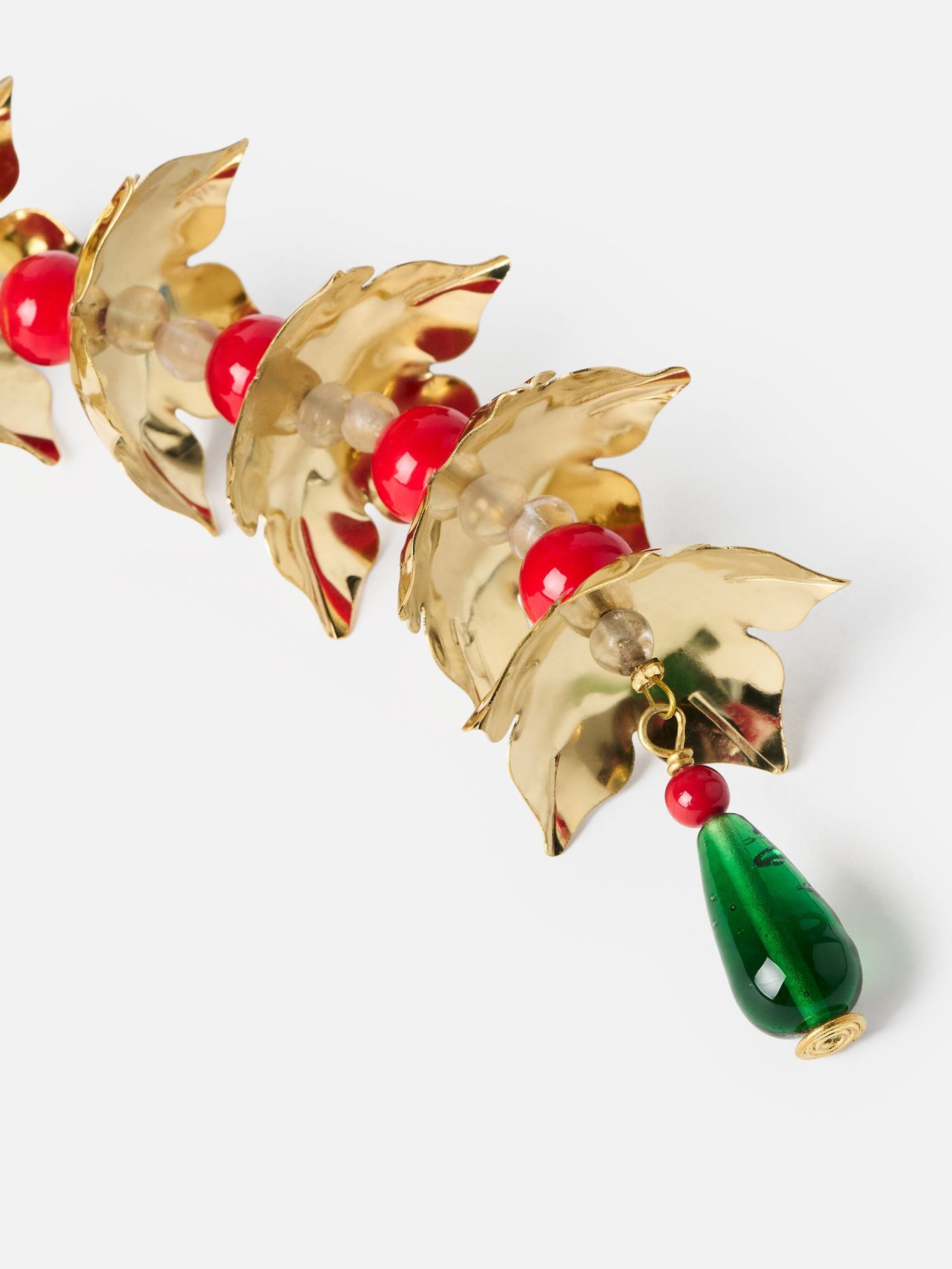 Complementing Barrett’s creations, British designer Wilde played with this year’s theme and colours to make exuberant ornaments that interpret Frank’s Poisons in both line and spirit. Wilde’s dangling creations include a brass-held cluster of green glass spheres shaped to resemble a bunch of grapes, and the “Flower” ornament, in which brass petals and red glass beads create a swaying scaffolding that suspends one singular droplet of green glass.