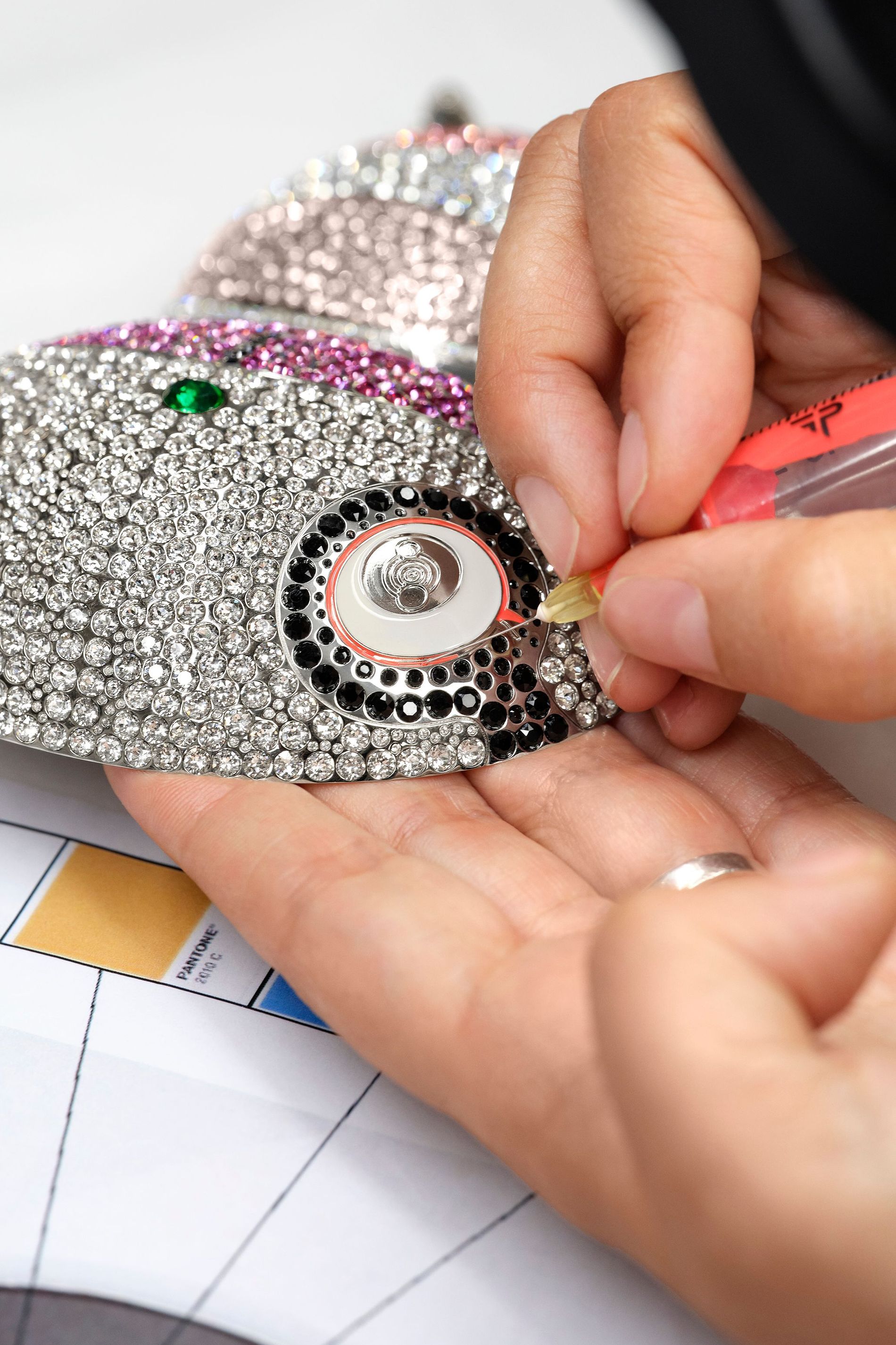 That notion of fantasy – shimmering, excessive, a little irreverent – threads through every detail of the collaboration. The Panda Clutch, for instance, is forged entirely from silver-tone brass and set with 6,250 strass stones, making it less a handbag than a jewel-box creature. The Golden Garden glows with gold-leaf-covered leather marquetry. Even the collection’s name evokes metamorphosis: Artycapucines is not a “line” but a living experiment in how far a fashion house can stretch its craftsmanship into the realm of art.