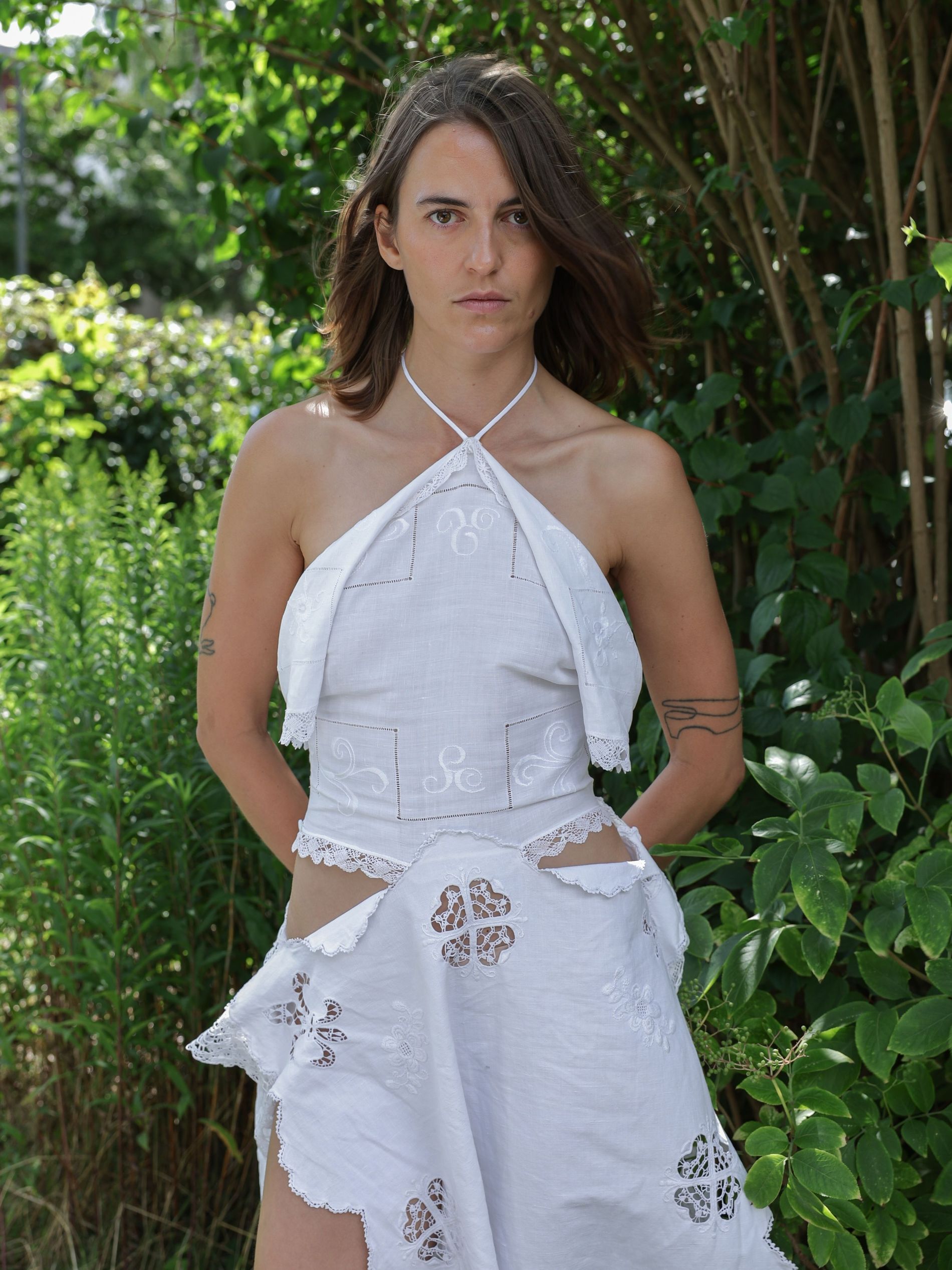 Flapper-style dresses are artfully constructed from antique scarves, their faded prints whispering fragments of past lives. Wedding ensembles emerge from delicately crocheted vintage doilies, once emblems of domestic pride, now reimagined as declarations of individuality. Halter-neck tops, crafted from vintage waistcoats turned inside out, reveal linings and seams once hidden - suggesting what is kept secret can be the most beautiful of all.