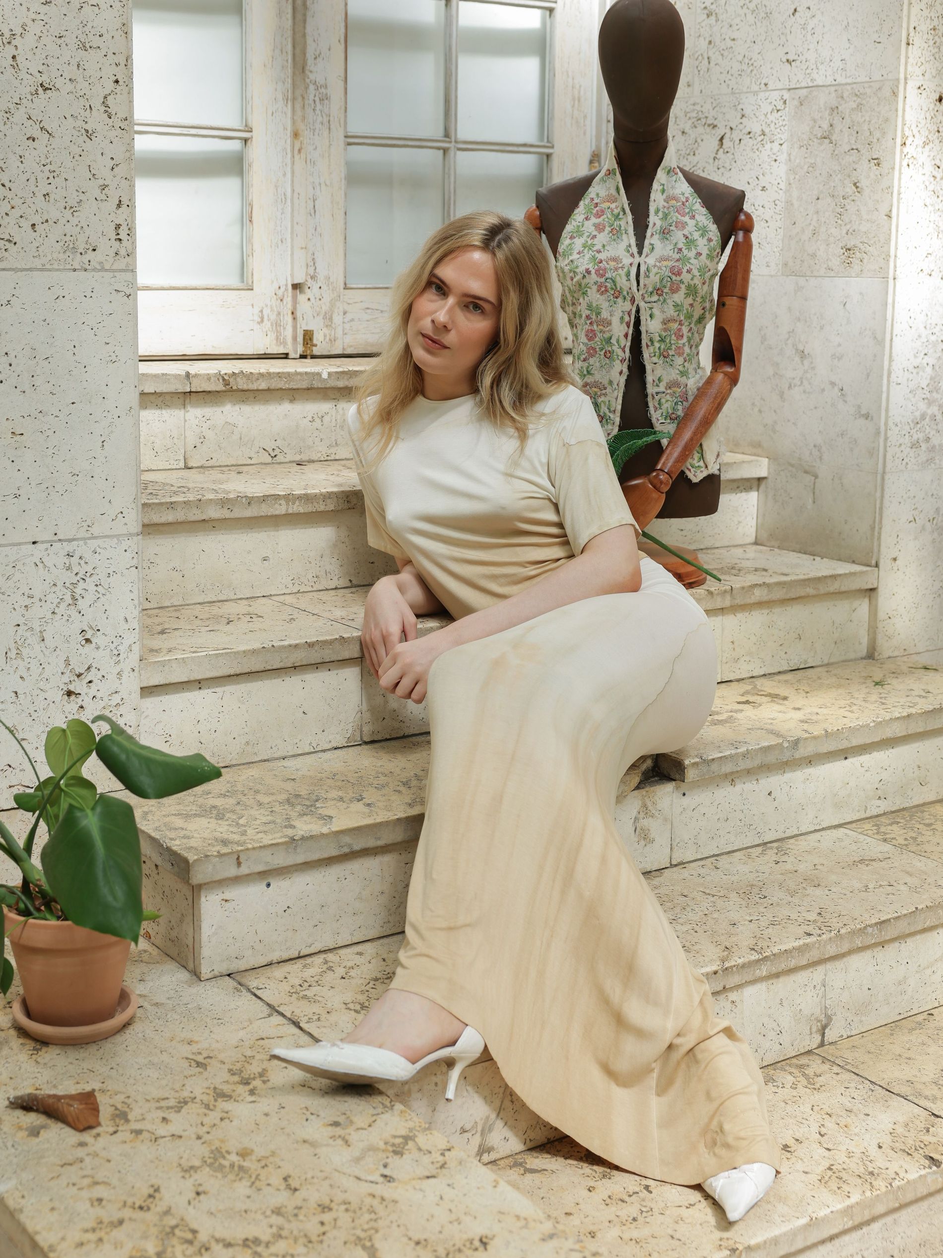 This process becomes a metaphor for the mutable nature of memory – how it fades, distorts, and resurfaces in unexpected manners. Taus leans into this theme by hand-dyeing garments with coffee, tea, and beetroot, producing hues that evoke natural ageing and imperfection. Each stain and variation is intentional, a quiet rebellion against uniformity and convention.