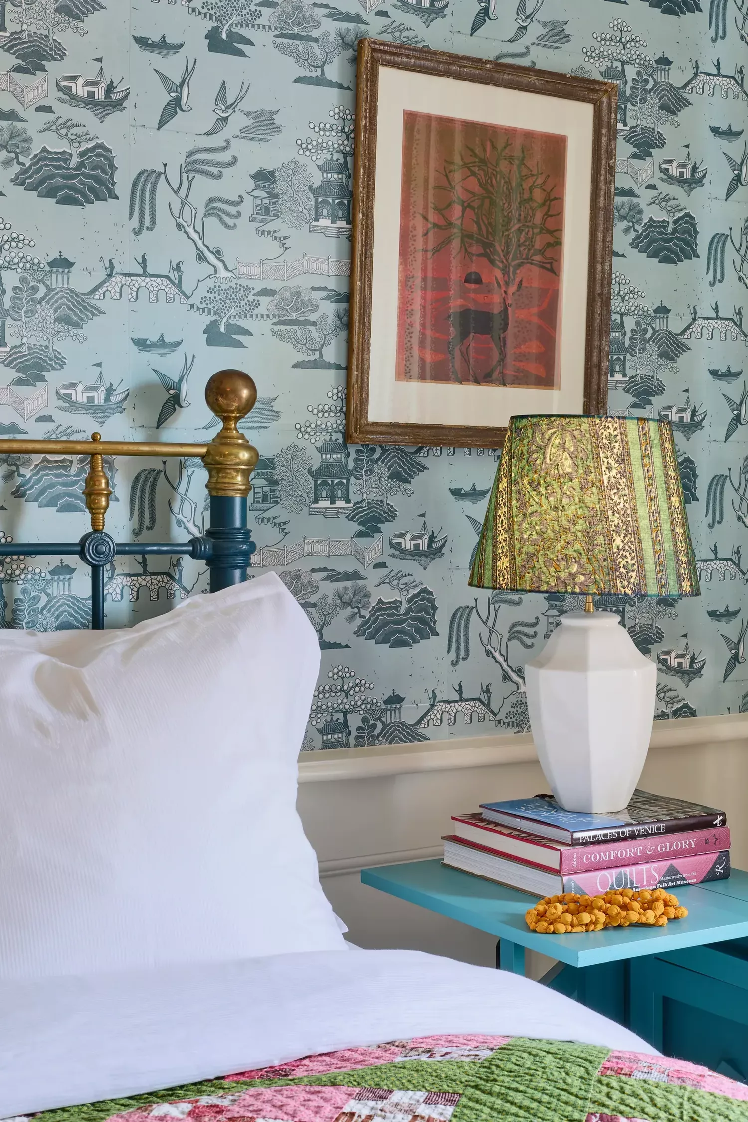 The designer’s preference for soft lamp lighting, hand-woven baskets, vintage furniture and displays of collected objects all contribute to the feeling of a much-loved, incredibly special home. Though it’s really Busck’s ability to use endless colours and prints in a single space that’s something to marvel at. I stopped counting at 11 different fabrics in the living room, with Soane Britain, Décors Barbares, and Carolina Irving among many esteemed textile brands she’s chosen. On paper, it sounds like mayhem, but her instinctive eye for combining and layering means every space feels intentional and inspiring.