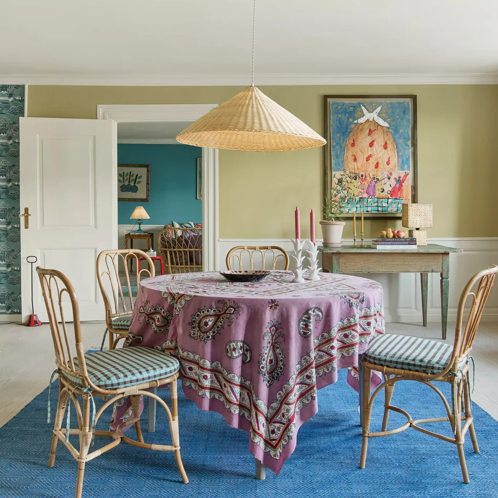 When The Apartment first launched in 2011, all the walls were white, but Busck quickly became more experimental and confident with colours, which eventually culminated in her own 33-shade paint collection—a collaboration with natural Danish paint brand, St. Leo. Naturally, every colour within the space is from her own range. Bell Green (named after artist Vanessa Bell) covers the walls of the dining room, and a large piece by 91-year-old artist Isabella Ducrot looks magnificent against it, as does a Märta Måås-Fjetterström tapestry. Busck declares Ducrot’s artwork as her favourite item in the apartment: “I’m completely amazed by this woman,” she smiles.