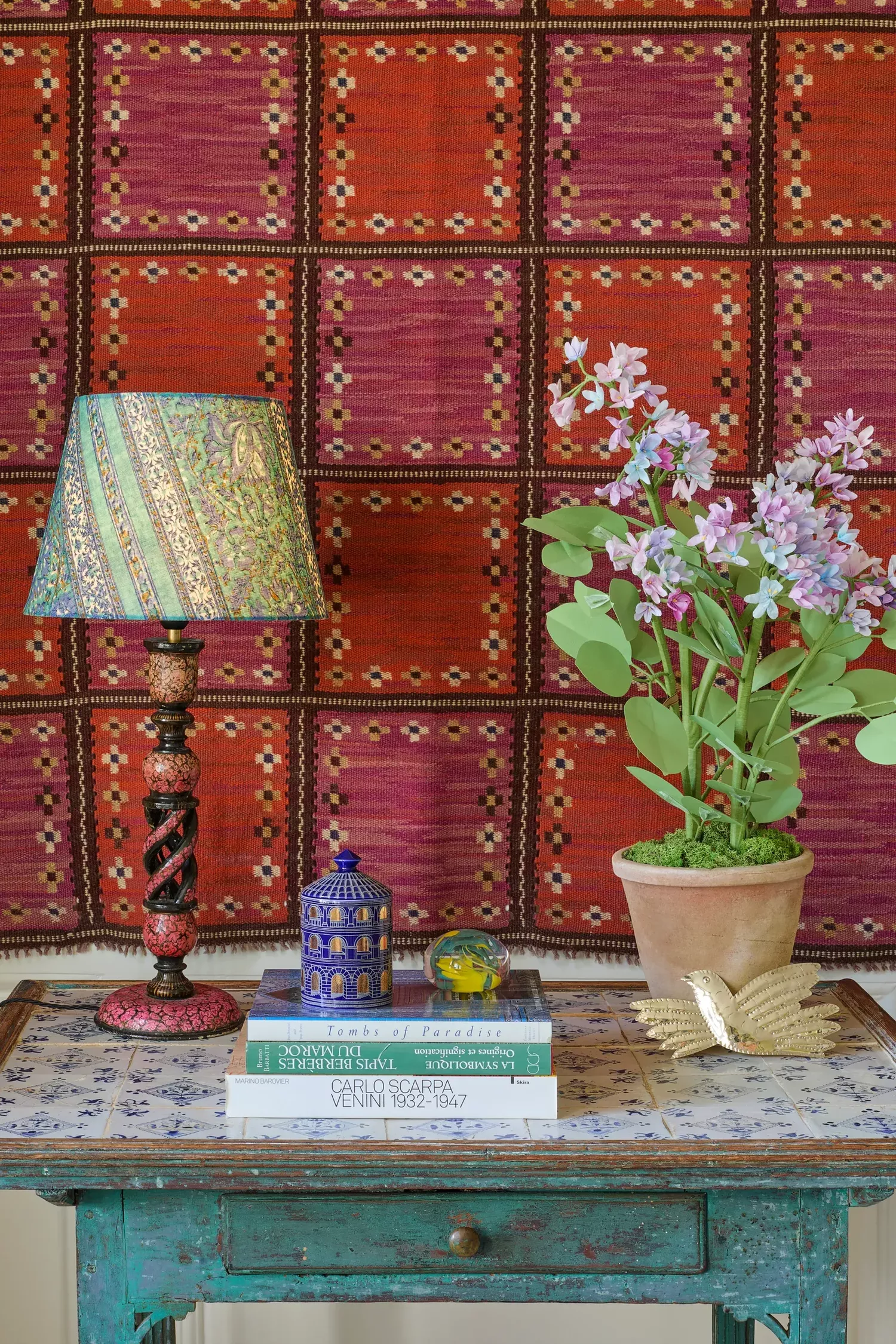 The Apartment was (and still is) based in an imposing 18th-century building overlooking the canal in Christianshavn. It’s where Busck and her husband raised their children, and where her husband’s mother has lived for 50 years, making it a place full of happy memories. It was this love of creating a home that led Busck to turn an empty apartment into a joyful, lamp-lit gallery space, decorated as if she might live there. Shoppers would ring a buzzer at the gate to be welcomed in, and if an antique quilt, rattan chair, or rare ceramic caught their eye, they could buy it. The Apartment quickly became a Copenhagen landmark for interior aficionados. Especially because, in a country respected for its good taste and design pedigree, but arguably best known for restrained Nordic palettes and pared-back furniture, Busck’s playful and pattern-heavy approach always stood out as distinctive.