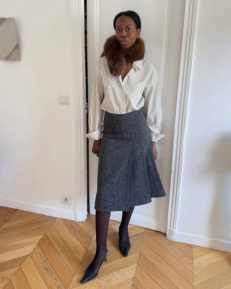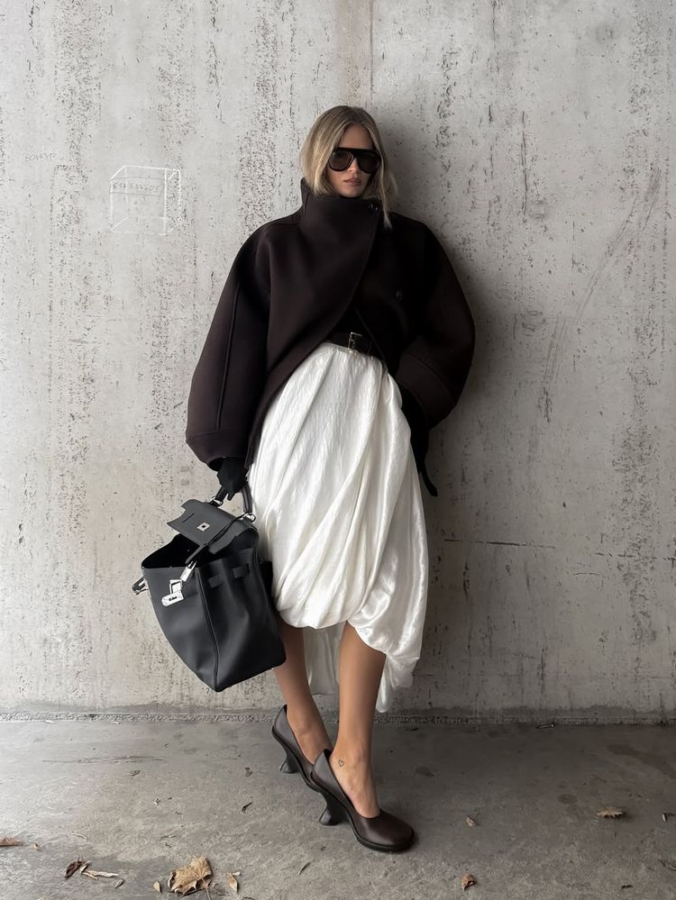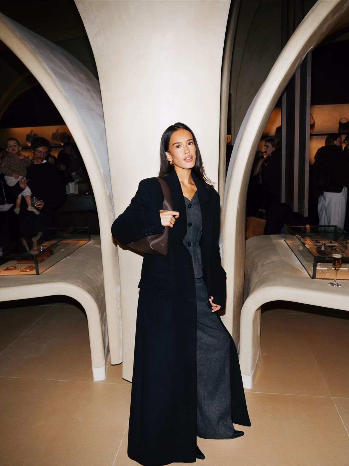 Closer to home, Hanna Schönberg embraced the art of transitional dressing, styling a white draped skirt with a voluminous wool jacket from her own label Arakii. And in Stockholm, Hanna MW stepped out for dinner in a sleek all black look by Swedish brand Dagmar, complete with a fitted leather jacket and a velvet maxi skirt, a look that created a striking winter moment.