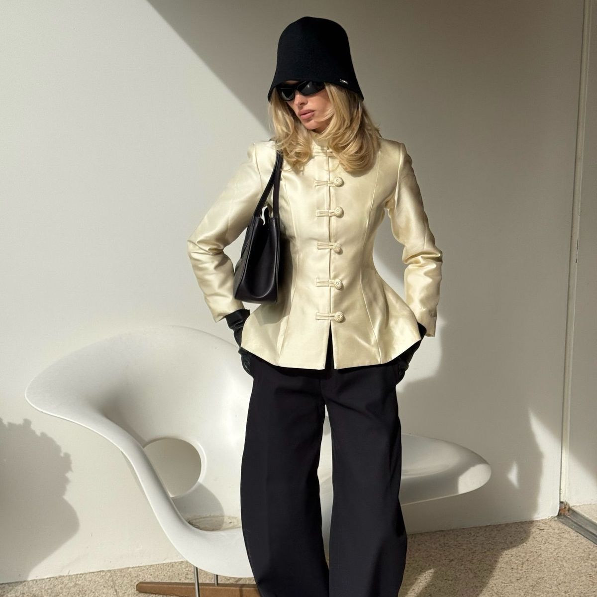 Jetting around fashion weeks, Swedish supermodel Elsa Hosk paused her busy schedule to delight her Instagram followers, donning a structured satin jacket from cool-girl Spanish label Laganini, pairing it with effortlessly elegant wide-leg trousers and a covetable bag from The Row.