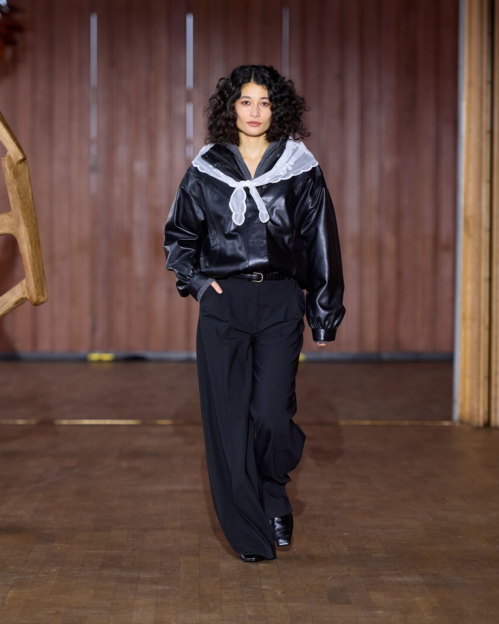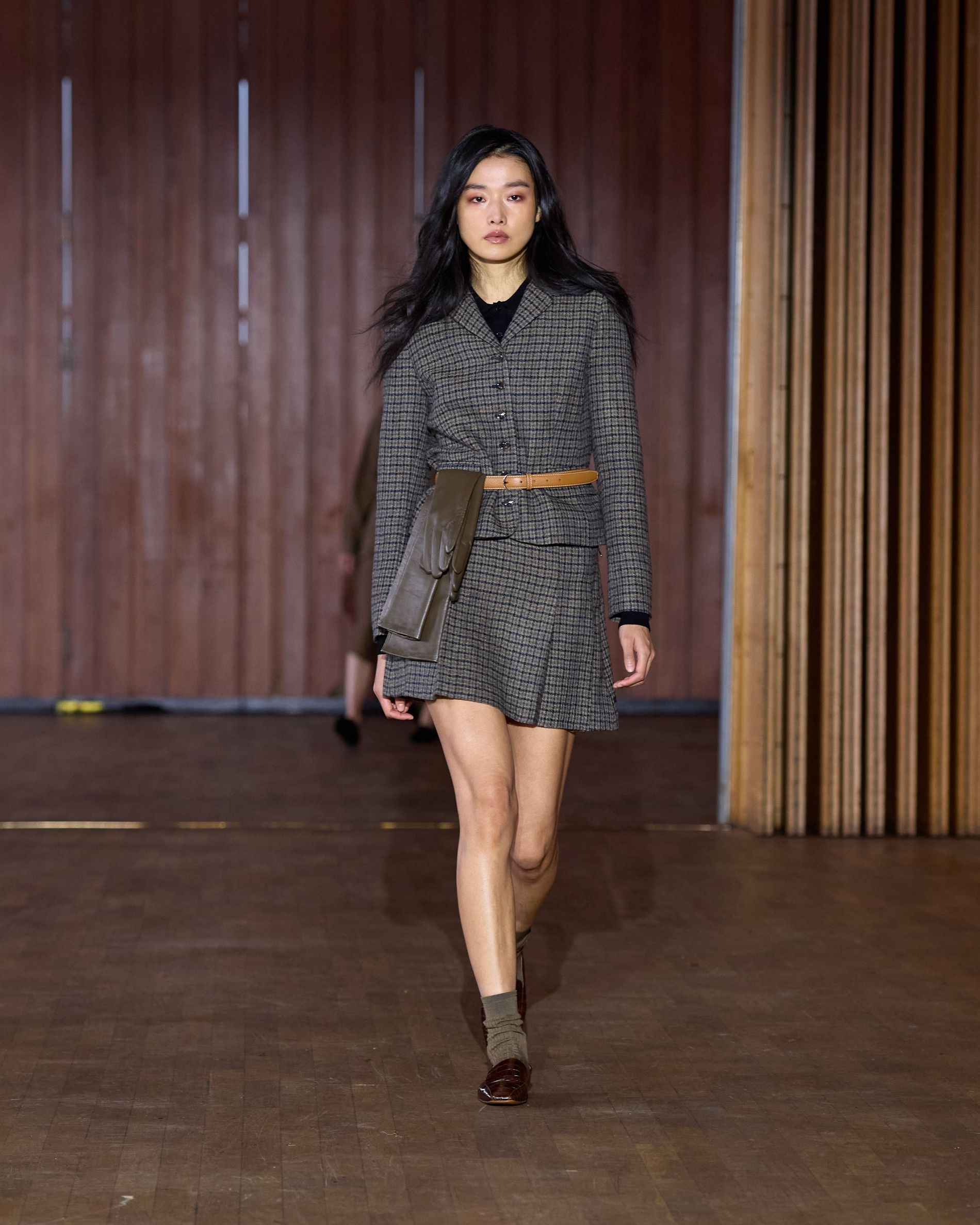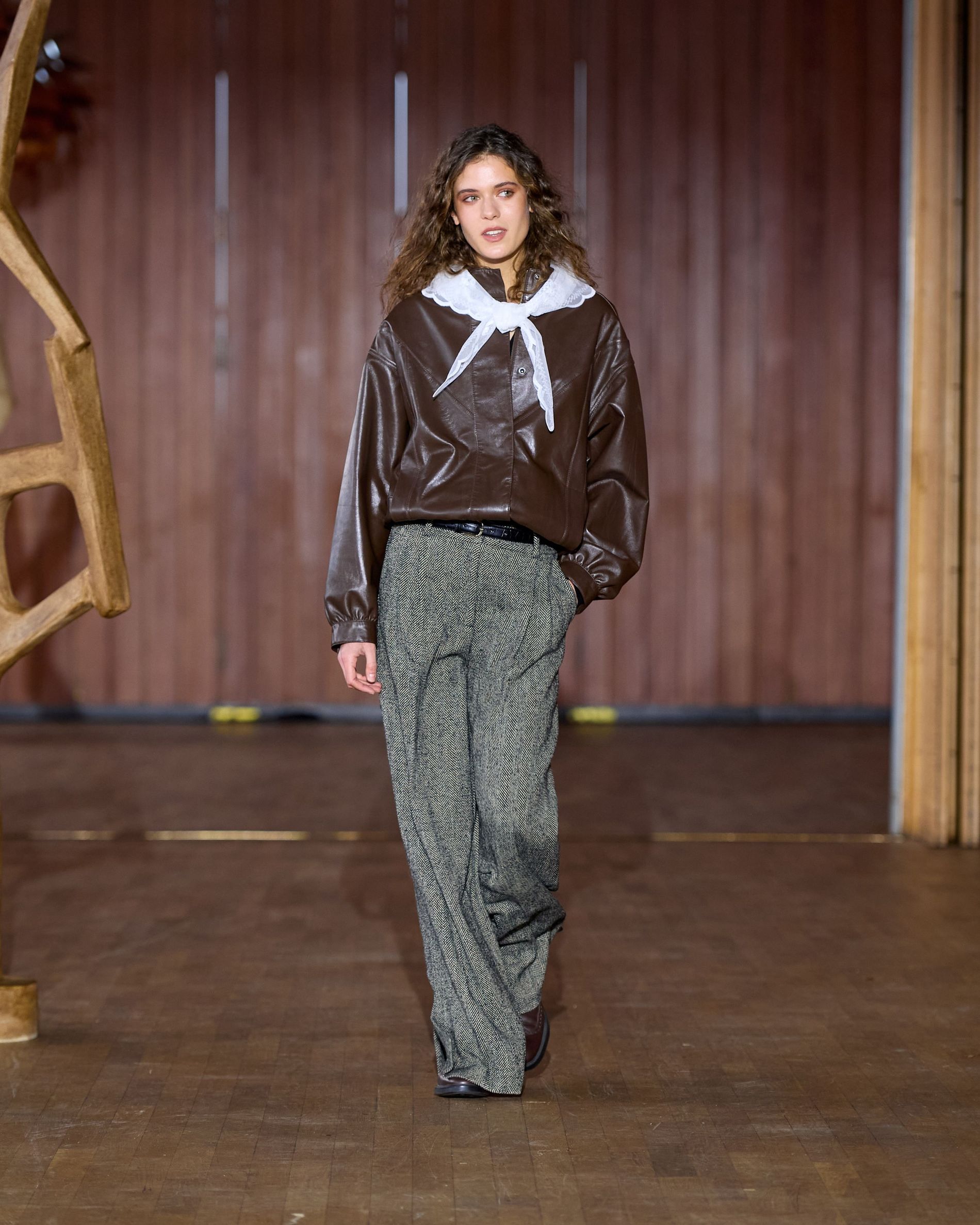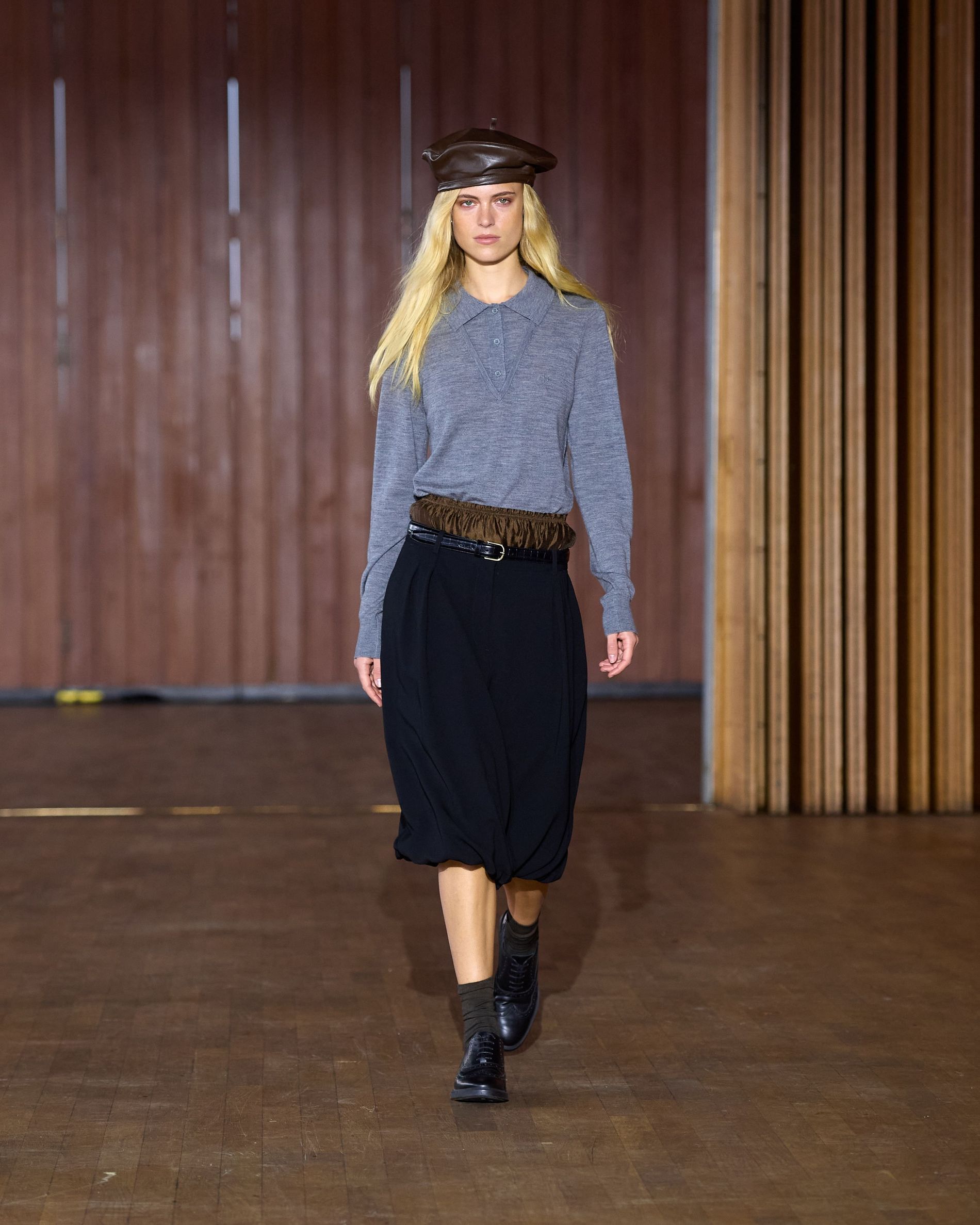 On the runway, this vision played out as a study in duality. Models – including influencer Emilia Silberg – moved between expressions of sharp masculinity and softened femininity. Bomber jackets, strict argyle knits, pristine white turtlenecks and precise double-pleated trousers gave way to silk dresses and blousy shirts, alongside skirts and dresses built from tightly packed frilled layers that, from a distance, recalled the texture of fur.