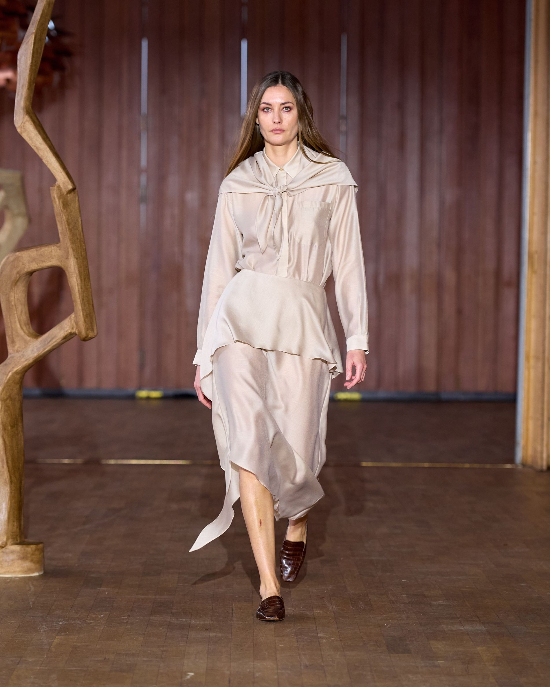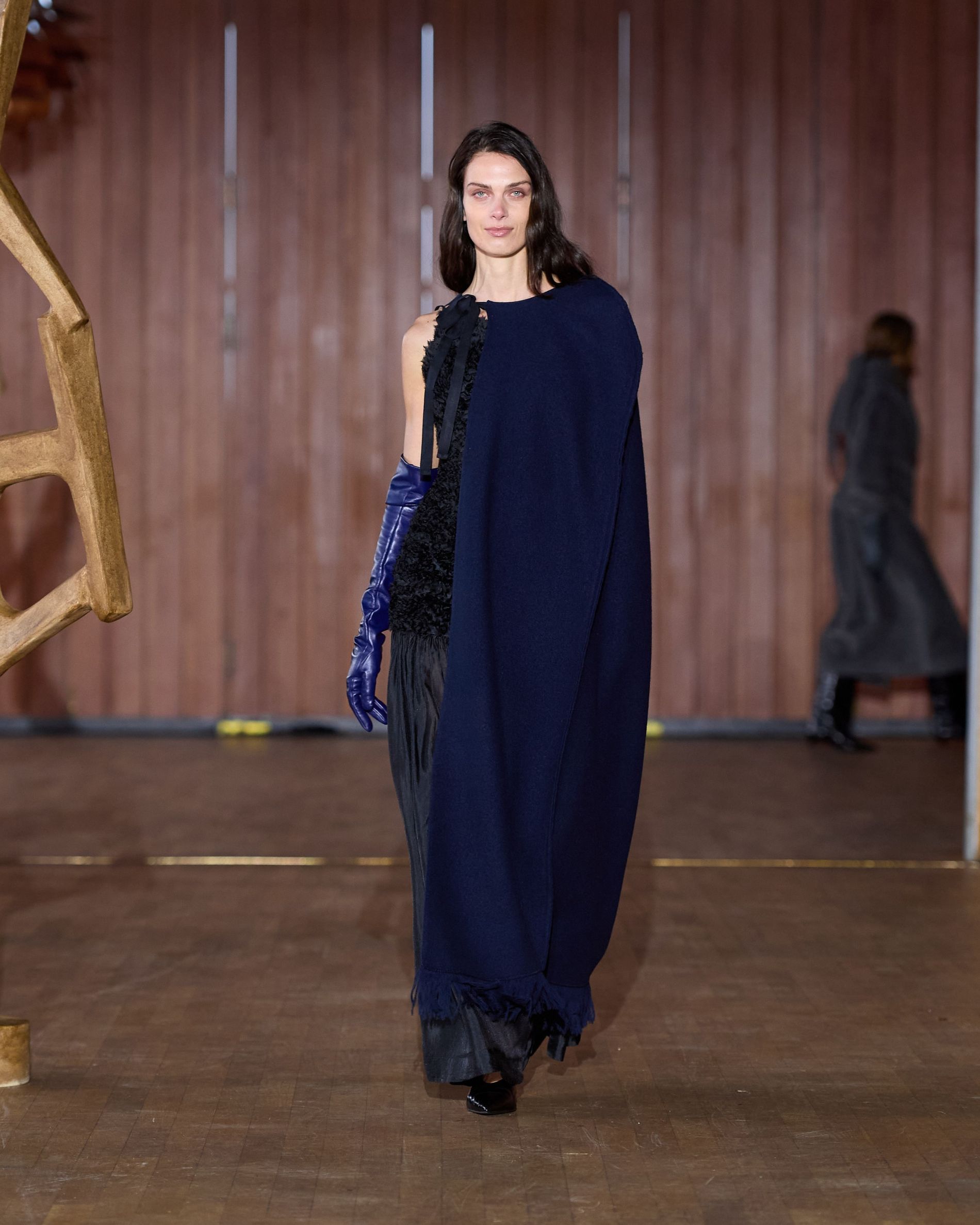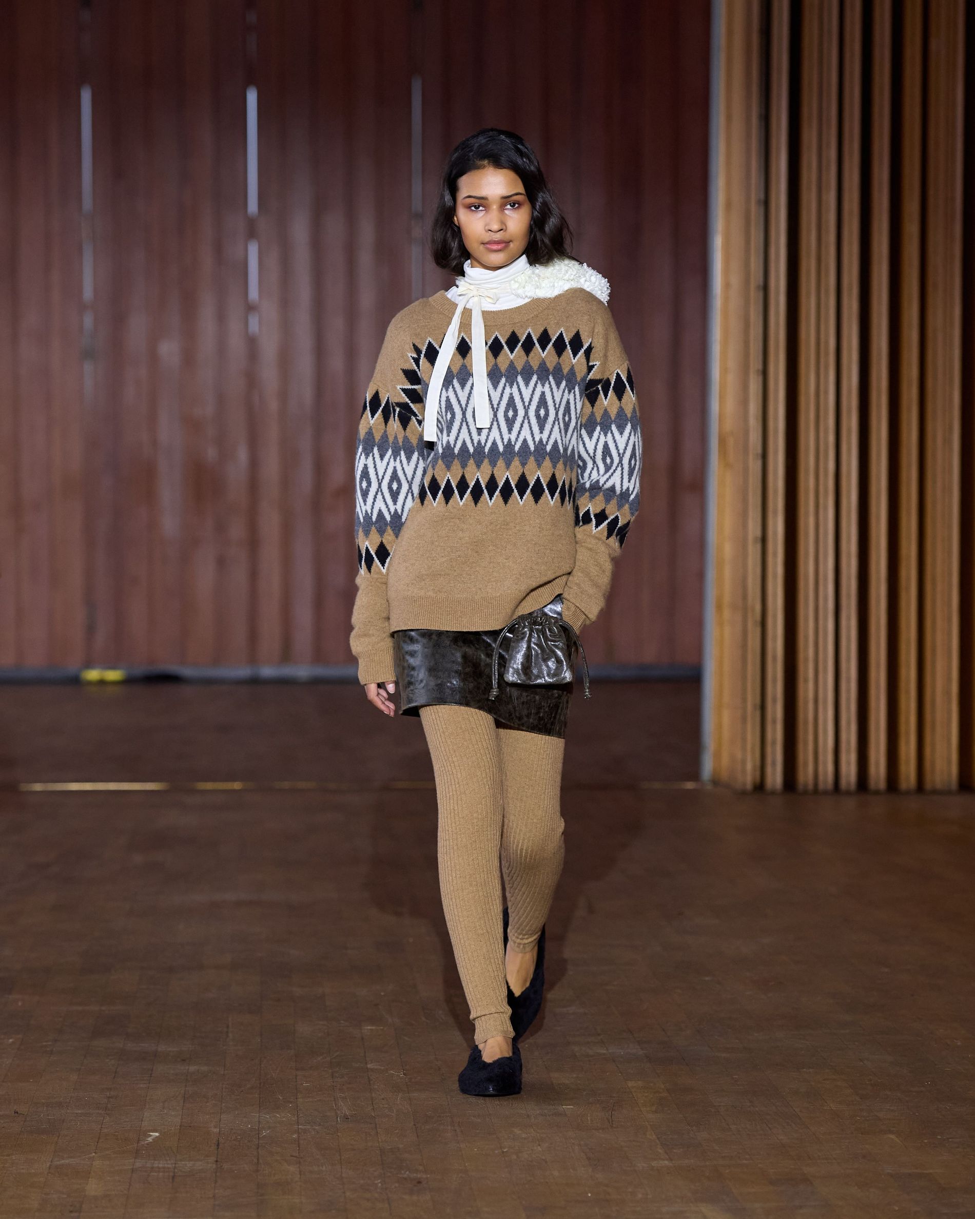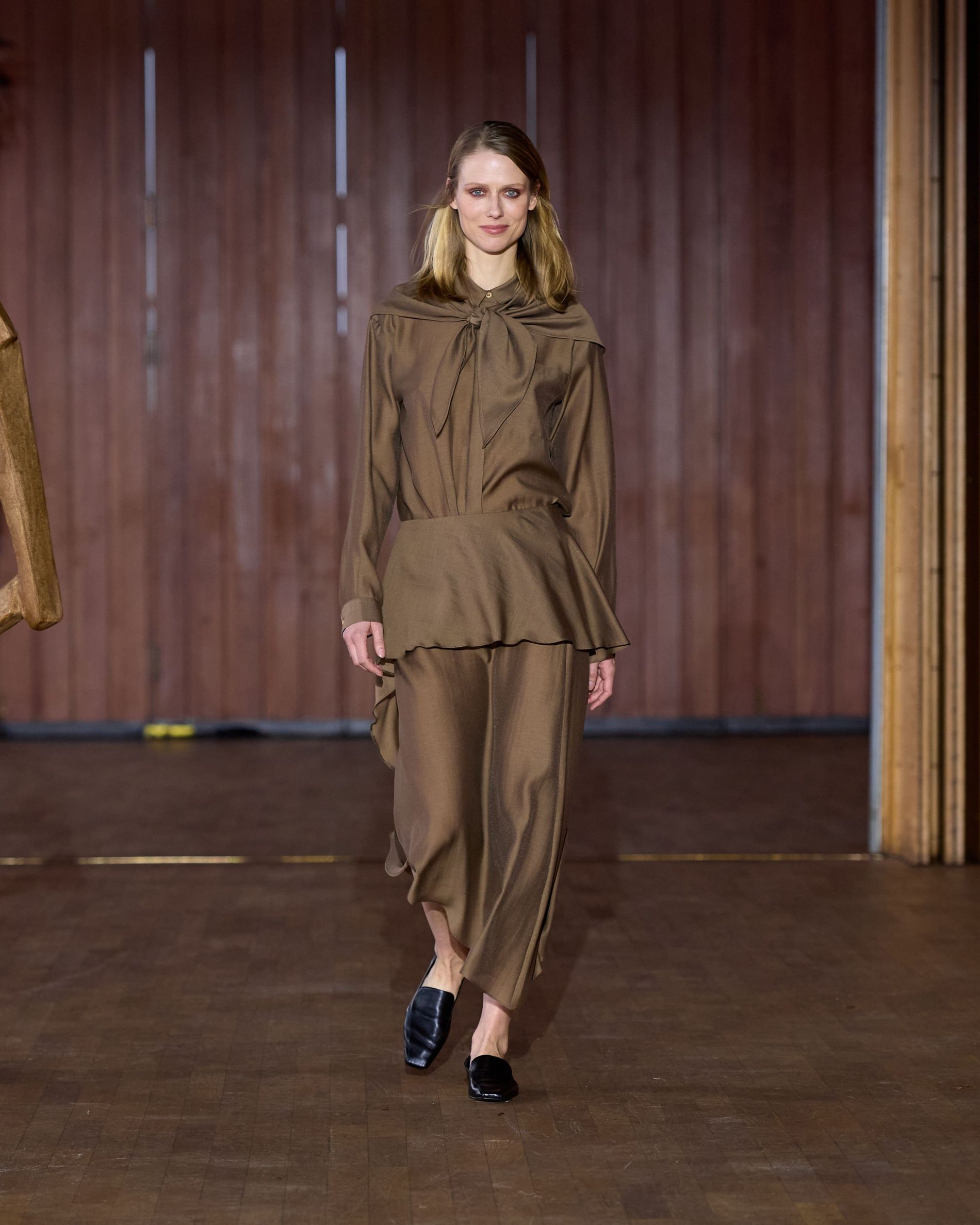 On the runway, this vision played out as a study in duality. Models – including influencer Emilia Silberg – moved between expressions of sharp masculinity and softened femininity. Bomber jackets, strict argyle knits, pristine white turtlenecks and precise double-pleated trousers gave way to silk dresses and blousy shirts, alongside skirts and dresses built from tightly packed frilled layers that, from a distance, recalled the texture of fur.