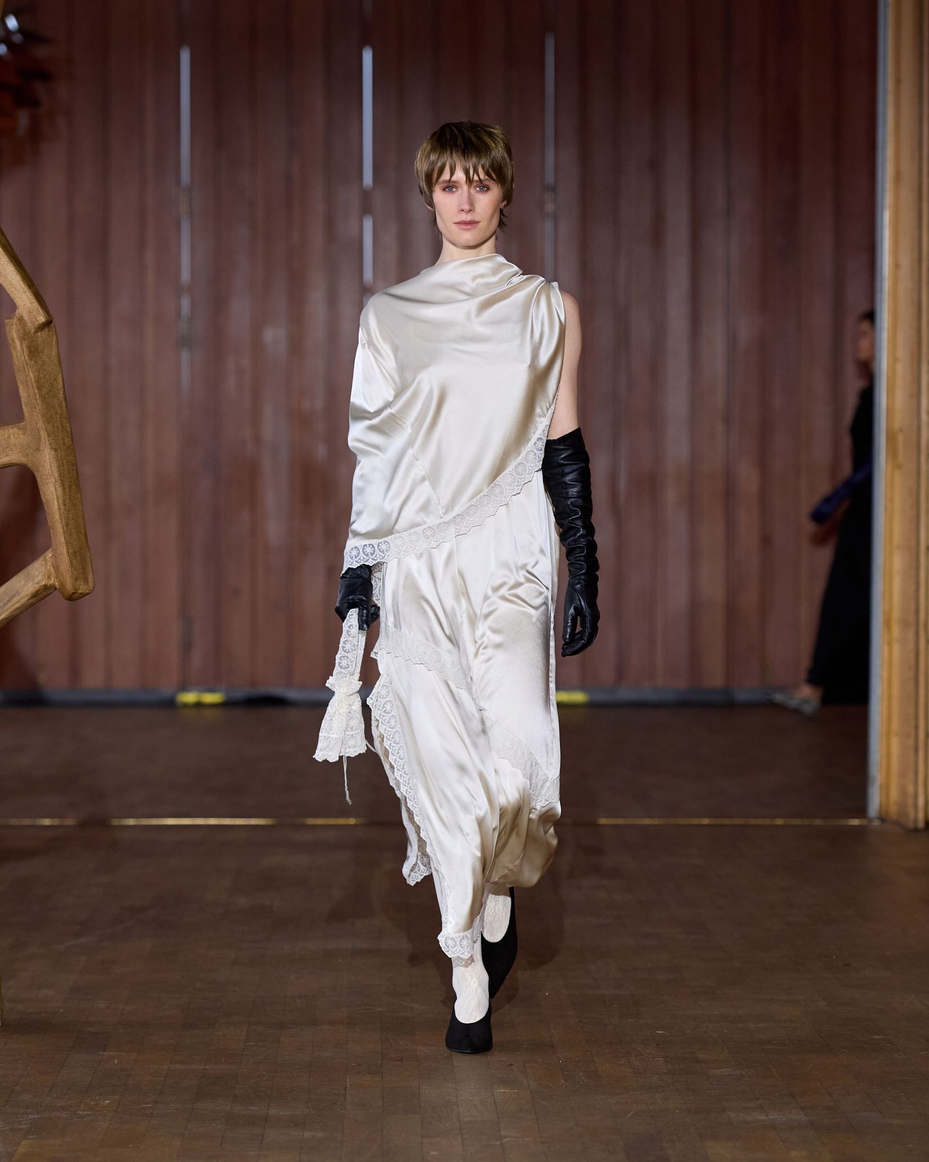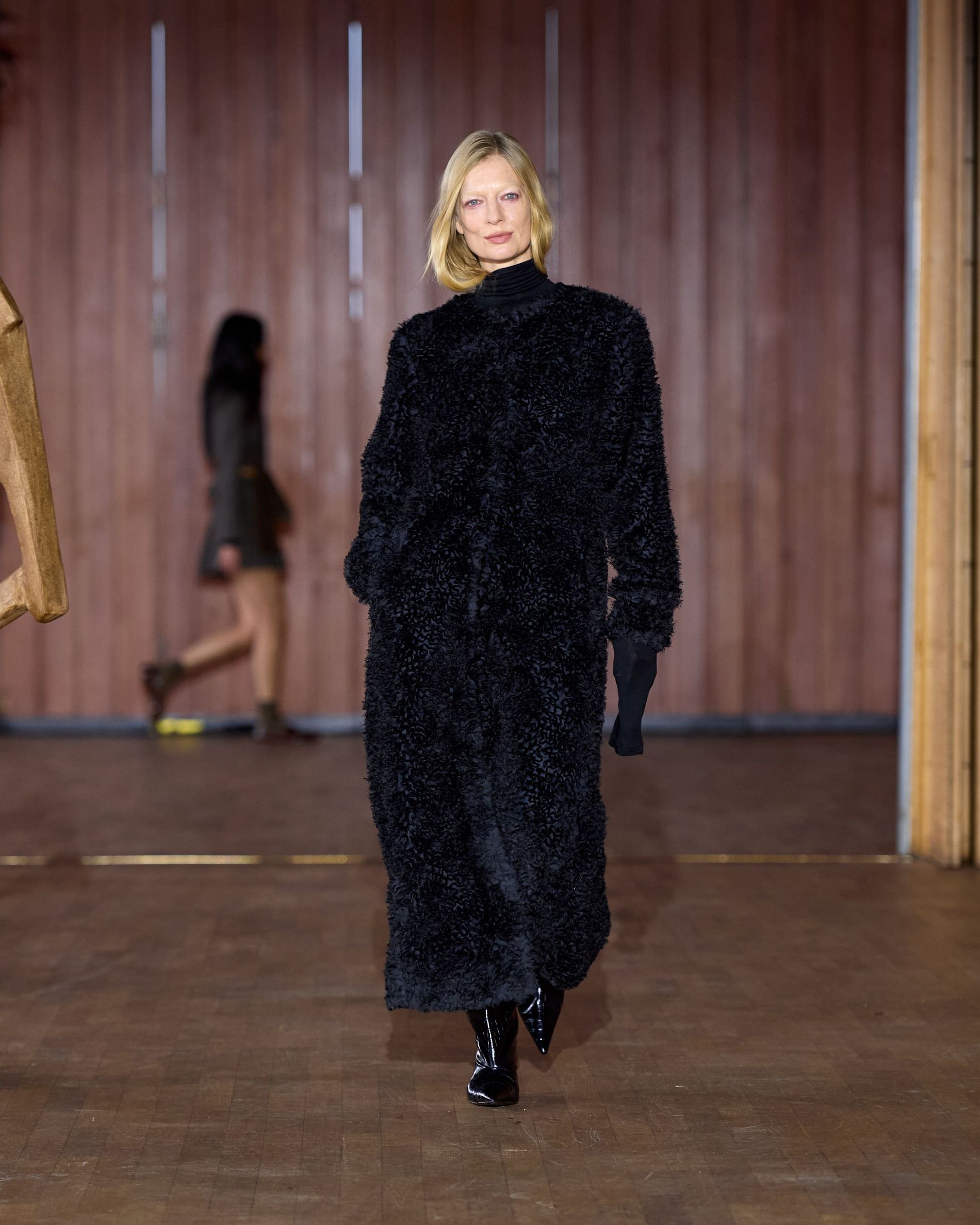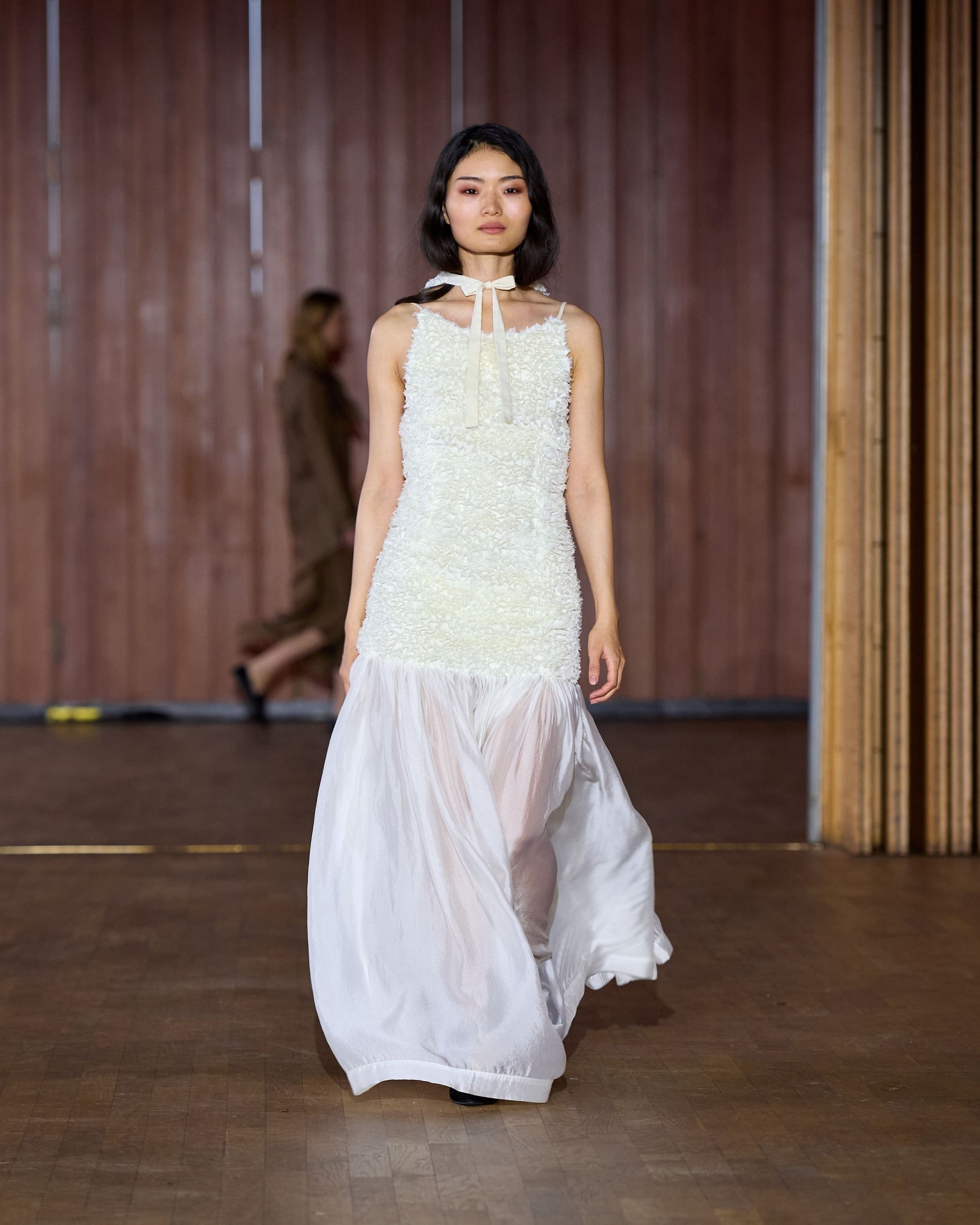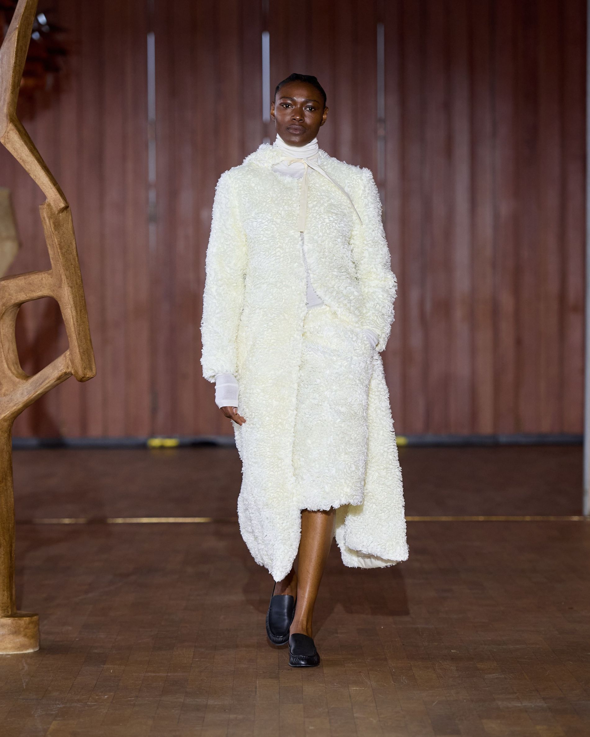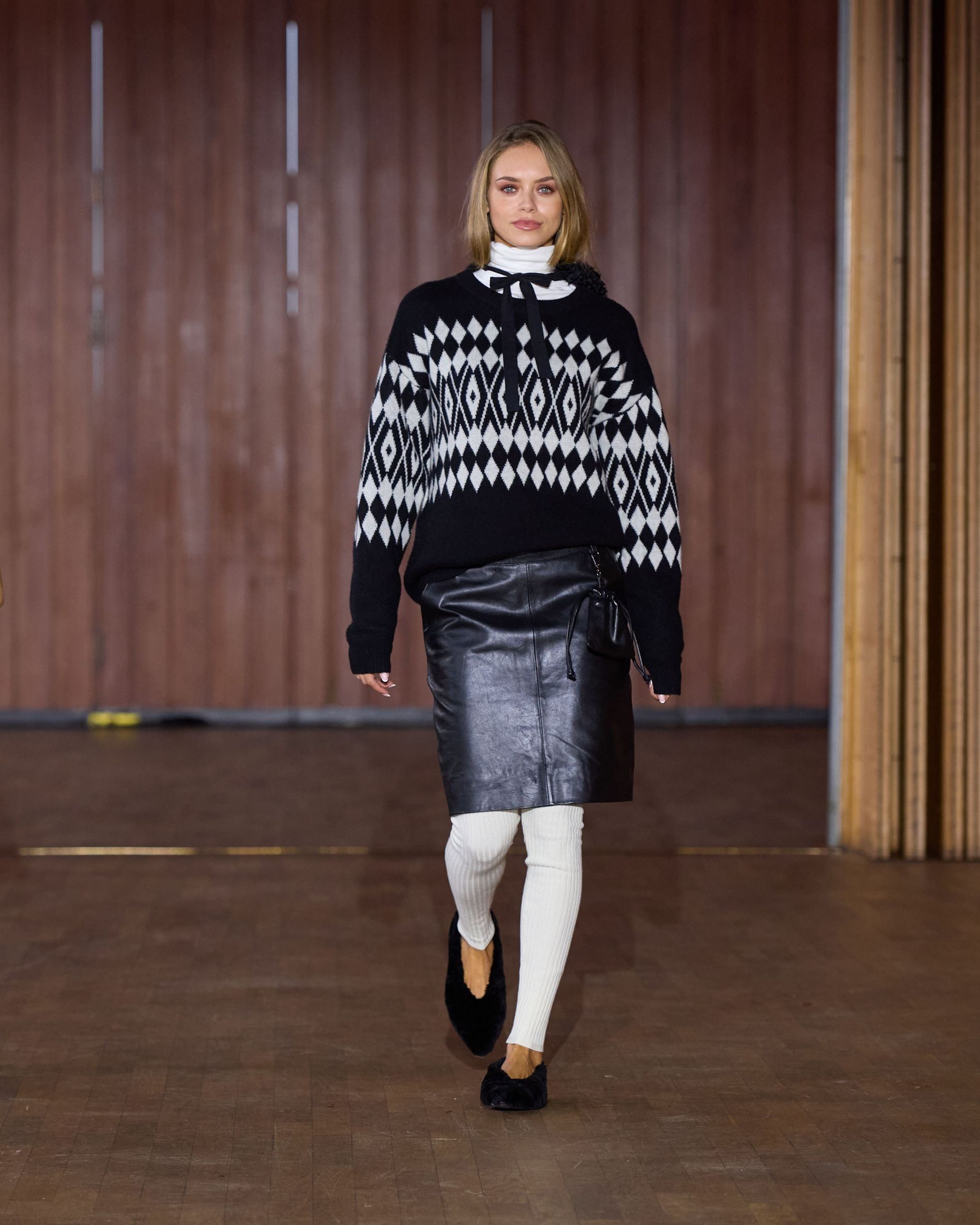 On the runway, this vision played out as a study in duality. Models – including influencer Emilia Silberg – moved between expressions of sharp masculinity and softened femininity. Bomber jackets, strict argyle knits, pristine white turtlenecks and precise double-pleated trousers gave way to silk dresses and blousy shirts, alongside skirts and dresses built from tightly packed frilled layers that, from a distance, recalled the texture of fur.