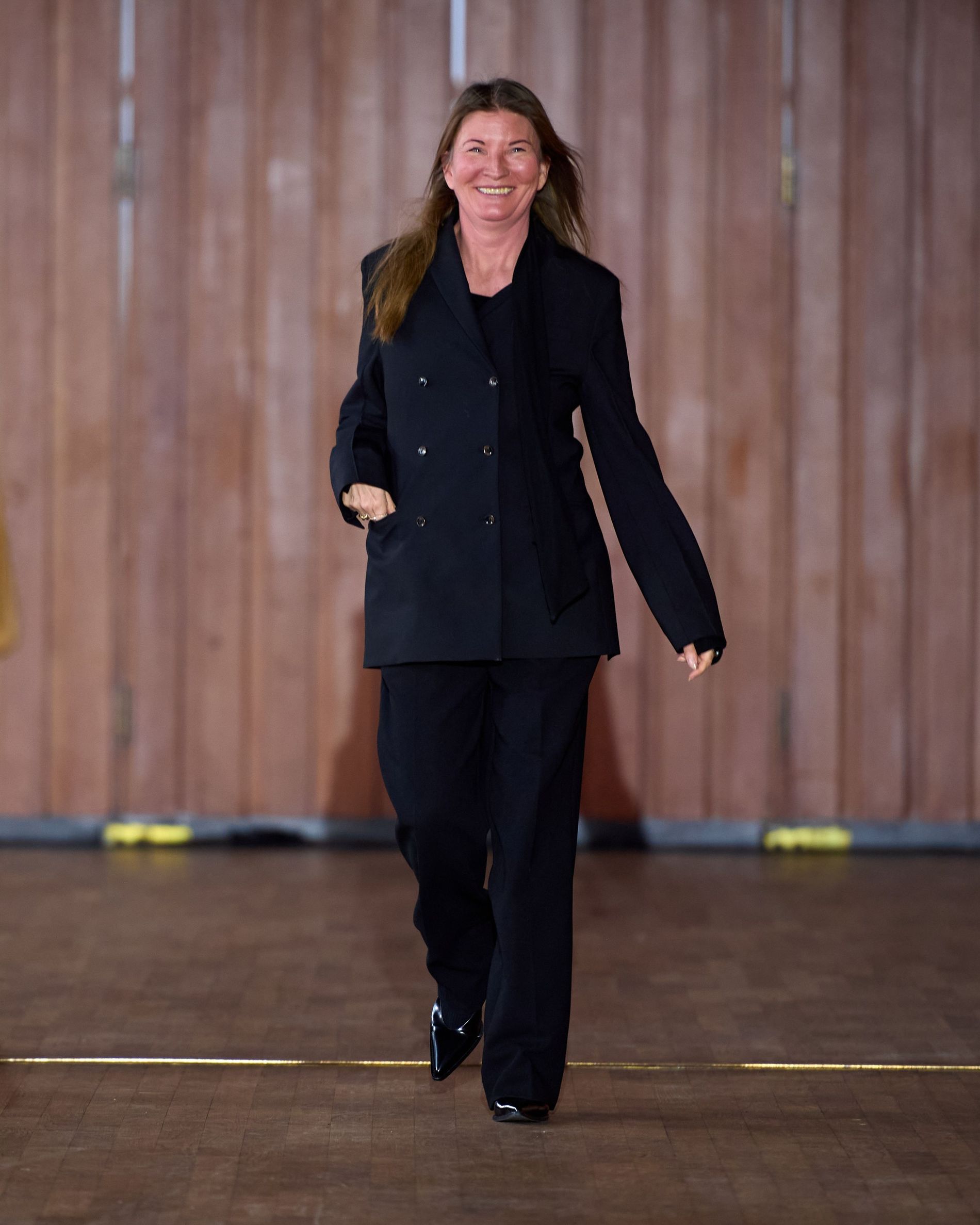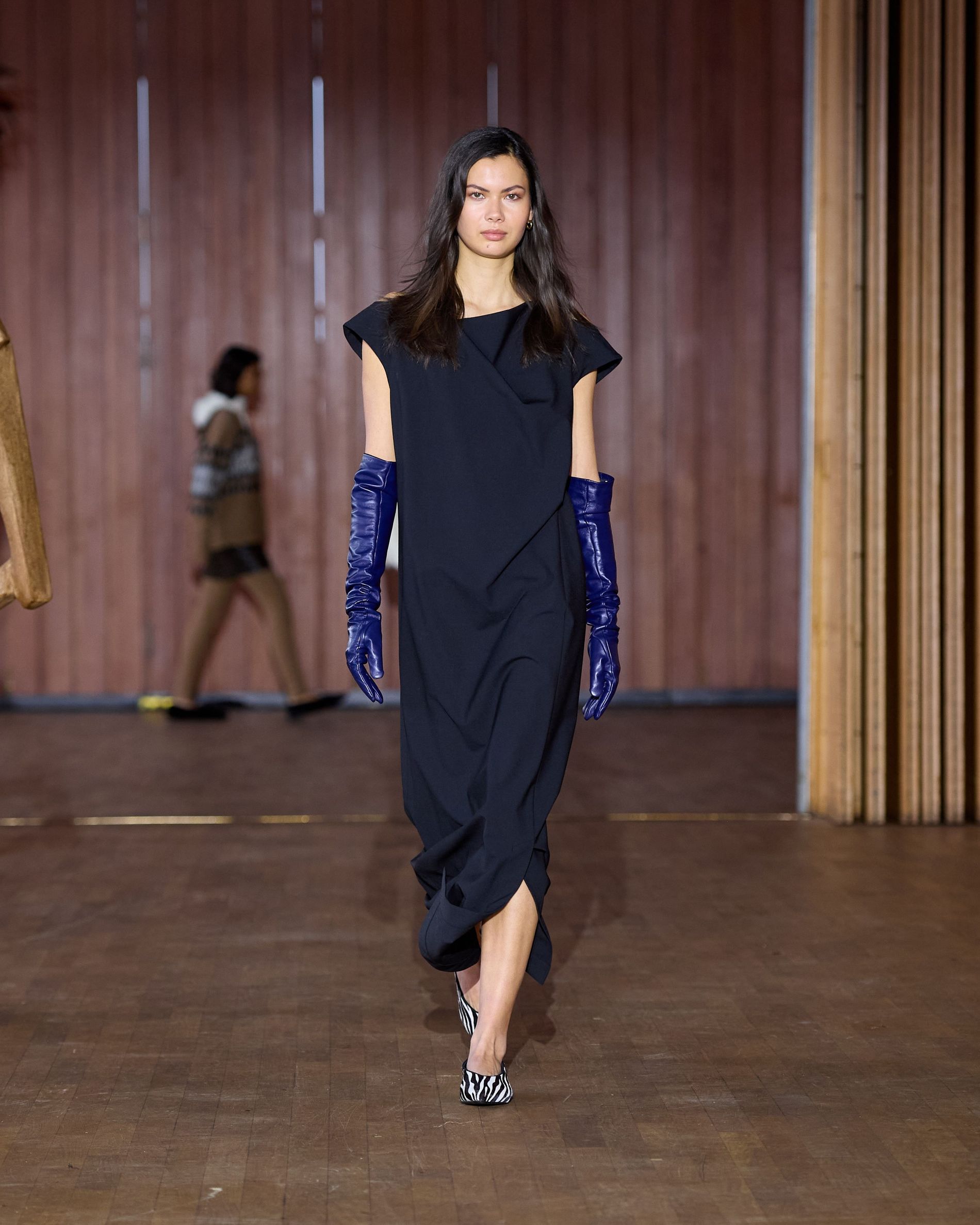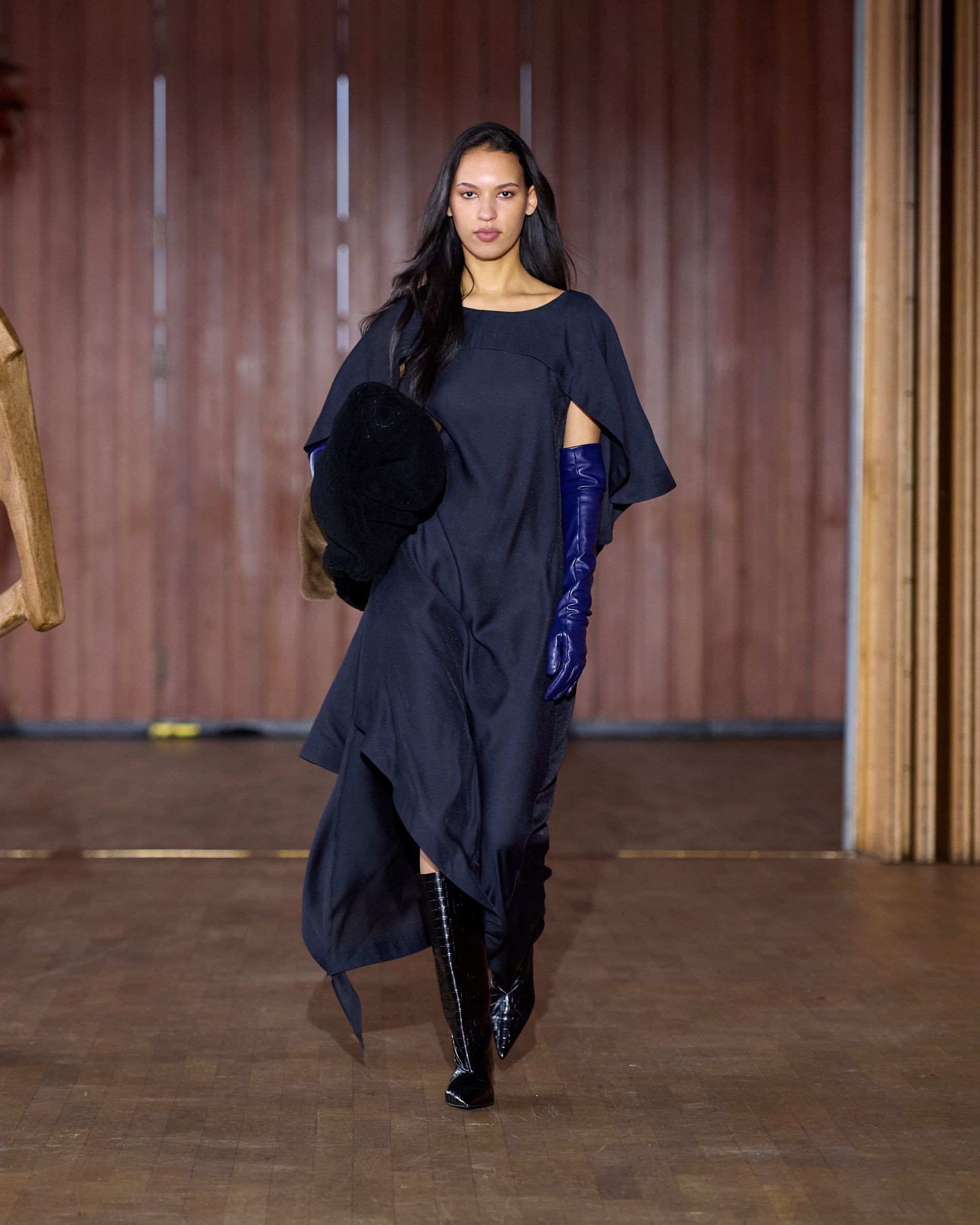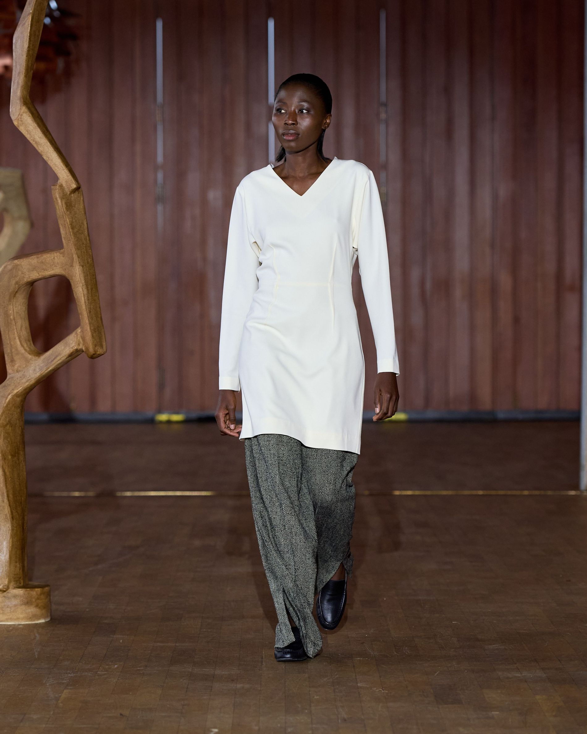 On the runway, this vision played out as a study in duality. Models – including influencer Emilia Silberg – moved between expressions of sharp masculinity and softened femininity. Bomber jackets, strict argyle knits, pristine white turtlenecks and precise double-pleated trousers gave way to silk dresses and blousy shirts, alongside skirts and dresses built from tightly packed frilled layers that, from a distance, recalled the texture of fur.