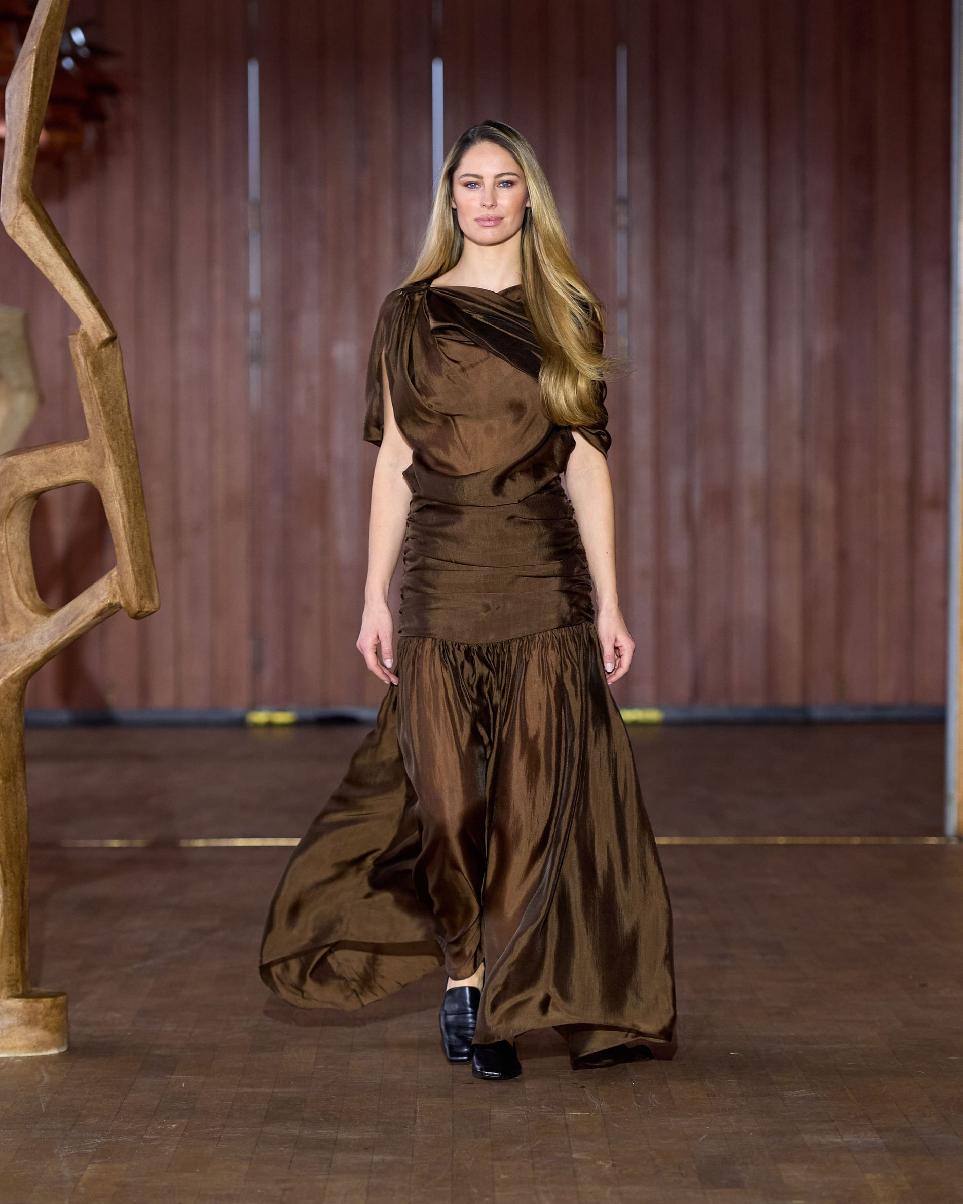 The colour palette was grounded and intentional. Navy and black anchored the collection, while ivory and warm toasted beige offered lift. Deep merlot and rich espresso tones added intimacy and depth, heightened through contrasts in texture: sleek silks and airy lace meeting structured wool, with moments of transparency pushing against solid form.