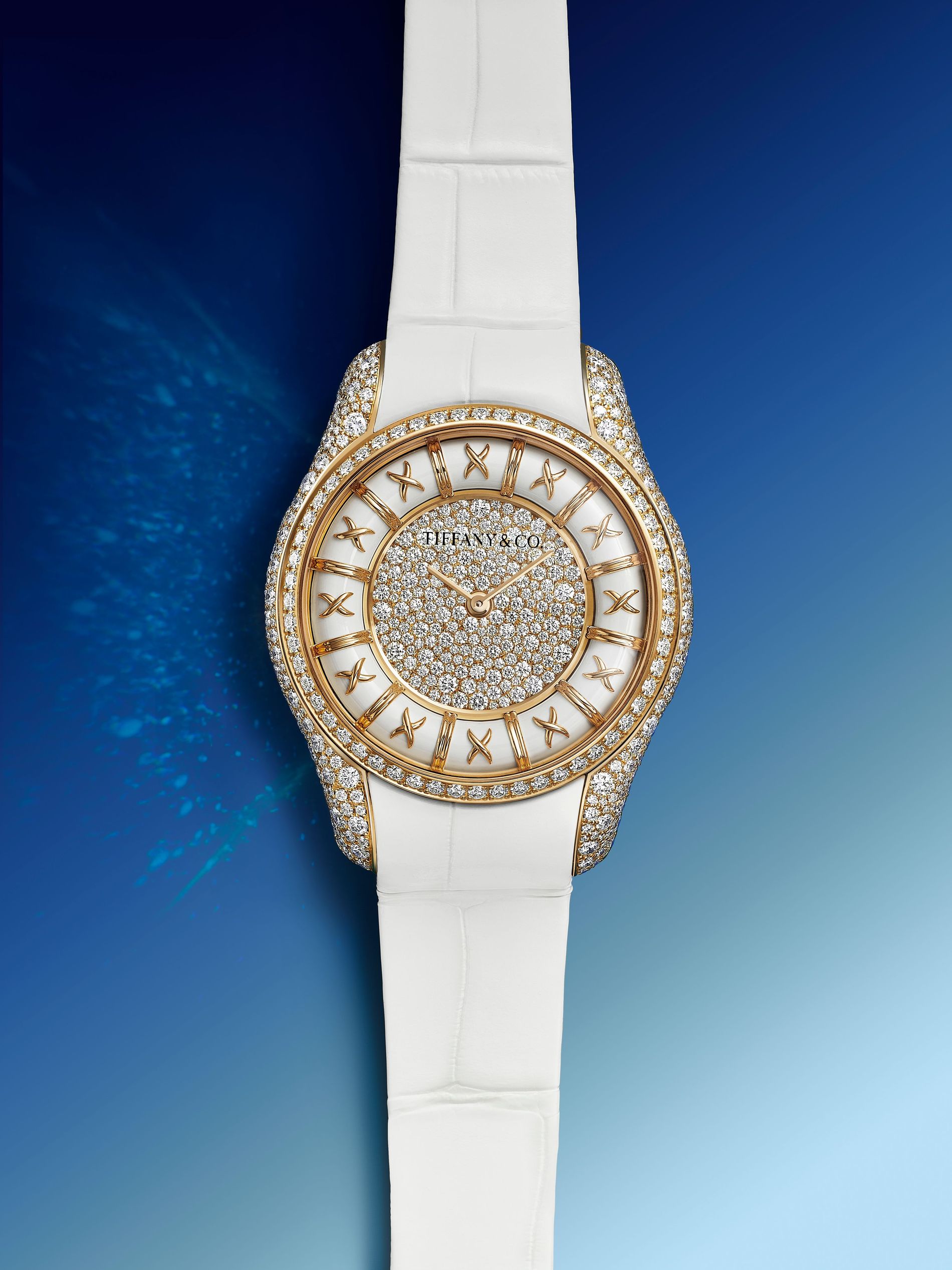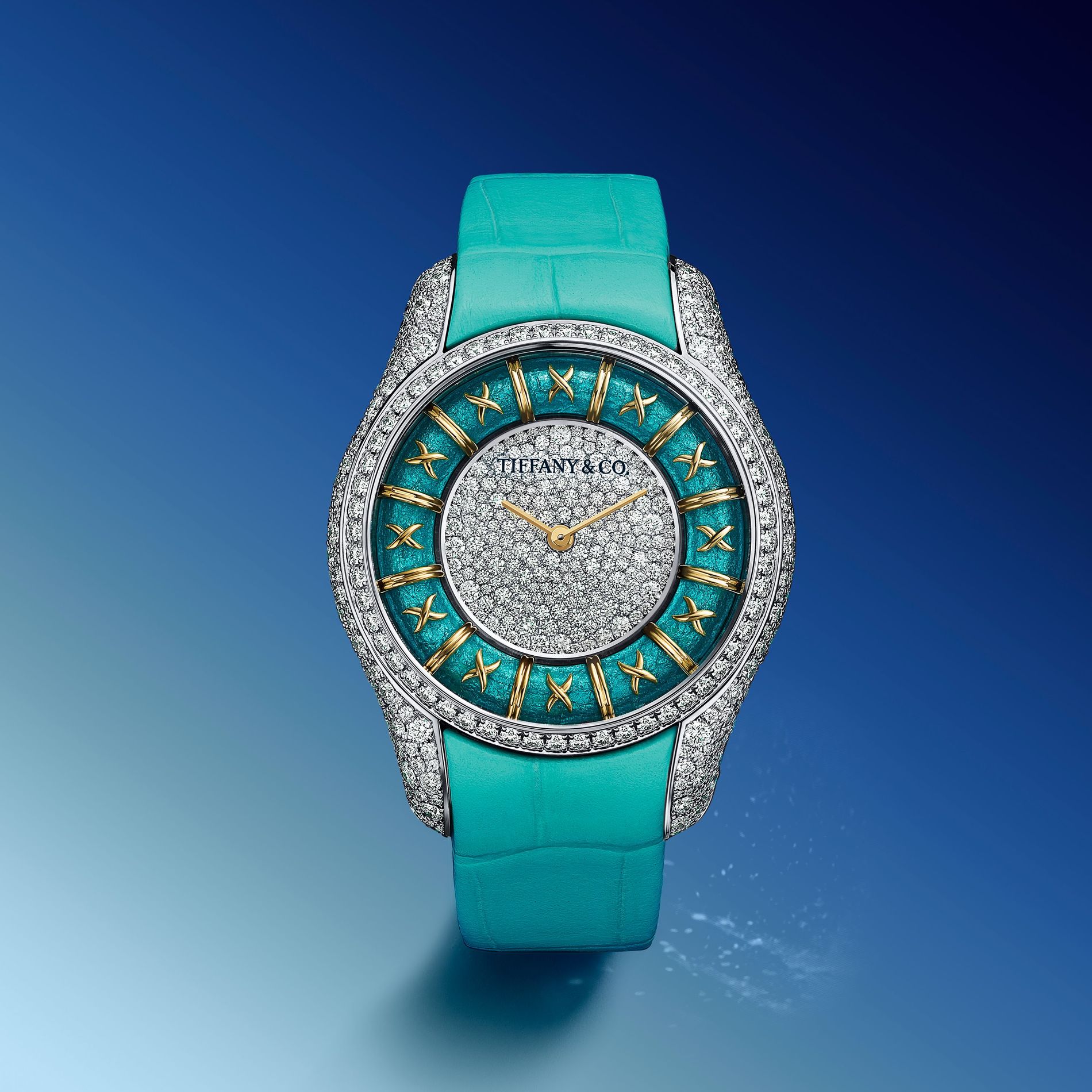 Two of these designs are presented on a refined leather strap, either in crisp white or the signature Tiffany & Co. blue, with the enamel ring colour-matched and set in white gand yellow gold respectively. The undisputed crowning jewel of the collection, however, is the high-jewellery model: a breathtaking 18k full-pavé white gold bracelet featuring an additional 666 diamonds, alongside the striking blue enamel ring.