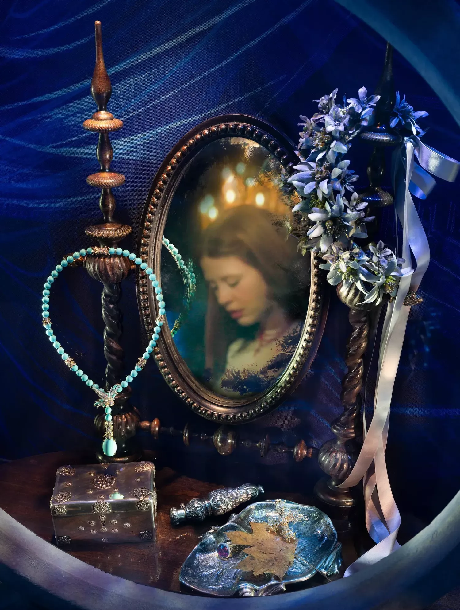 Outside Tiffany’s Fifth Avenue flagship, the narrative continues. To mark the premiere, the brand turned the windows into a theatrical homage to Frankenstein. Designed in collaboration with del Toro, each window reframes a pivotal scene: the barren Arctic landscape, Victor’s lightning-spiked tower, as well as Elizabeth’s world in objects displayed on her dressing table. Mia Goth’s likeness dominates one of the windows, as we see her reflection in the mirror. Young excitedly pointed out that she was the first actress to appear in a Tiffany window since Audrey Hepburn. Behind a magnifying glass, the Wade necklace appears like a prized artefact at the Natural History Museum. “The idea was to bring the magic of the movies to the sidewalks of New York,” Young said. It’s theatrical and a little kitschy, but also reverent.