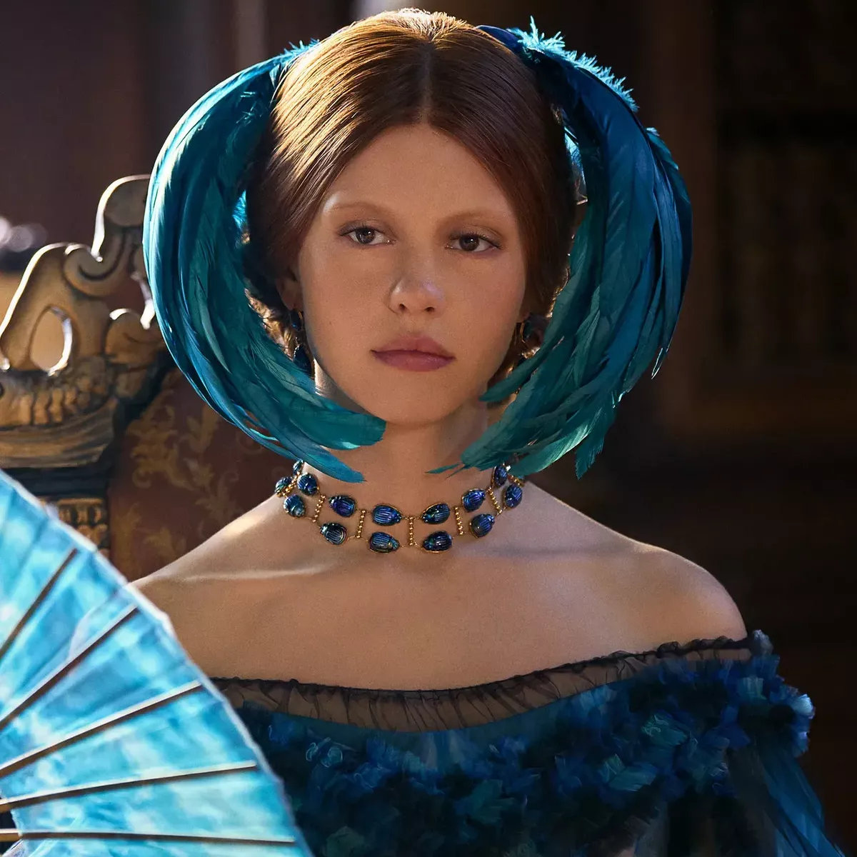 Mia Goth’s Elizabeth is a distinctly modern interpretation of Mary Shelley’s original character: intellectual and deeply connected to the natural world. One of the key pieces she wears is a 1914 necklace designed by Meta Overbeck, made of gold and set with Favrile glass scarabs. The pressed glass beetles were produced in Louis Comfort Tiffany’s glass furnace in Corona, Queens, in varying sizes and with a distinctive blue-green iridescence. First listed in Tiffany’s Blue Book in 1909, this type of Favrile beetle jewellery appeared in a range of forms through 1914. This is the first time the necklace has been worn in a contemporary context, and it appears prominently throughout the film. “You even see her in the film, making a watercolour of a beetle that’s crawling on her hand,” Young explained.