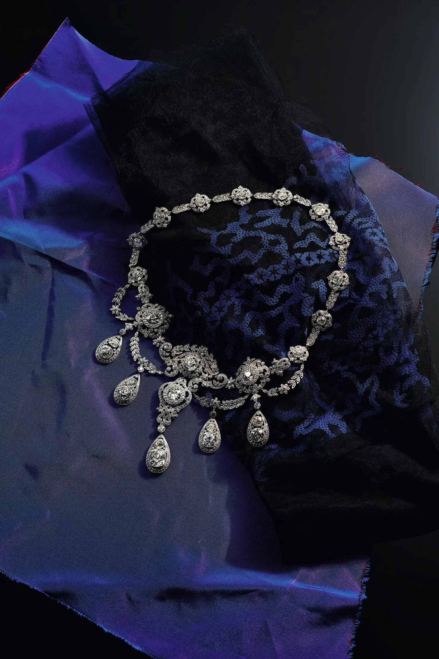 A quintessential example of Tiffany’s garland style, the necklace is defined by its platinum craftsmanship and floral motifs, with diamonds set in fine millegrain settings that lend it a lace-like delicacy that was typical of the period. Crafted more than 125 years ago, it also reflects a moment of technological transformation, made possible by the invention of the acetylene torch, which allowed artisans to manipulate platinum with unprecedented precision.