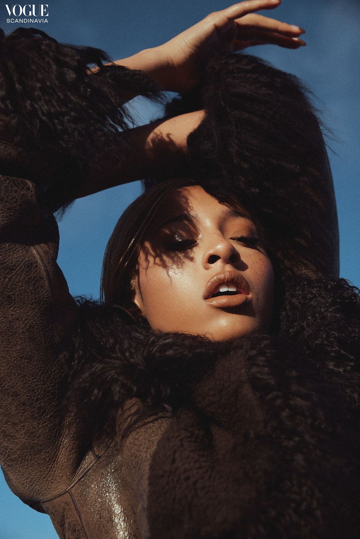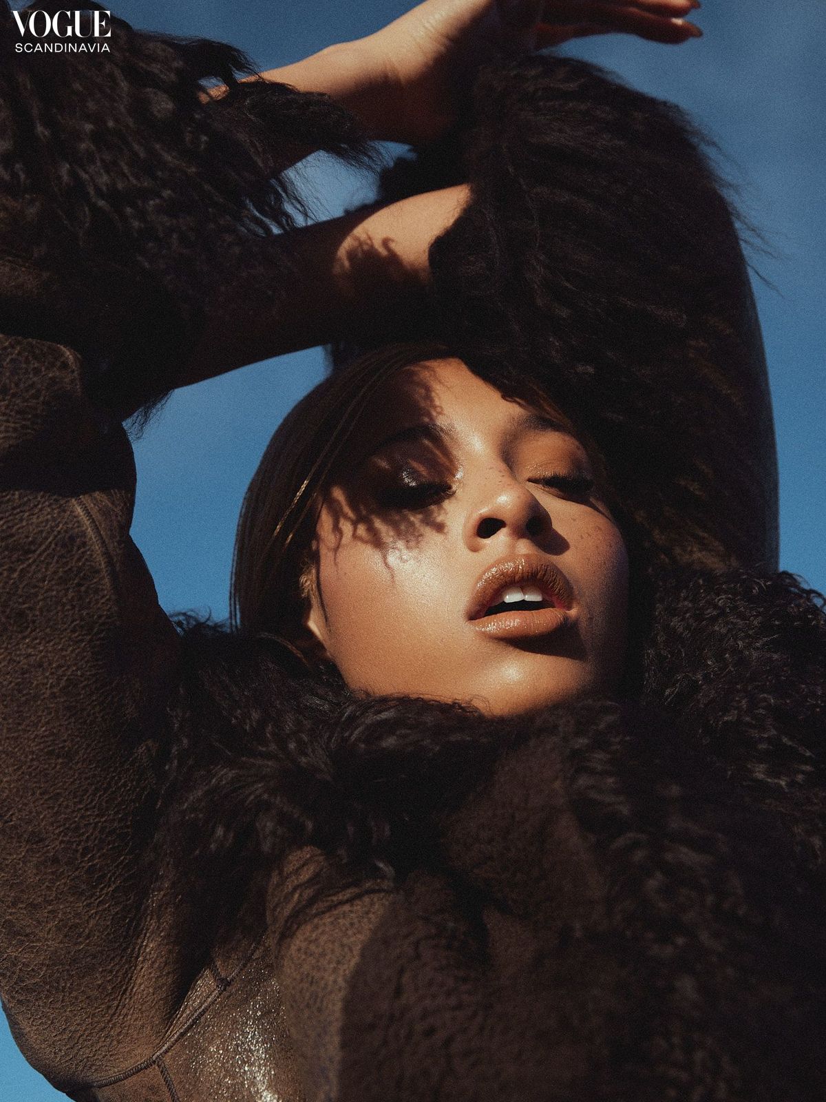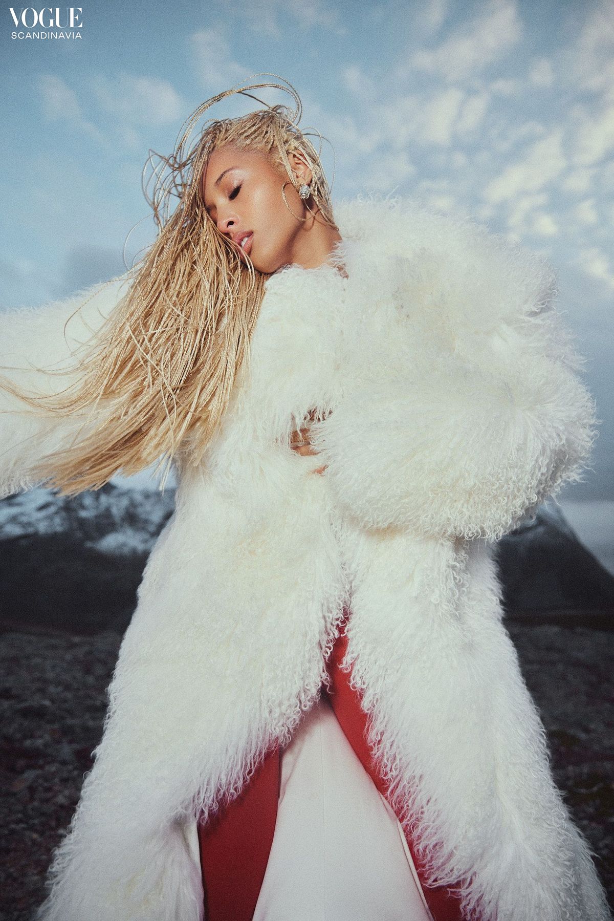 Describing herself as an “Afro-Scandinavian pop girlie”, Tolou creates music that merges the warmth of Africa with the cool pop sensibilities of Norway. Shearling coat, €2,330. Saks Potts. Photo: Ole Martin Halvorsen