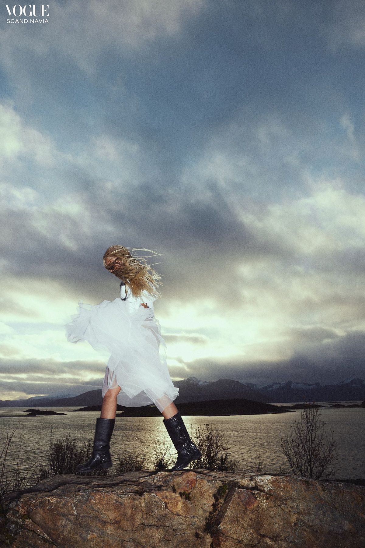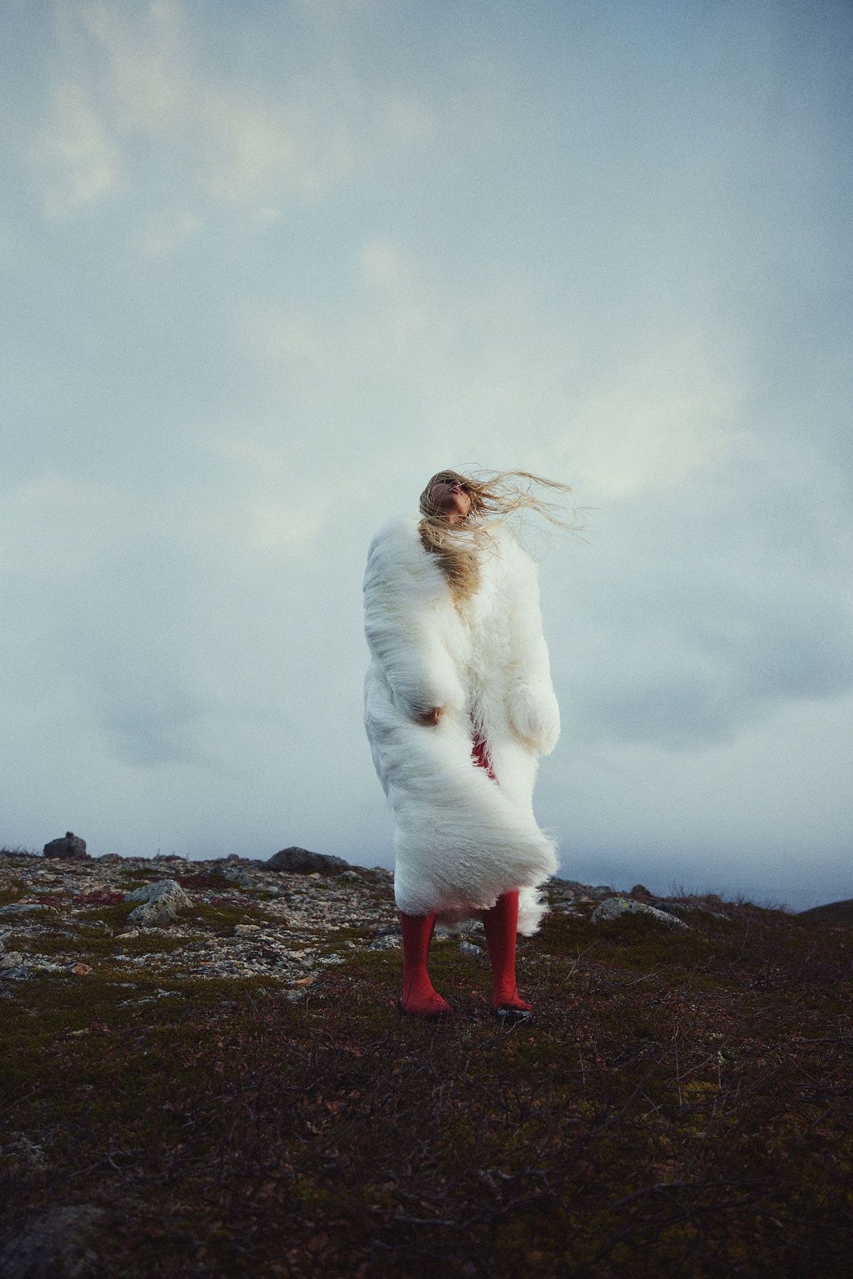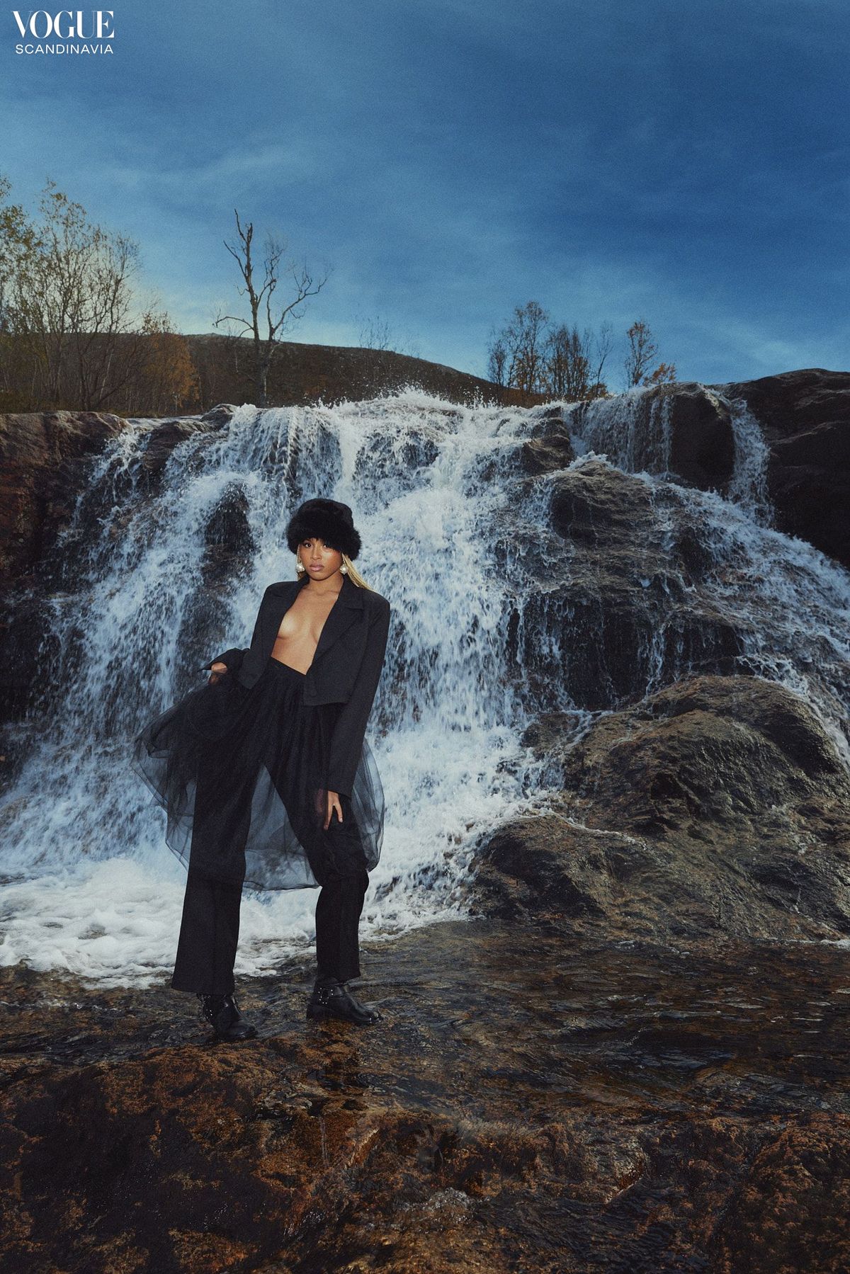 As she continues to find a more global audience, she still returns to Tromsø so her mother can do her hair (which doubles as a great excuse to spend hours together as mother and daughter). Suit jacket, €175, Trousers, €146. Both Cras. Tulle skirt. Stylist’s own. Vintage bucket hat. Pearl pendant earrings, €210. Pearl Octopuss.y. Vintage moto boots. Photo: Ole Martin Halvorsen