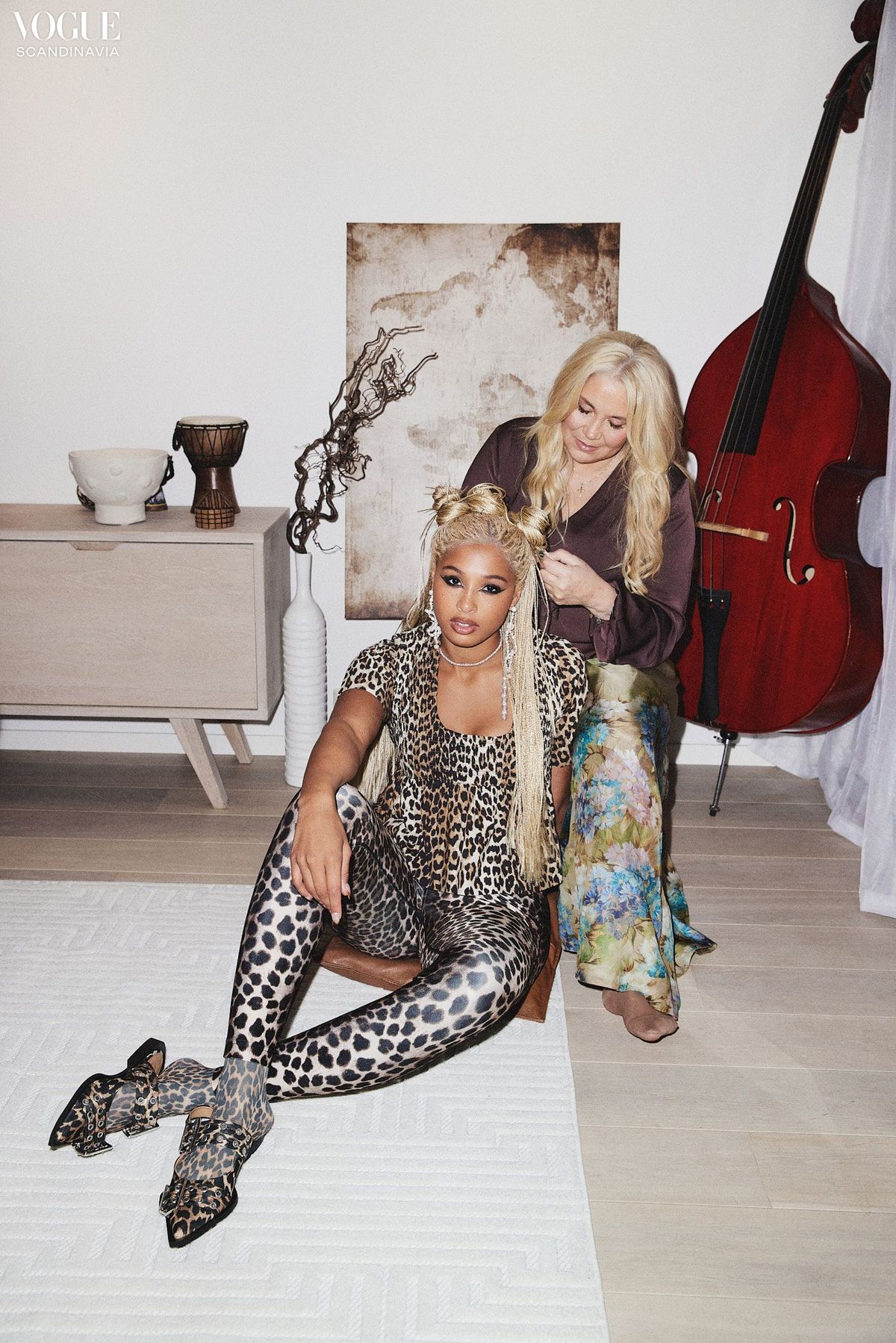 Tolou’s Norwegian mother, Cathrine Kjeldsberg, learned how to do microbraids from her African girlfriends in London. She does her daughter’s hair to this day. Tolou wears Leopard printed top, €140. Ganni. Leopard printed leggings, €75. Cras. Crystal earrings, €300, Crystal tennis choker, €315. Both Pearl Octopuss.y. Cathrine wears Vintage blouse. Floral printed skirt, €385. byTiMo. Photo: Ole Martin Halvorsen