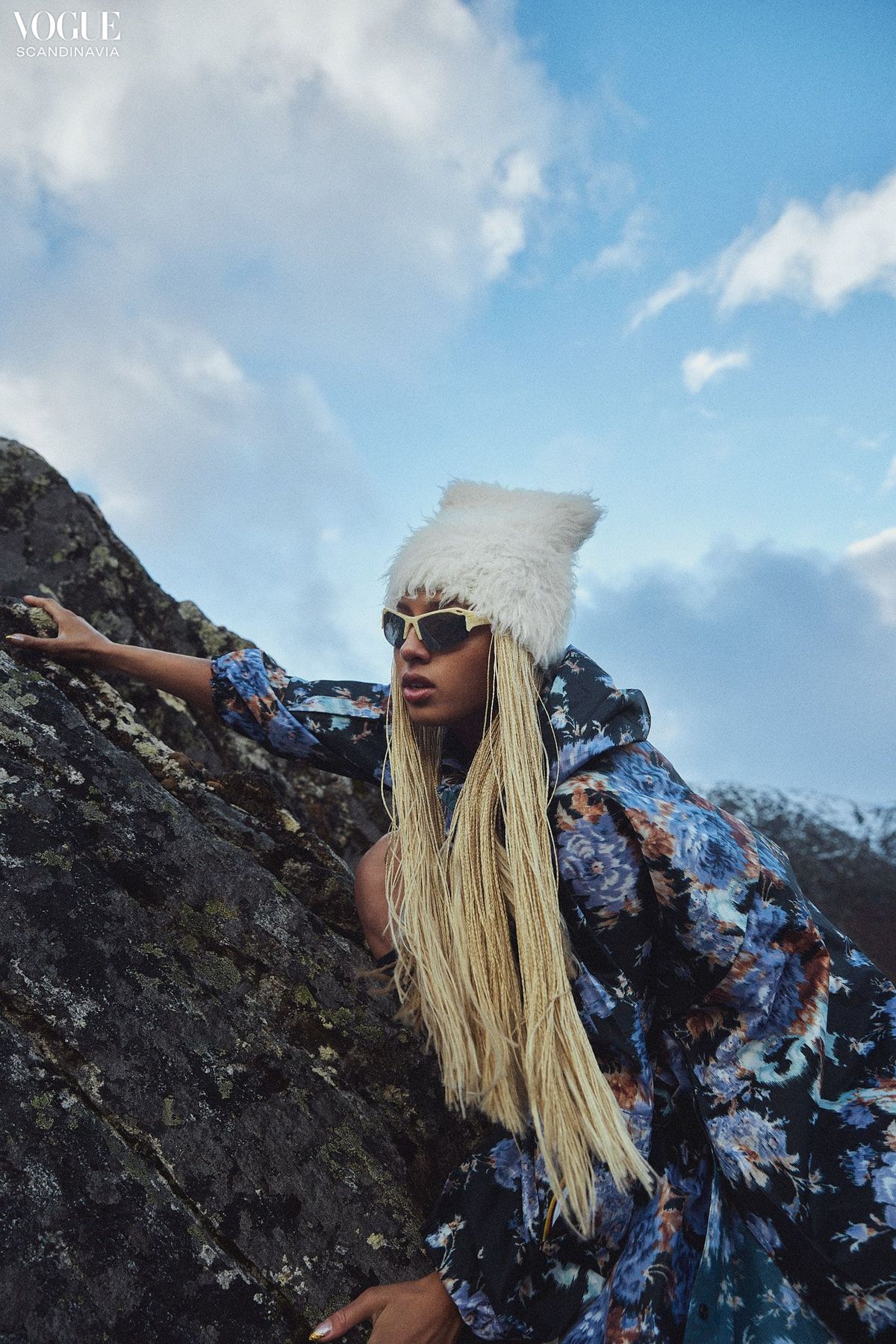 Printed jacket, €569. Ulla Johnson. Fluffy hat, €200. Acne Studios. Sunglasses, €165. Holzweiler. Photo: Ole Martin Halvorsen