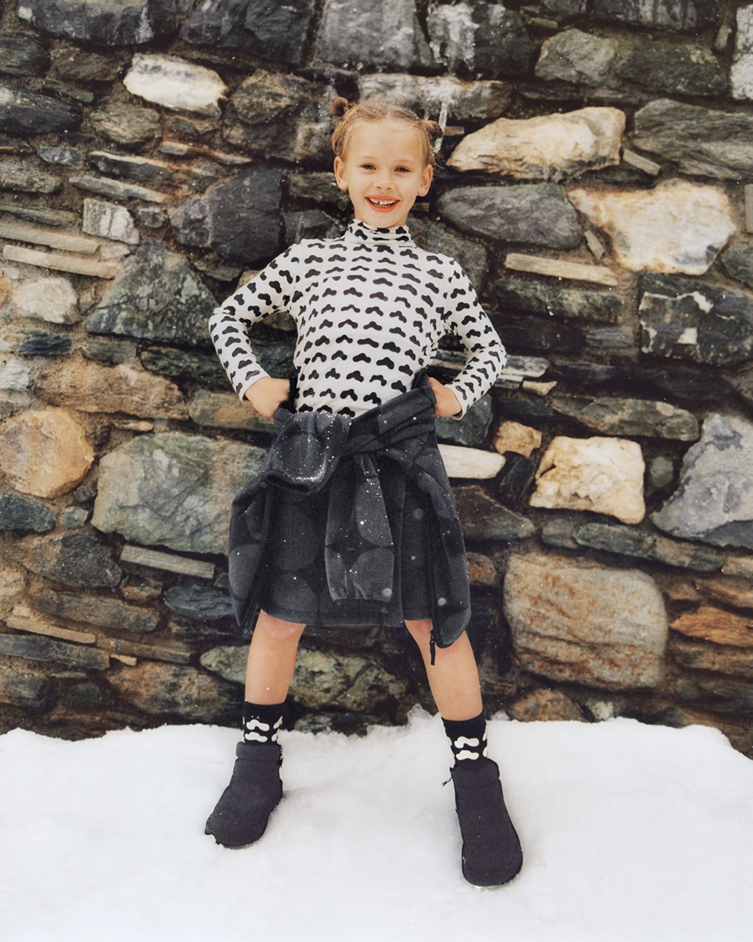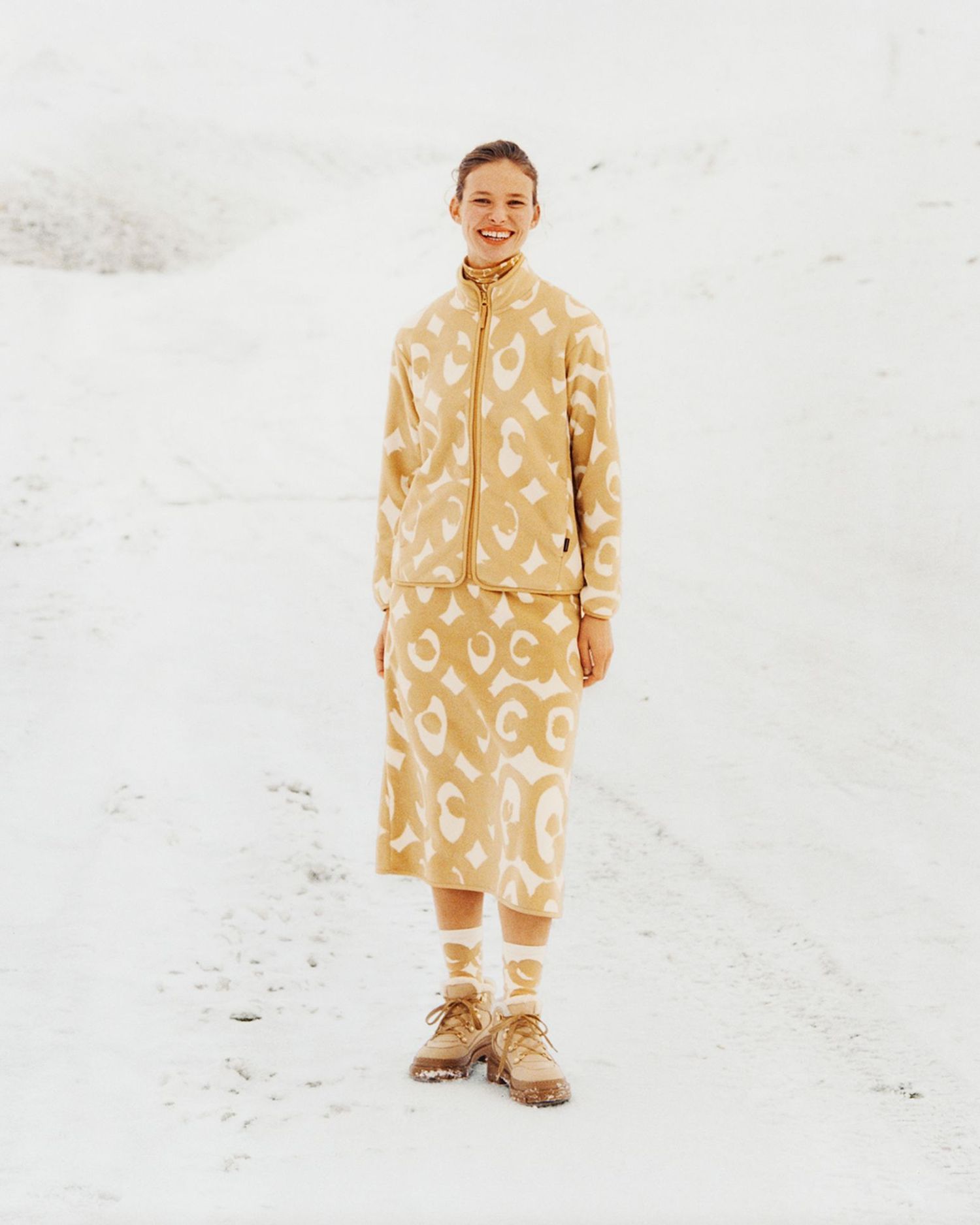 Unlike the duo’s previous collaborations, the New Year’s collection boasts a more earth-toned palette of beiges, whites, blacks, and greys, reflecting nature’s calming and serene hues during this season. The capsule’s aptly chosen Marimekko prints feature three Maija Isola classics: Kivet (Stones), Kissapöllö (Tawny Owl) and Seireeni (Siren), which all take their cues from our magical environment. The fourth print, Hattara (Wisp), comes courtesy of acclaimed fashion designer Pentti Rinta, drawing inspiration from nostalgic cotton candy clouds.
