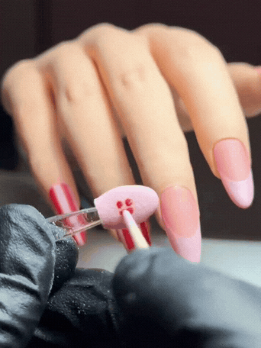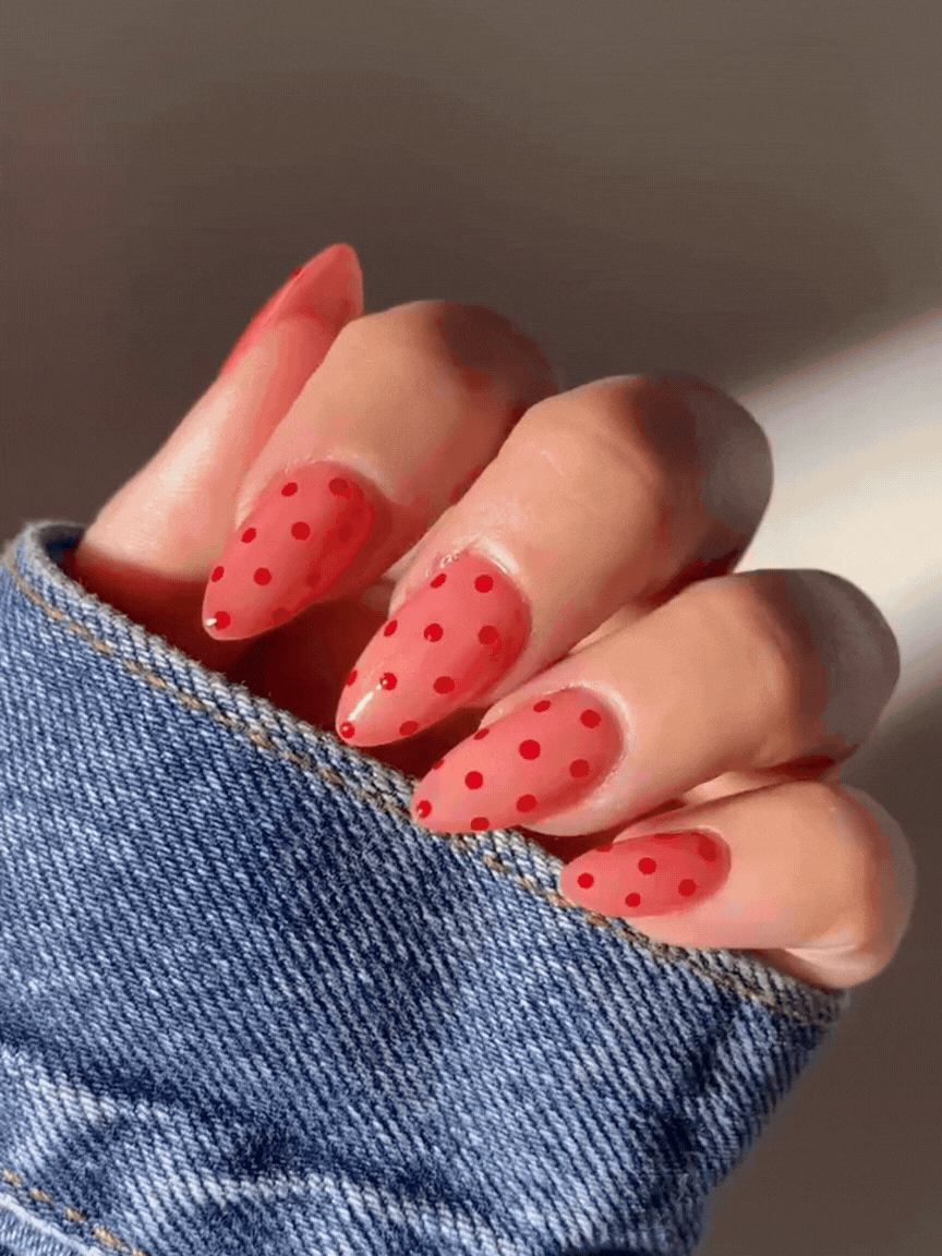 For a seasonal look, dainty dotwork is always a stylish choice. Our recommendation for Valentine's Day is a sheer red base complemented by opaque dots on top. This subtle approach ensures the manicure sustains even if it extends beyond February 14th.