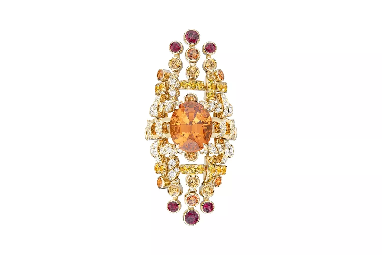 The Tweed Gabrielle ring in yellow gold, platinum, diamonds, yellow sapphires and spessartite garnets.